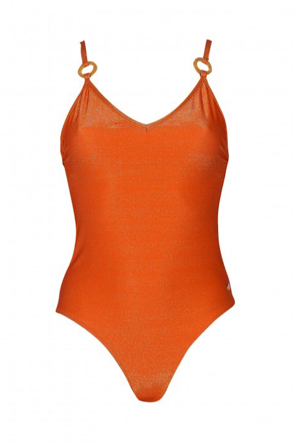Bañador de lurex en tono naranja con aros de nácar de resina reciclada en los tirantes. Los aros hacen un efecto tornasolado muy favorecedor.