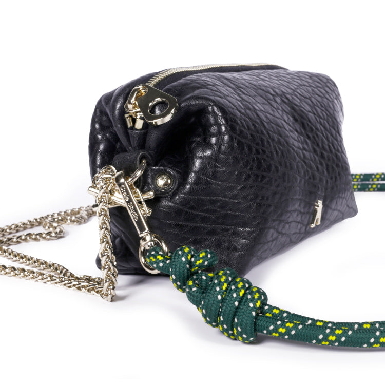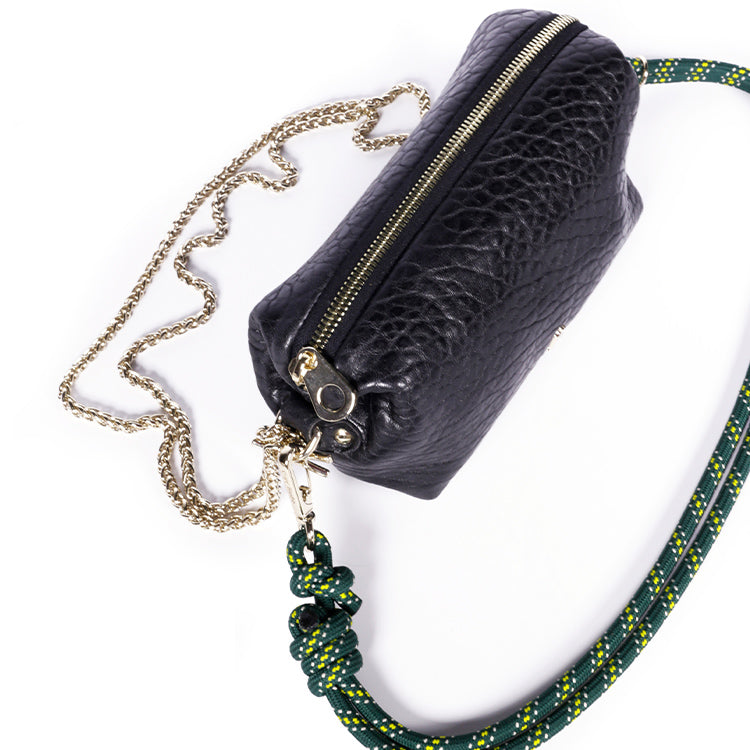 Viene con dos correas de hombro extraíbles para variar los estilos: una cadena dorada para un aspecto elegante y una cuerda de escalada High Tennis para un toque más gráfico y relajado. Personalmente me gusta llevarlo con las dos juntas.