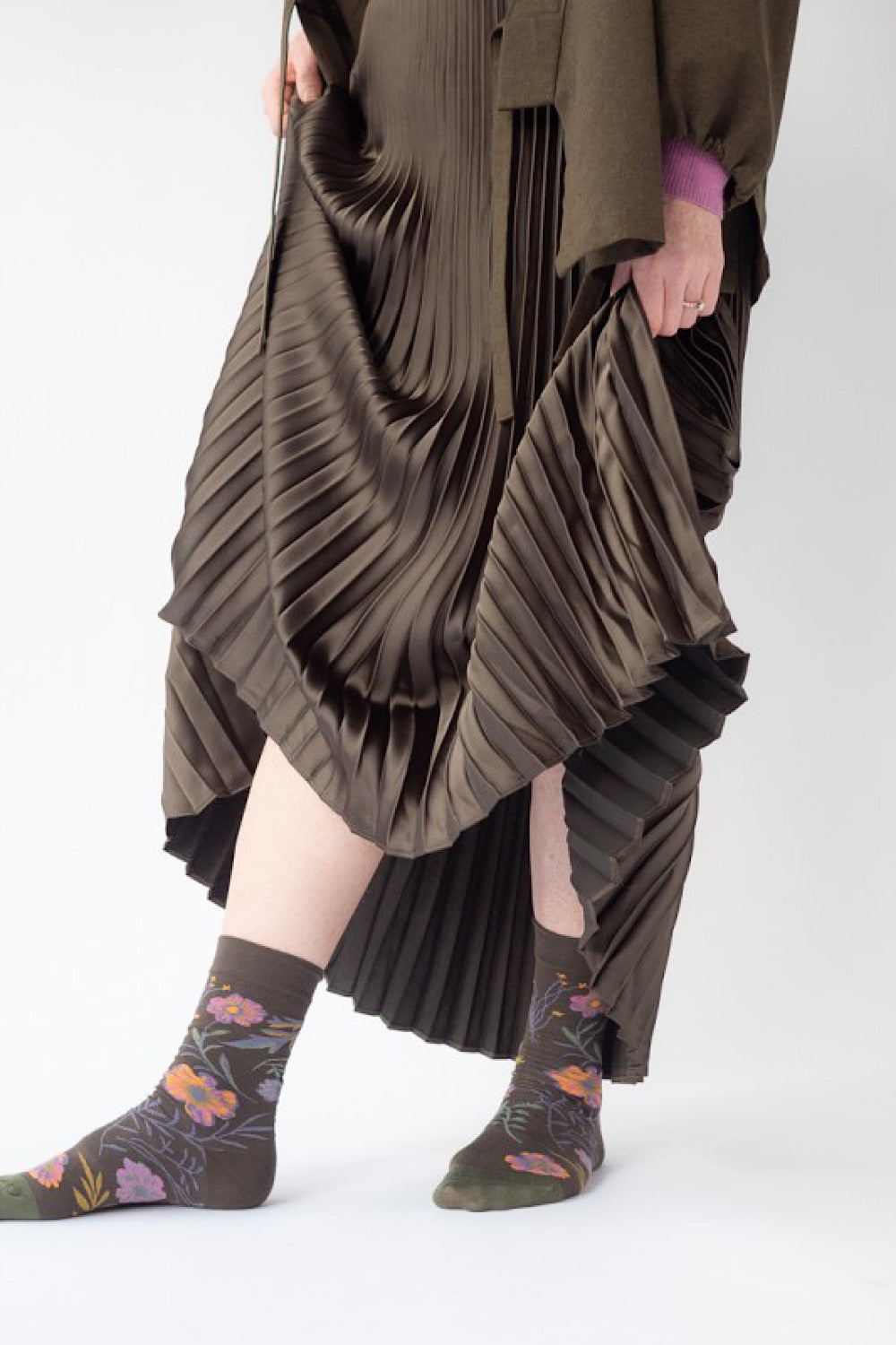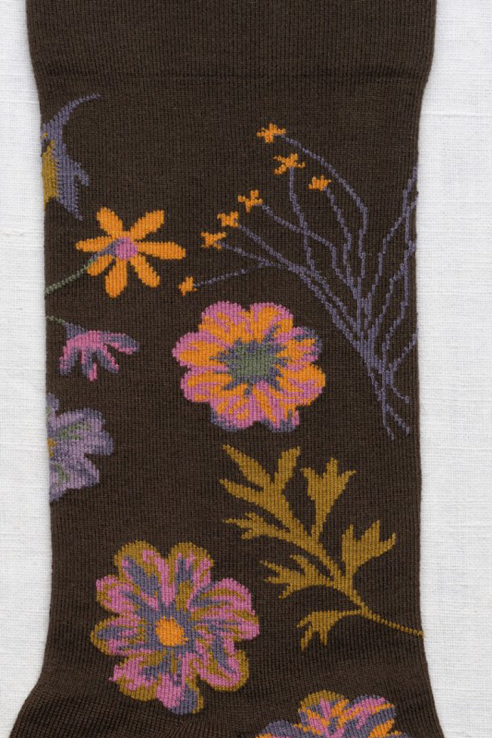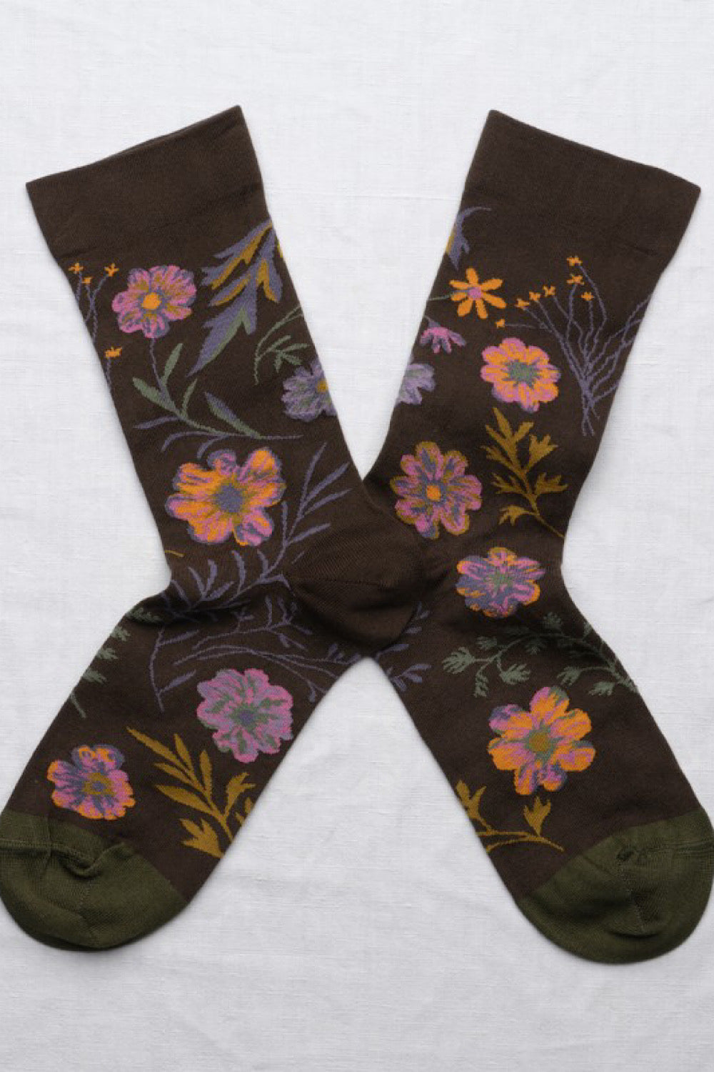 Estos calcetines cuentan con un diseño encantador de flores en tonos morados, naranjas y verdes, sobre un fondo marrón profundo. La combinación de colores crea una pieza única y alegre, perfecta para añadir un toque floral a tu look.
