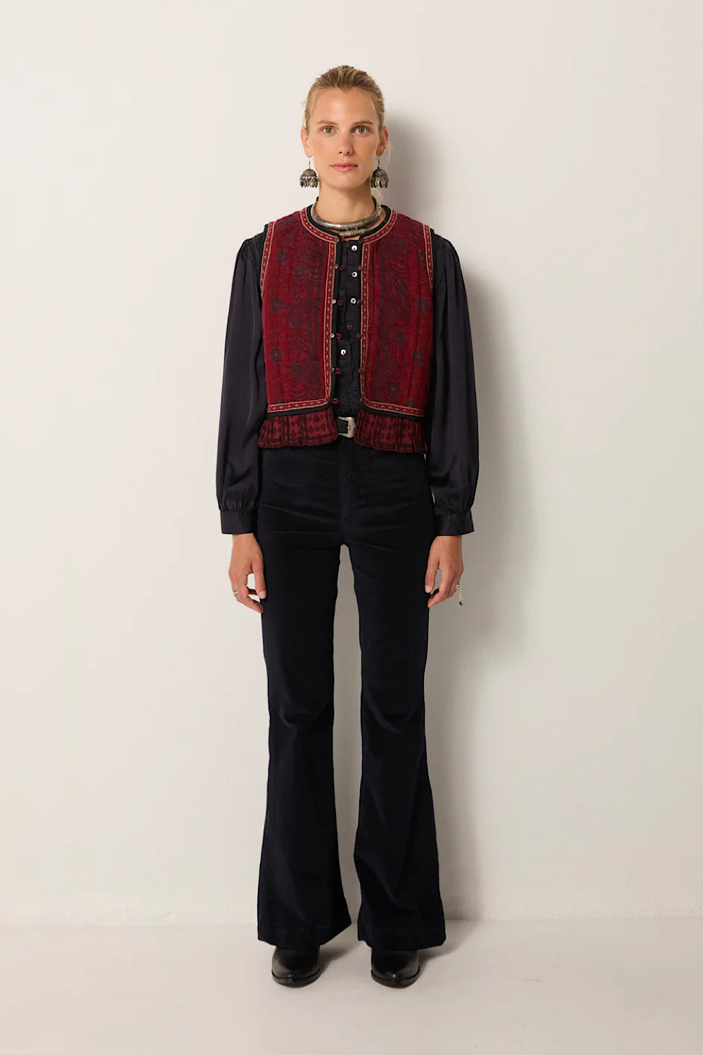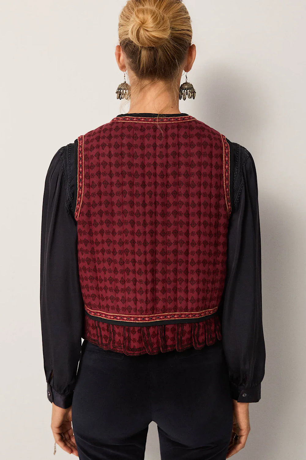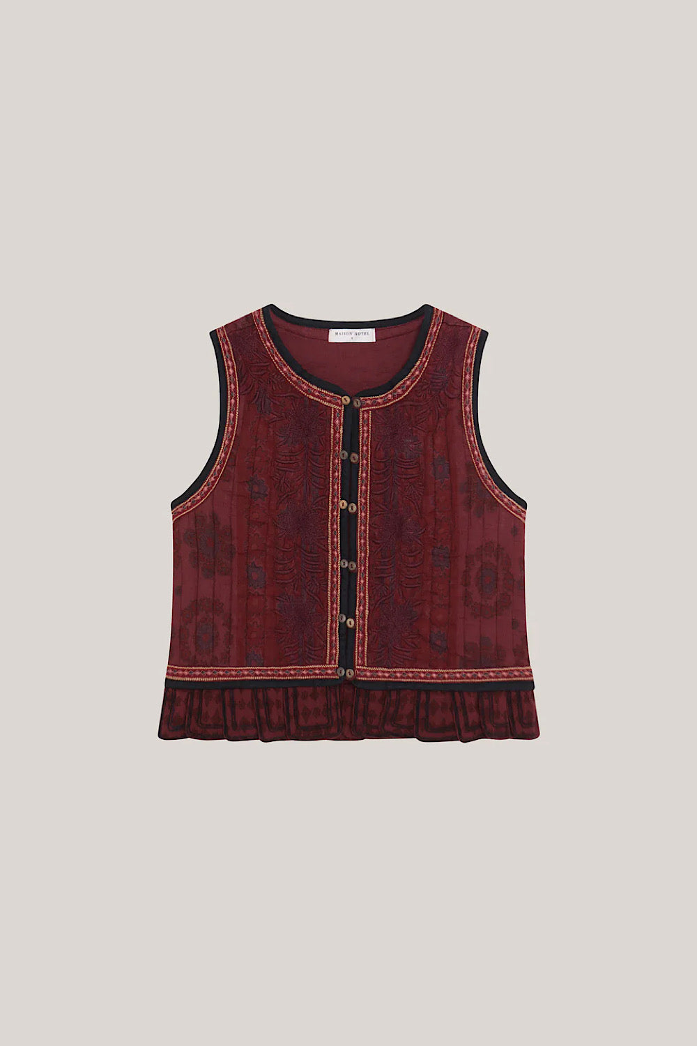 Un chaleco ideal, siempre son las prendas estrella de Maison Hotel. En un color burdeos súper favorecedor y tendencia. Detalle de mini volante en la parte inferior que le da un toque muy especial a la prenda.