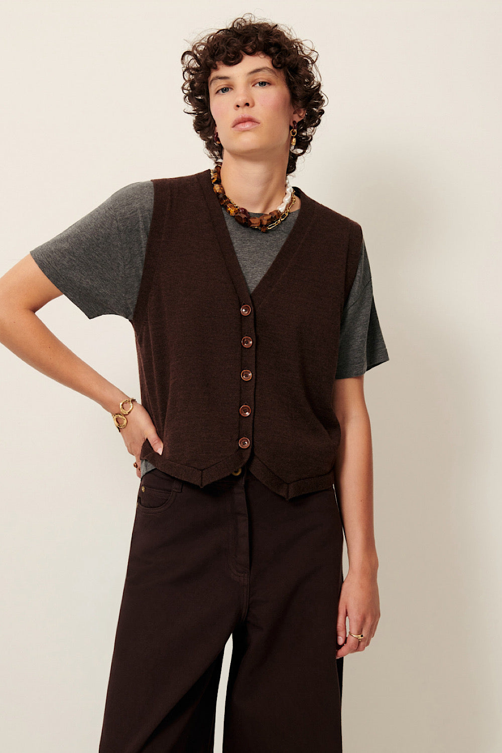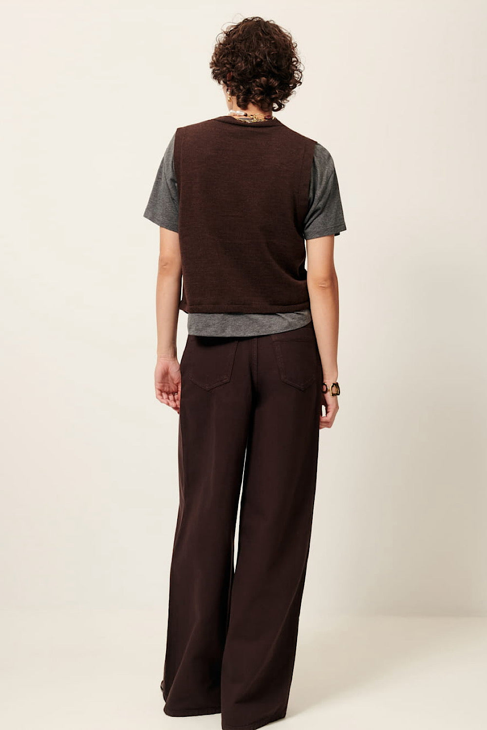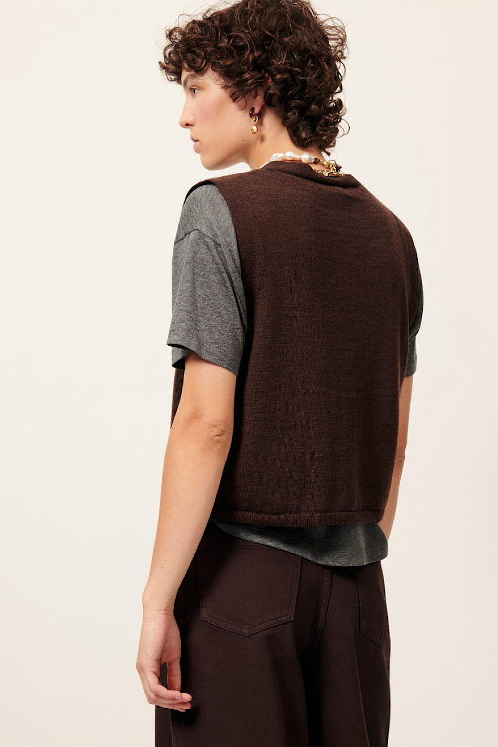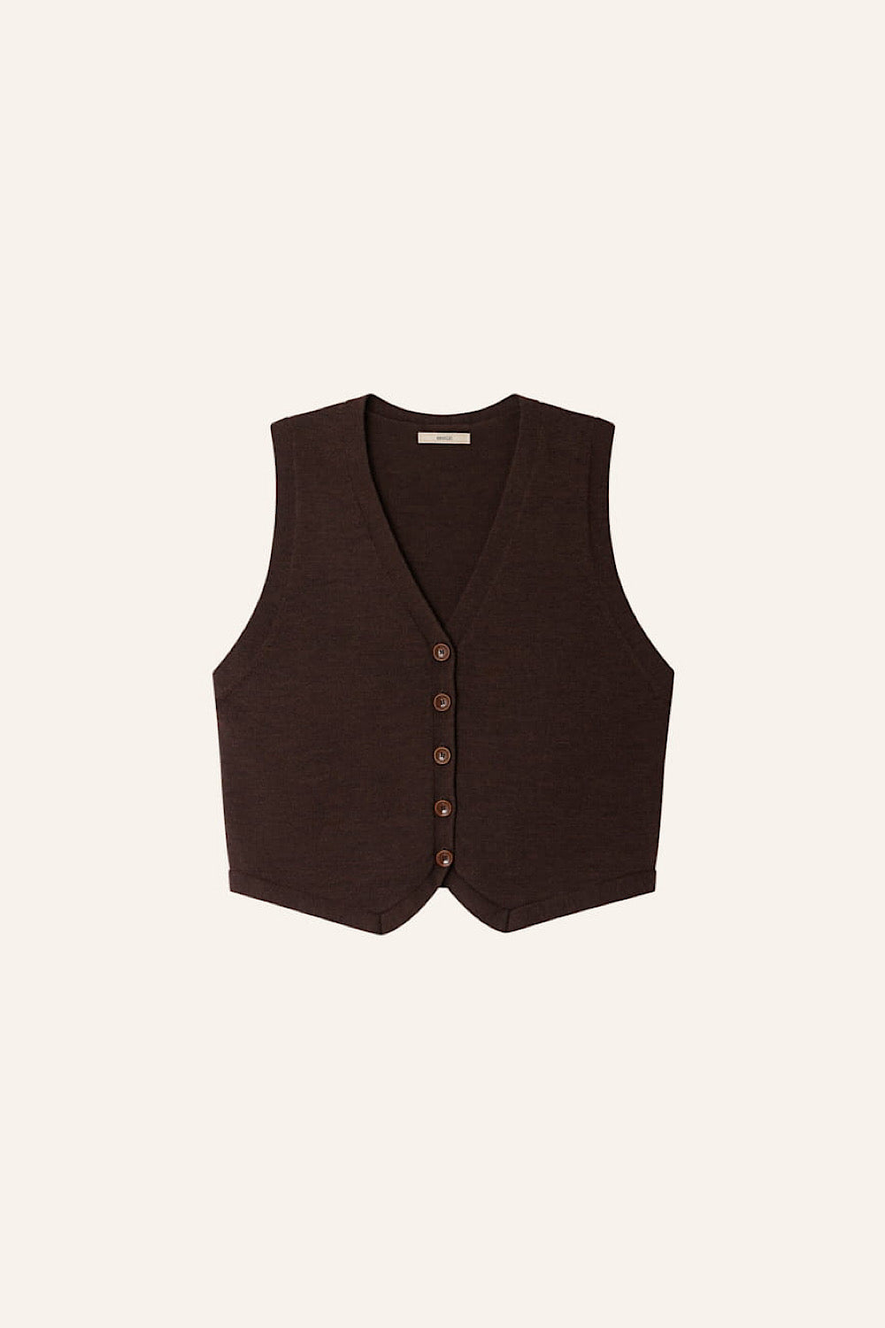 Chaleco de punto en color chocolate, súper tendencia y muy favorecedor. Una prenda que no puede faltar en tu armario.