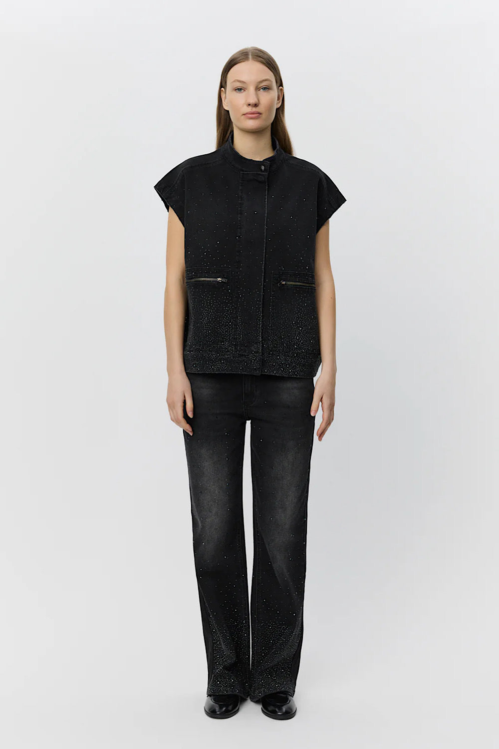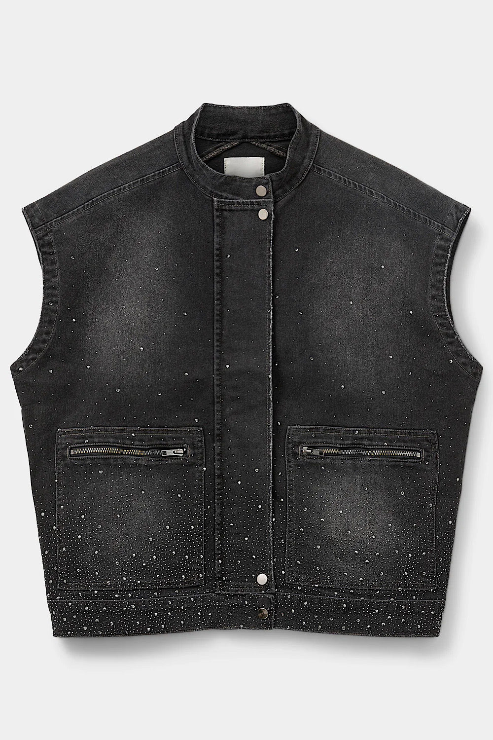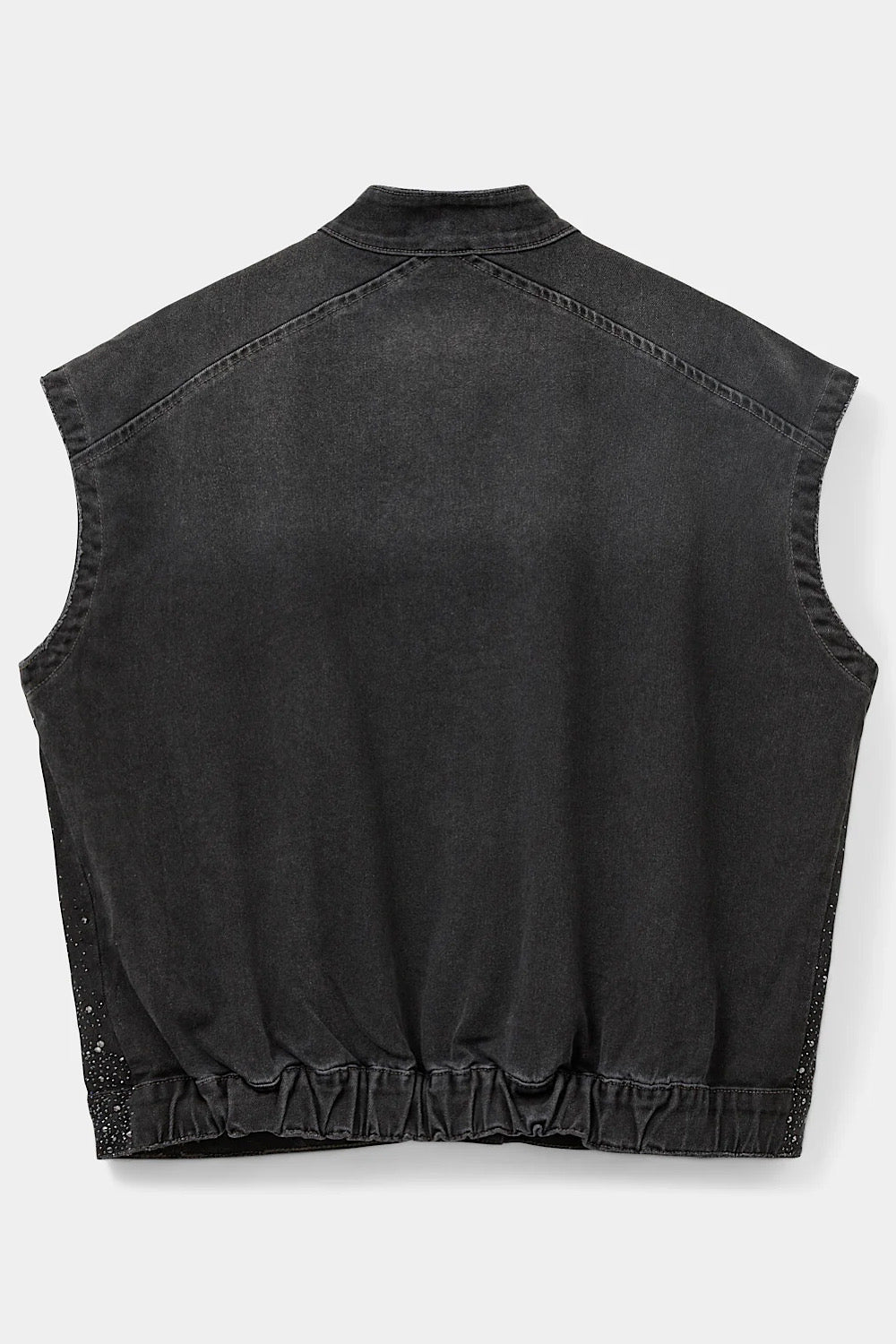 Chaleco en tejido vaquero negro desgastado, con detalle de cristalitos que3 le dan un toque muy especial a la prenda.