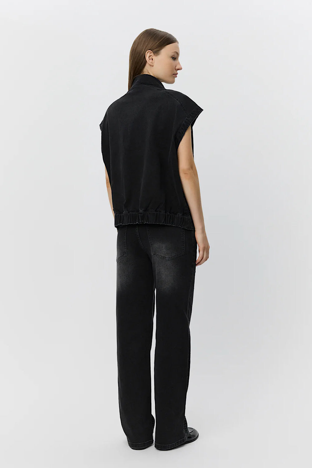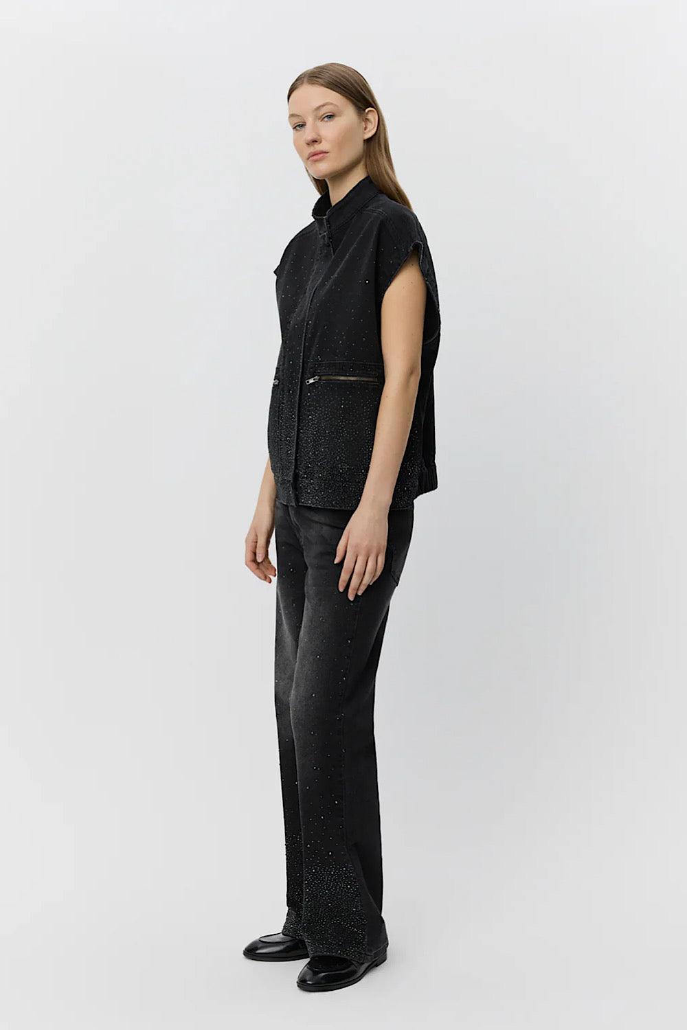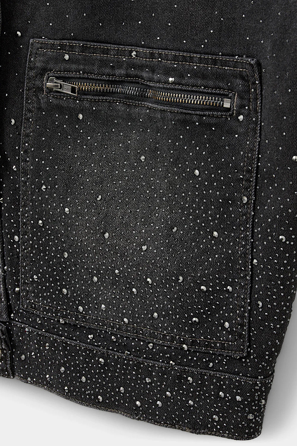 Chaleco en tejido vaquero negro desgastado, con detalle de cristalitos que3 le dan un toque muy especial a la prenda.