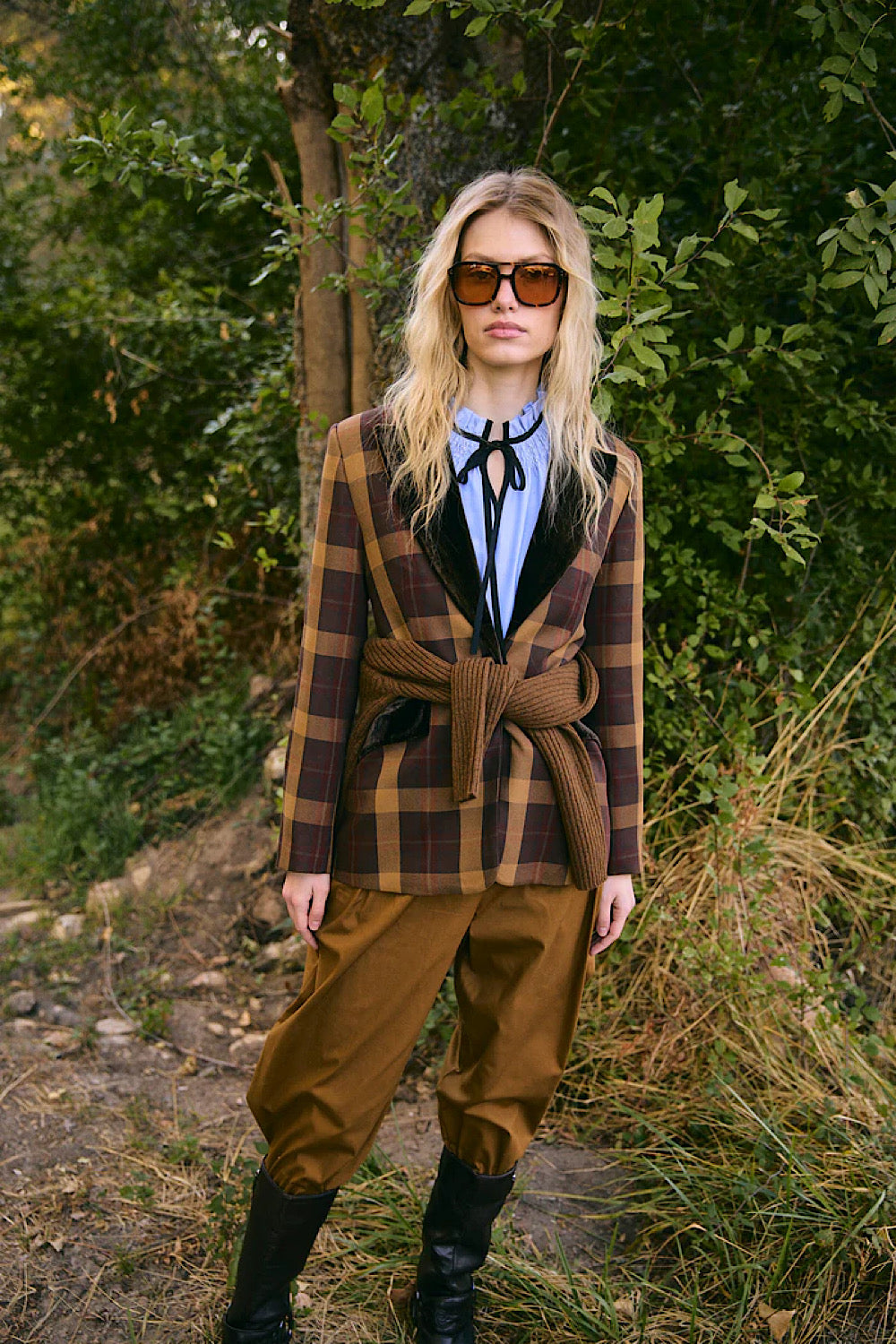 Blazer entallada de cuadros en tonos marrón y mostaza. Tiene solapas anchas y bolsillos con detalle de terciopelo marrón. Puedes hacer un total look con el pantalón a juego o llevarla a modo de blazer y crear tus propios looks, ya que es una prenda muy versátil.