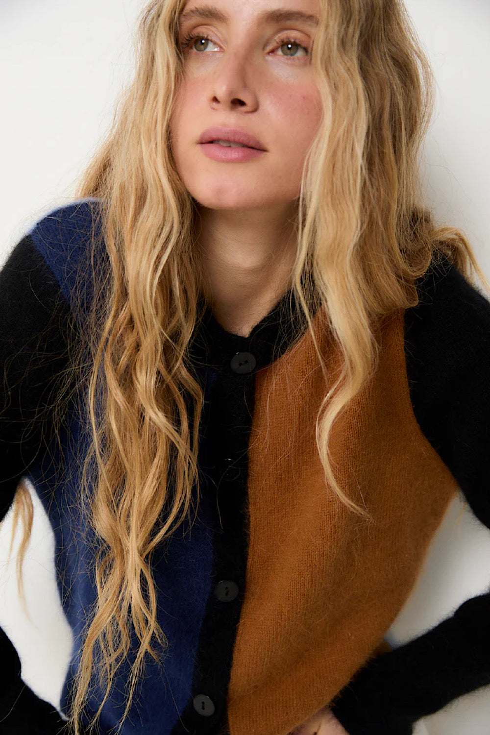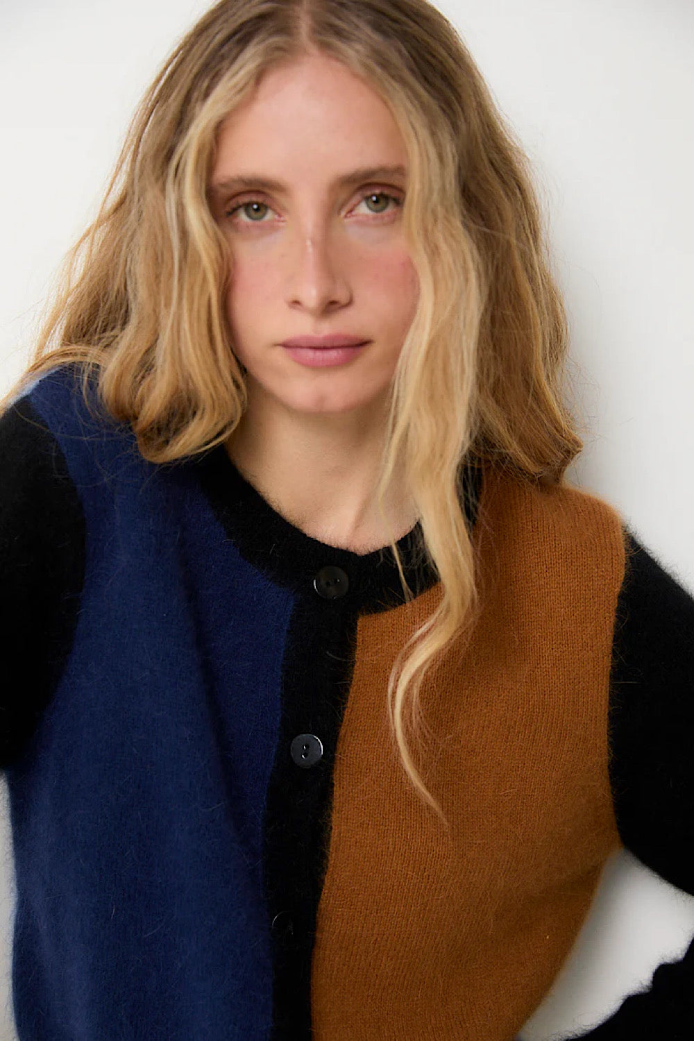 Chaqueta de punto de Sophie and Lucie, bicolor en azul y marrón y mangas combinadas en negro. Una prenda muy especial que puedes llevar abierta o cerrada a modo de jersey.