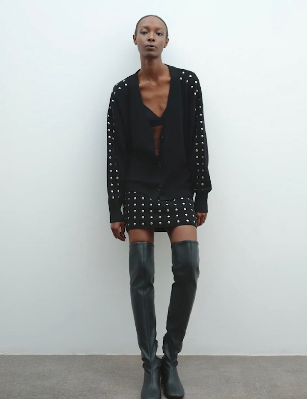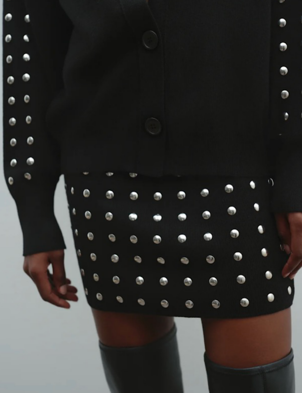 Mini falda de punto con detalle de tachuelas que le dan un toque muy especial a la prenda, femenina y a la vez con mucho carácter. Combínala con una camisa o un maxi jersey. Elige la camisa Barni con tachuelas también para un total look muy especial.