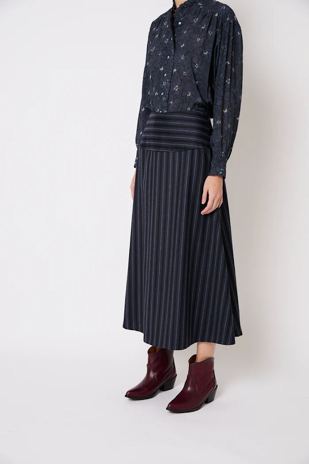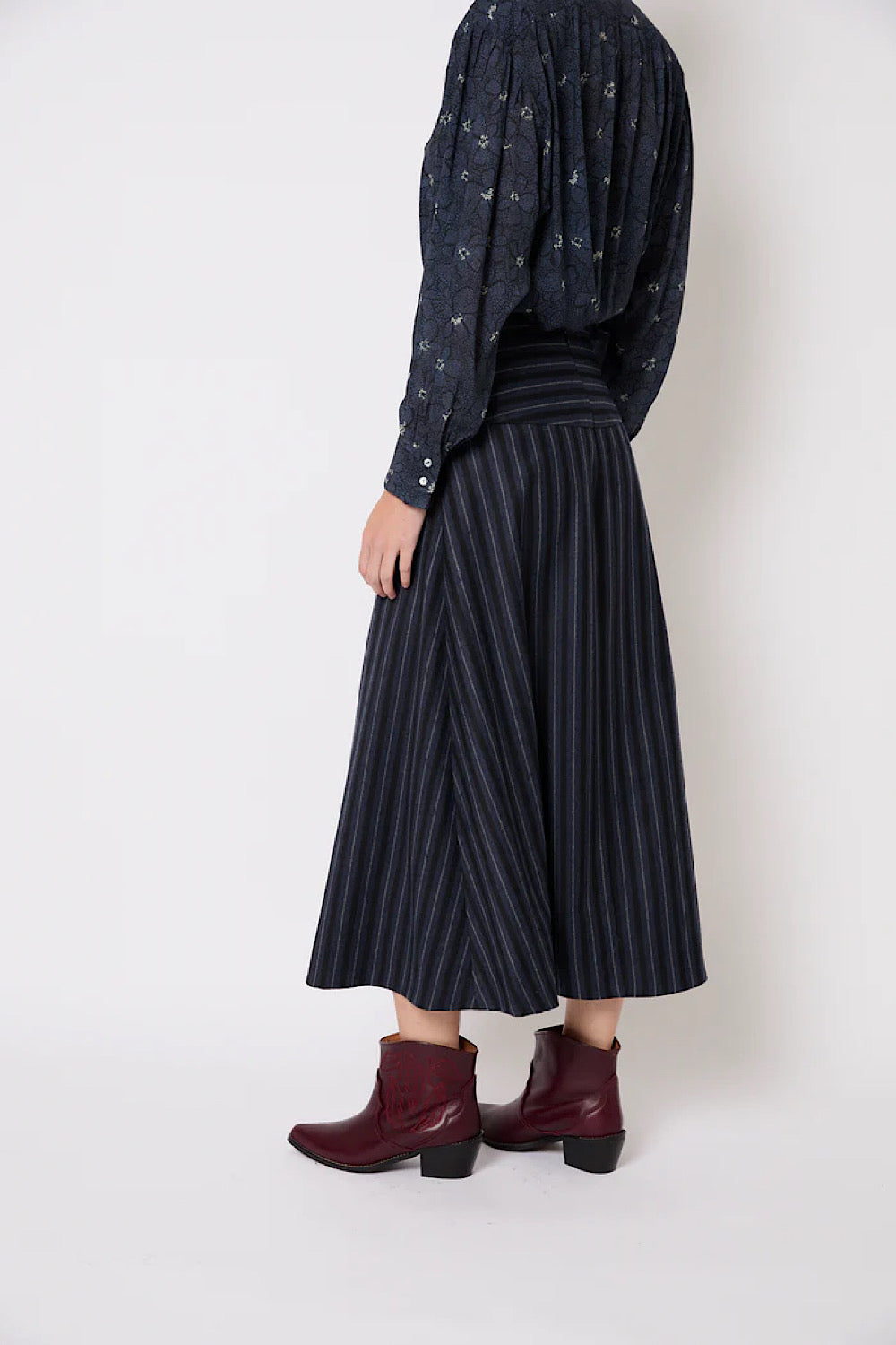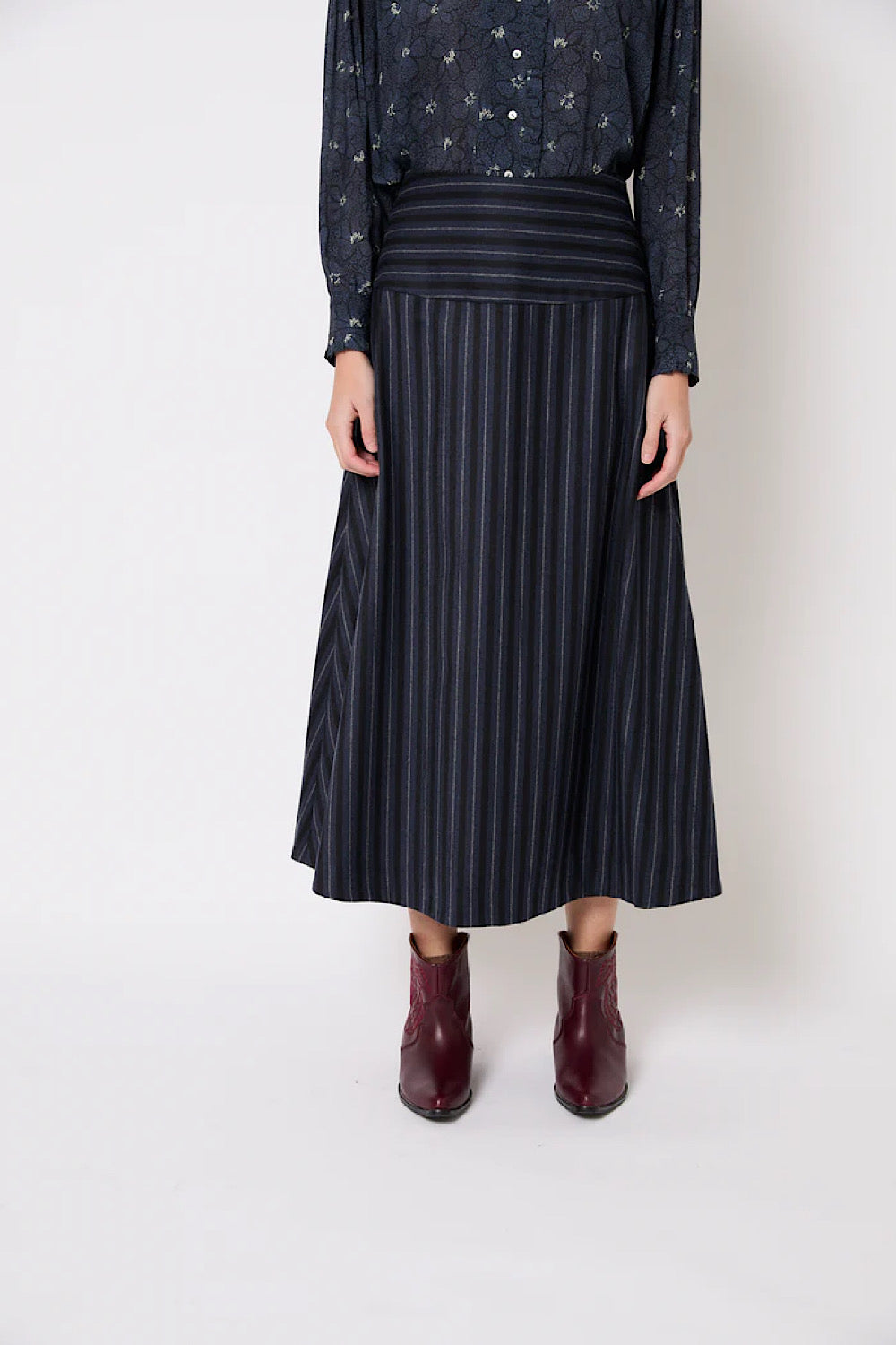 Esta falda midi tiene un corte evasé y un estampado de rayas en tonos azules. La cintura es ancha y con las rayas en horizontal, lo que marca la figura. Es ligera, con buena caída, y fácil de combinar tanto para looks de diario como más arreglados.