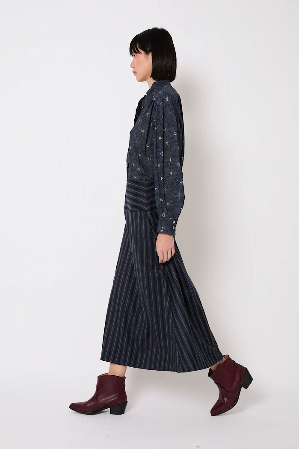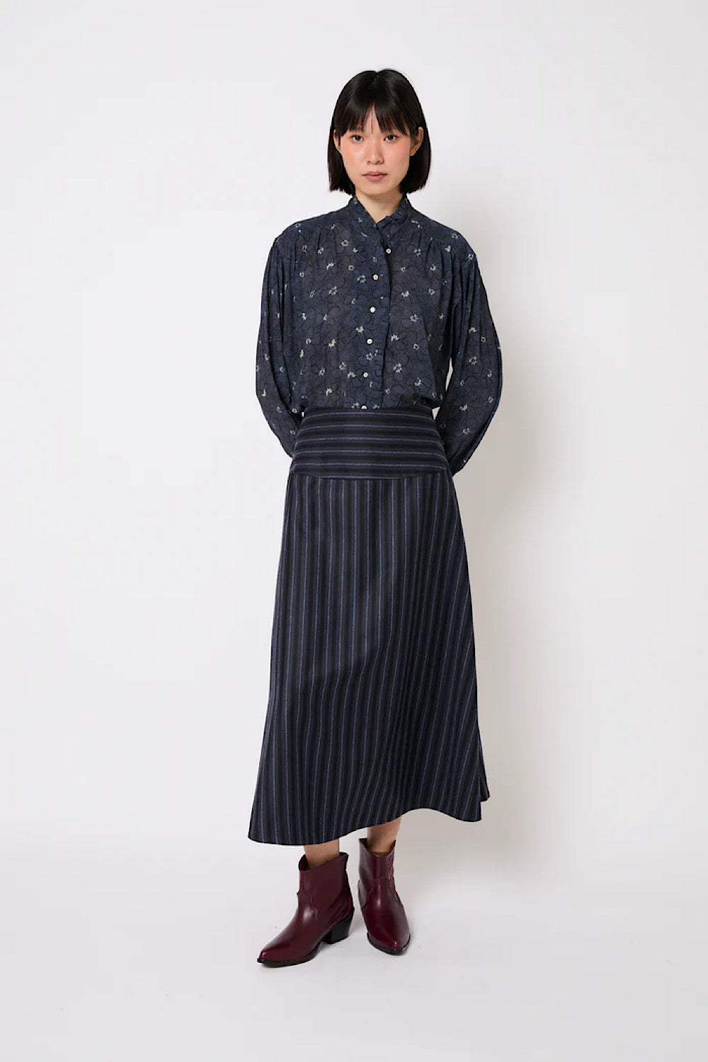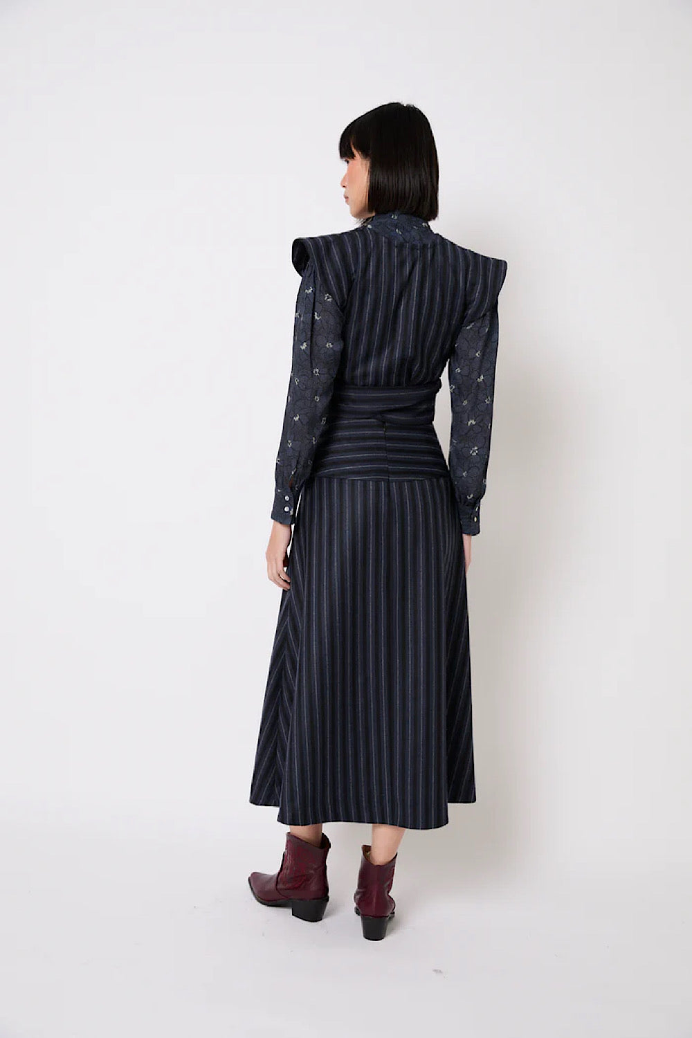 Esta falda midi tiene un corte evasé y un estampado de rayas en tonos azules. La cintura es ancha y con las rayas en horizontal, lo que marca la figura. Es ligera, con buena caída, y fácil de combinar tanto para looks de diario como más arreglados.