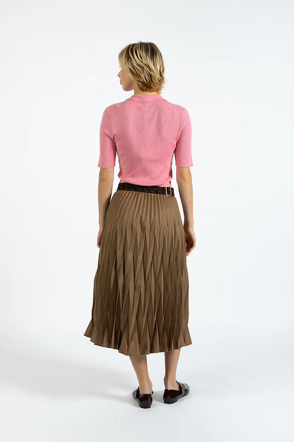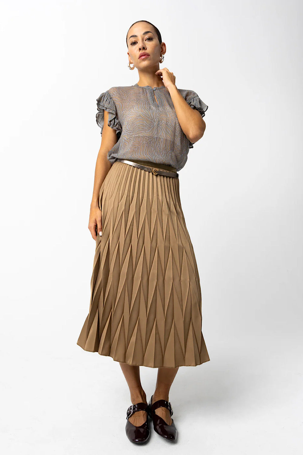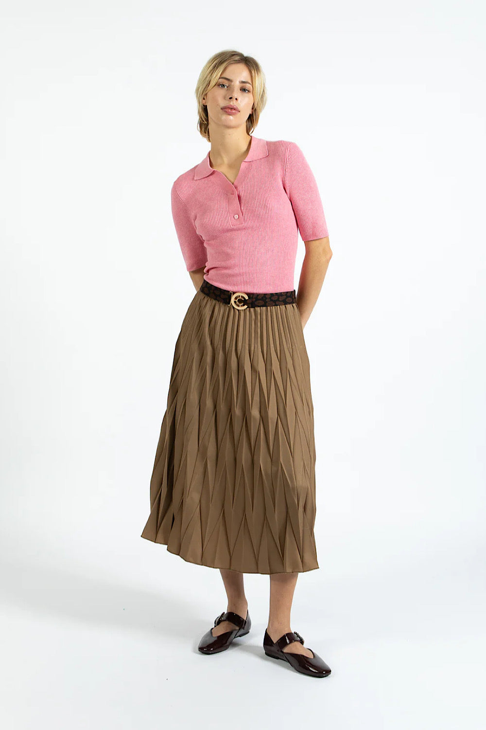 Una falda muy especial, con goma en la cintura y detalle de un tipo de plisado con un toque diferente. Nos encanta para combinar con jerséis o con tu blusa favorita.
