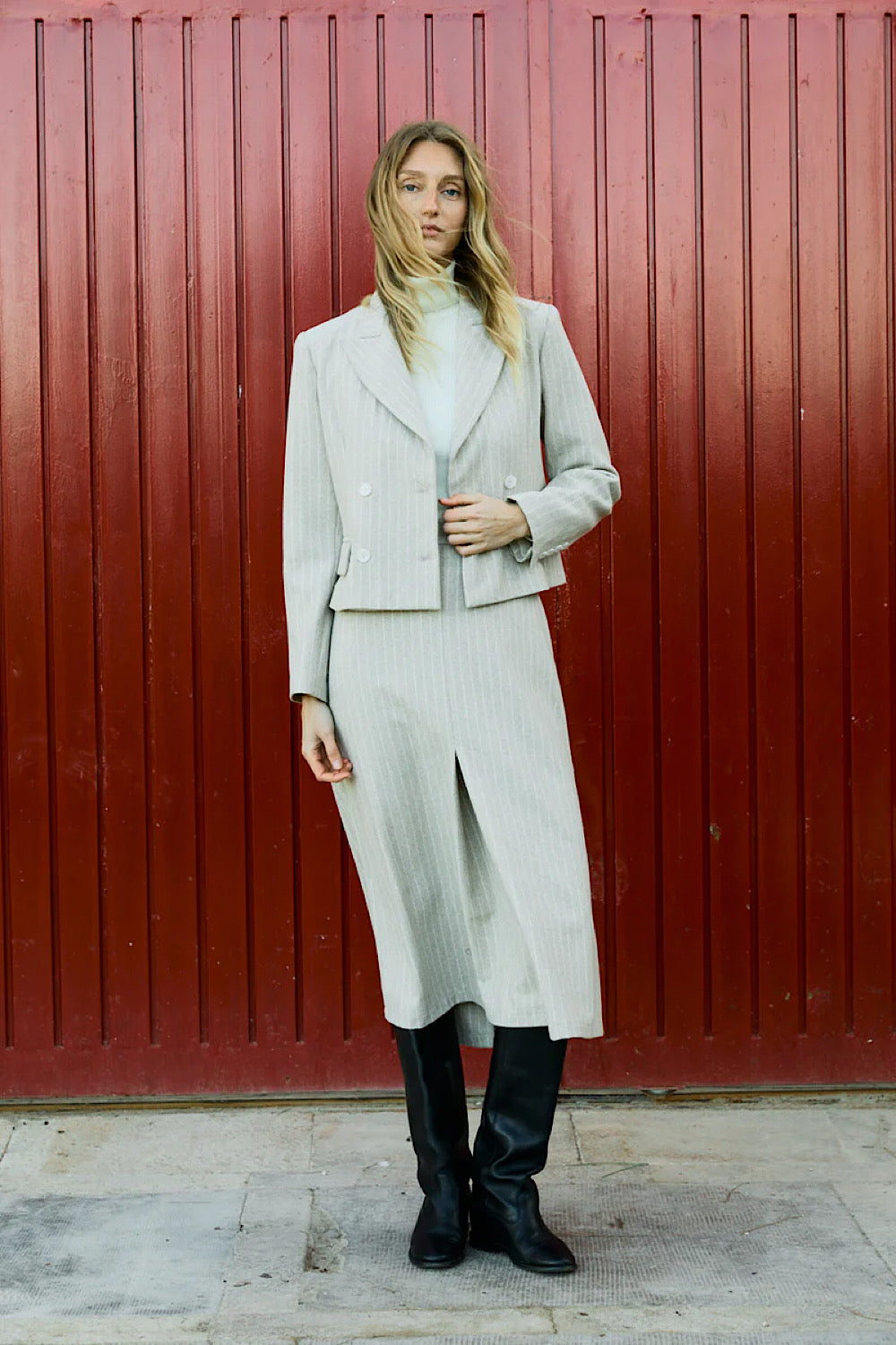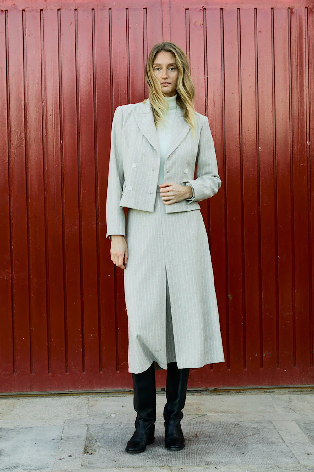 Nos encanta esta prenda de Magnolya. Falda midi evasé con pliegue en parte delantera, con raya dipolomática y cierre con cremallera en espalda. Si quieres un total look muy especial elige también chaqueta Filip.