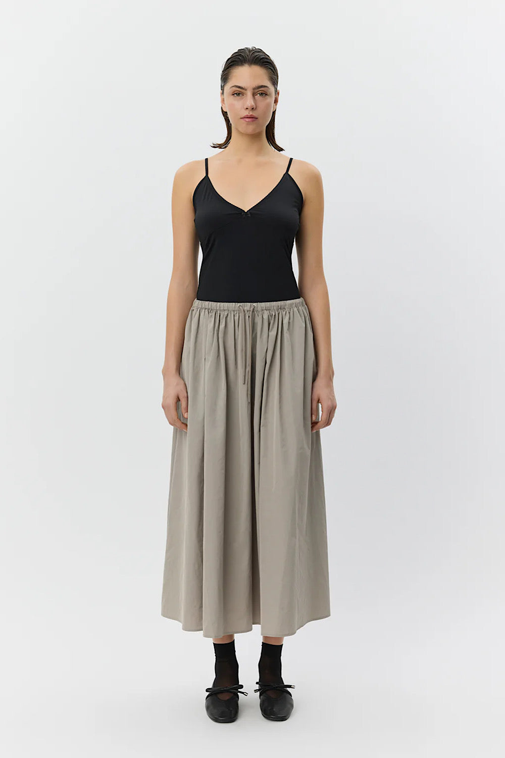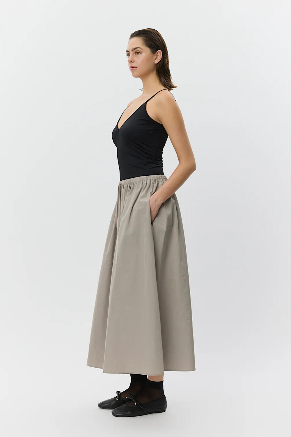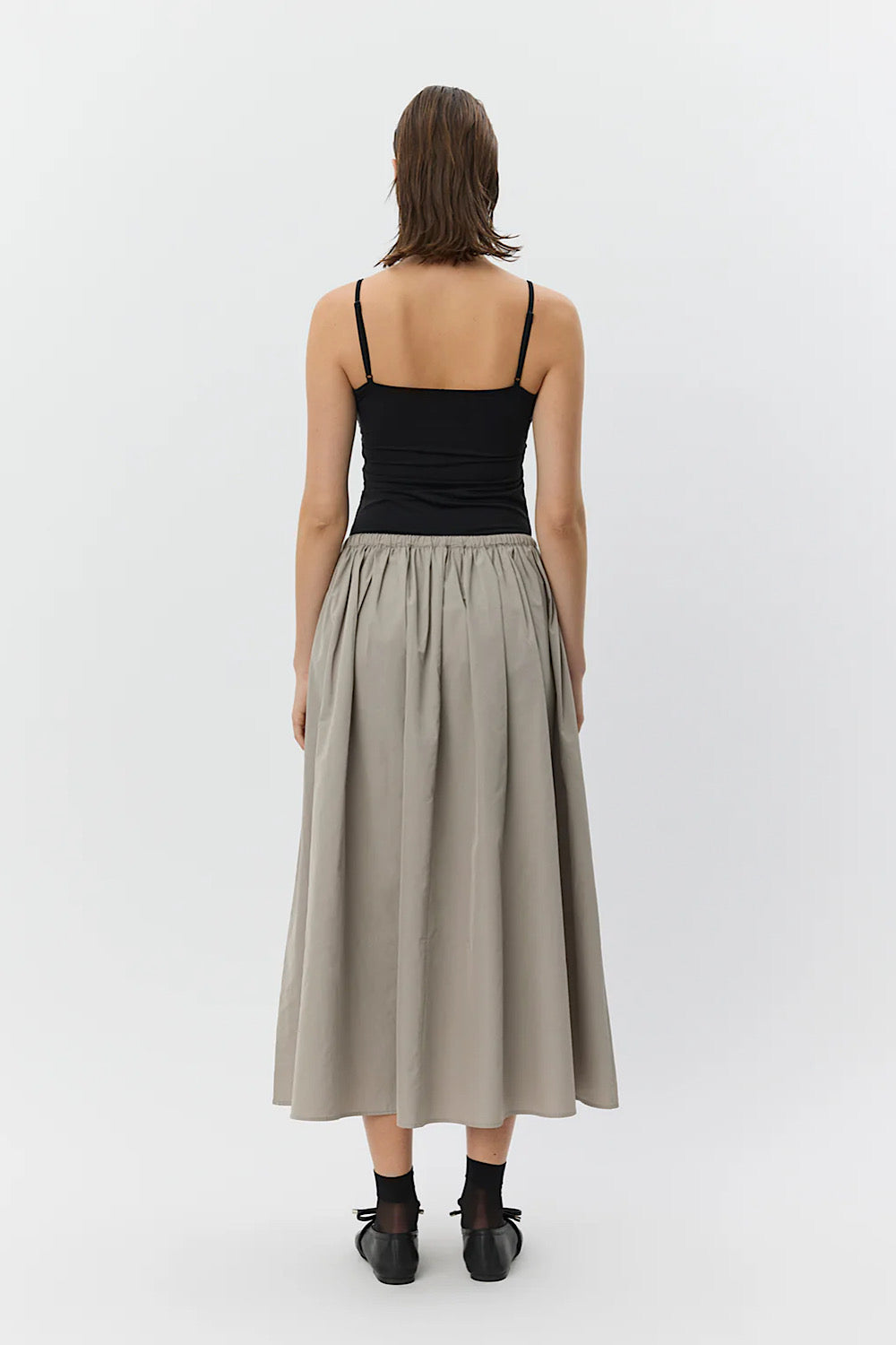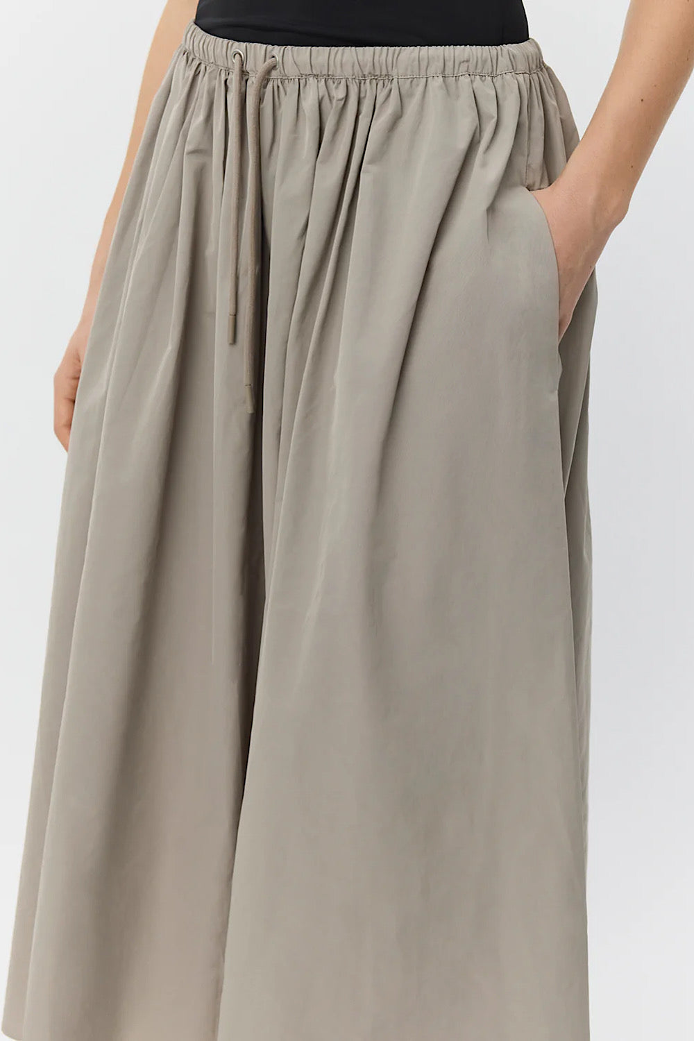 Una falda con mucho rollo, con goma en la cintura. Es tipo talla única, ya que se ajusta.