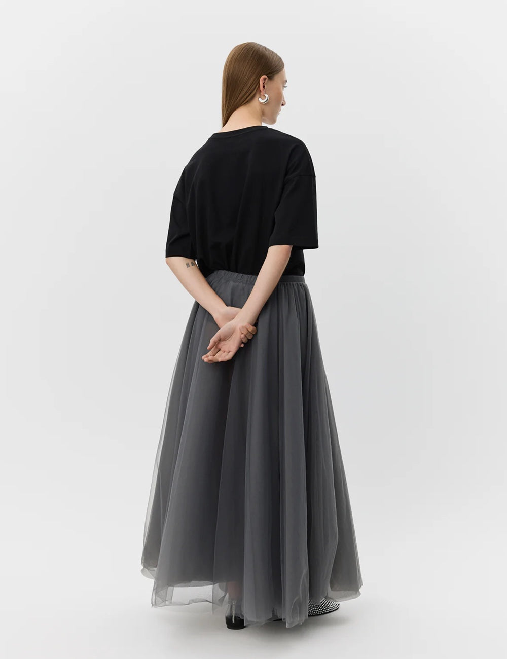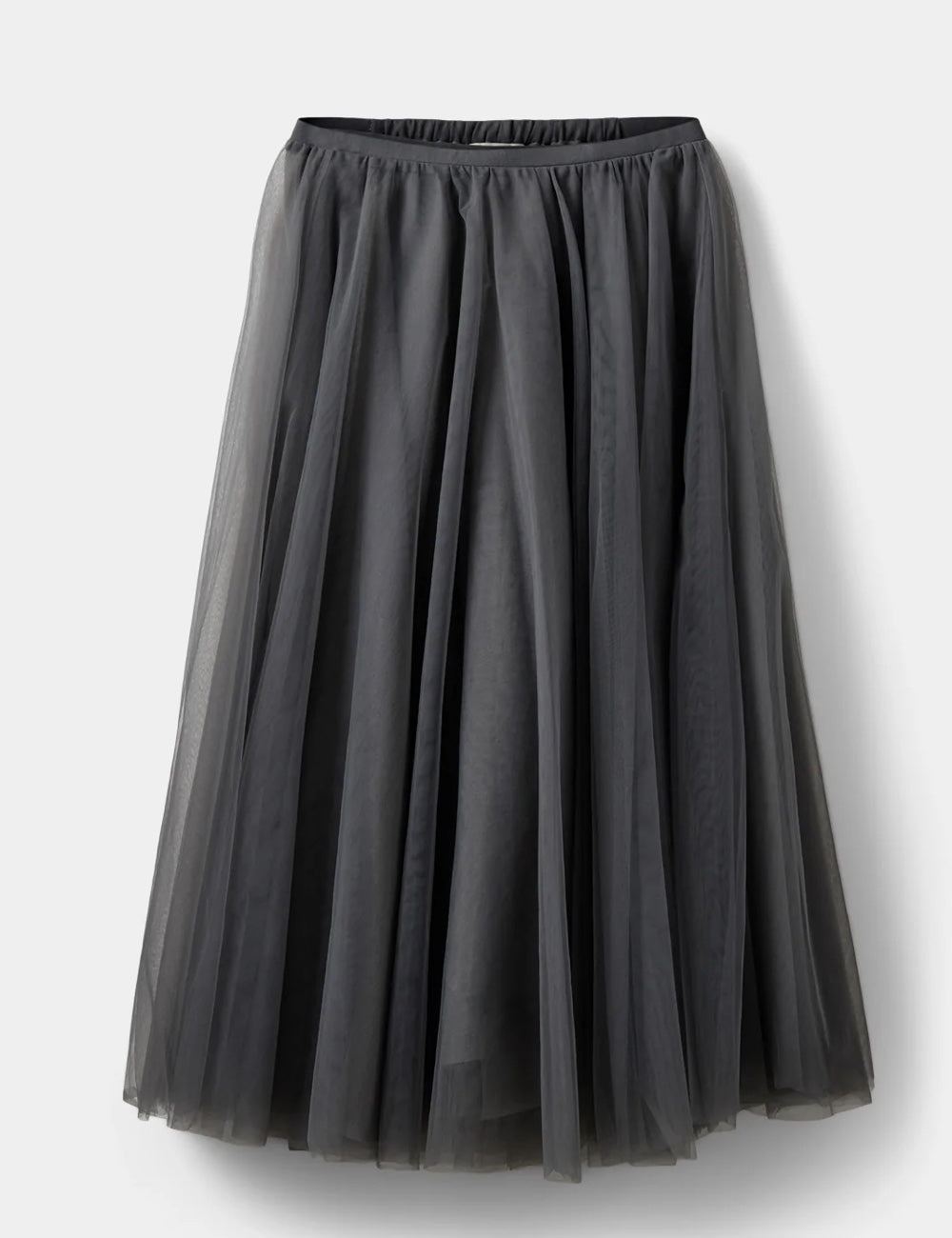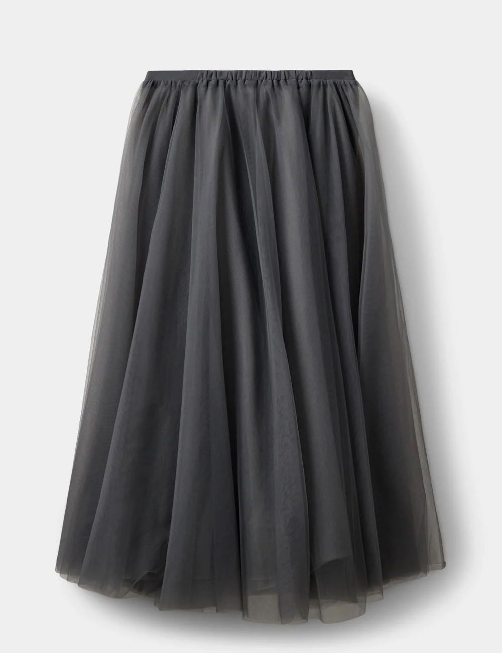 Falda de tul en color gris, con goma en la cintura. Perfecta para crear muchísimos looks con mucho rollo.