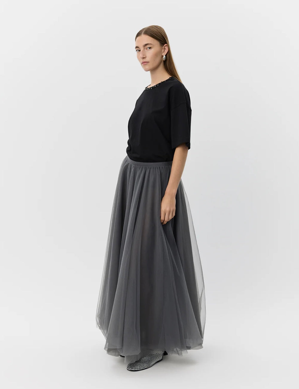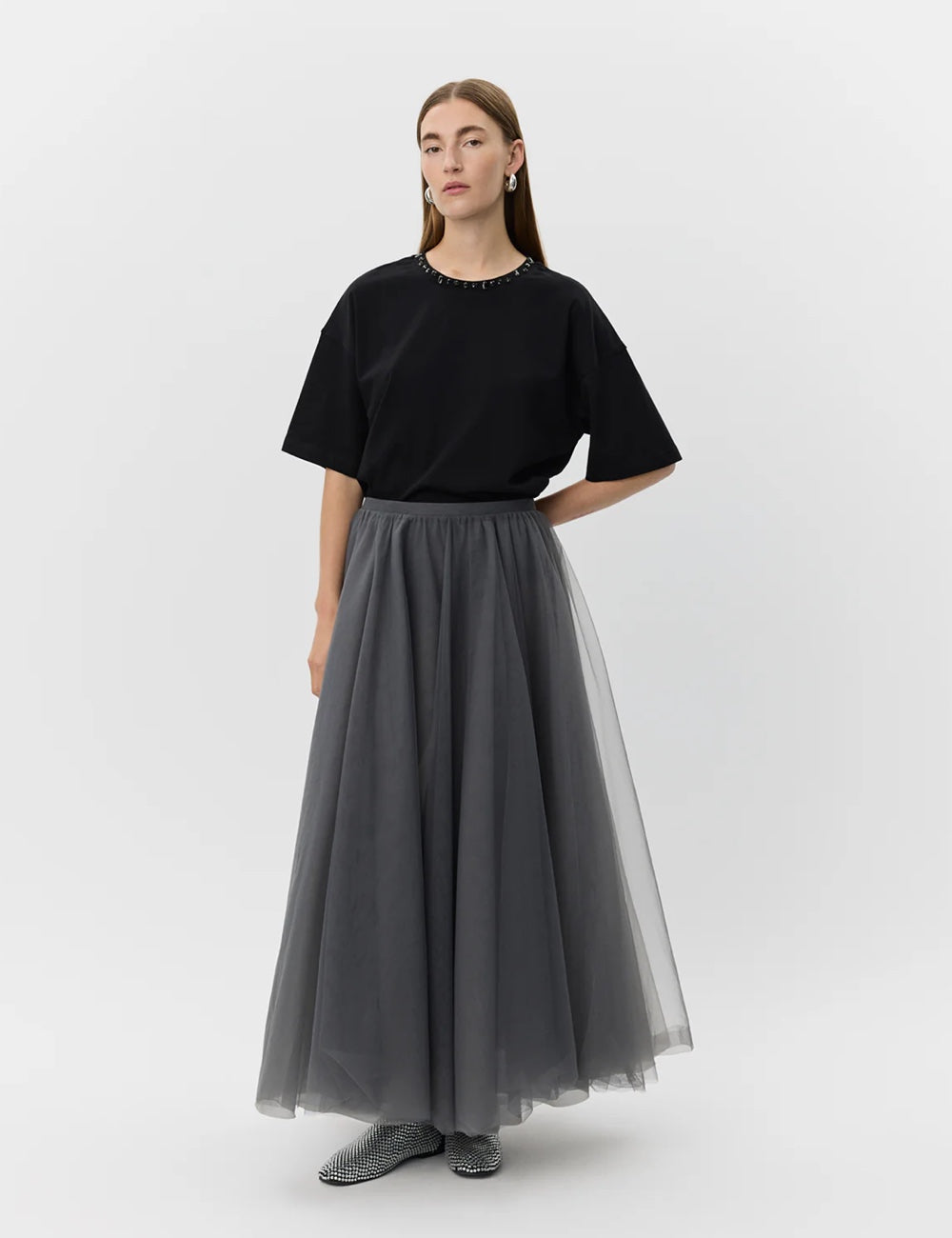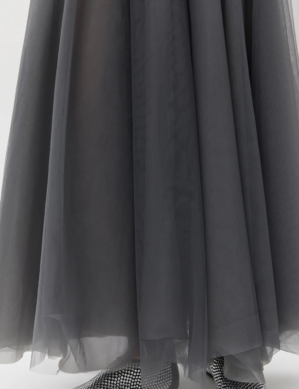 Falda de tul en color gris, con goma en la cintura. Perfecta para crear muchísimos looks con mucho rollo.