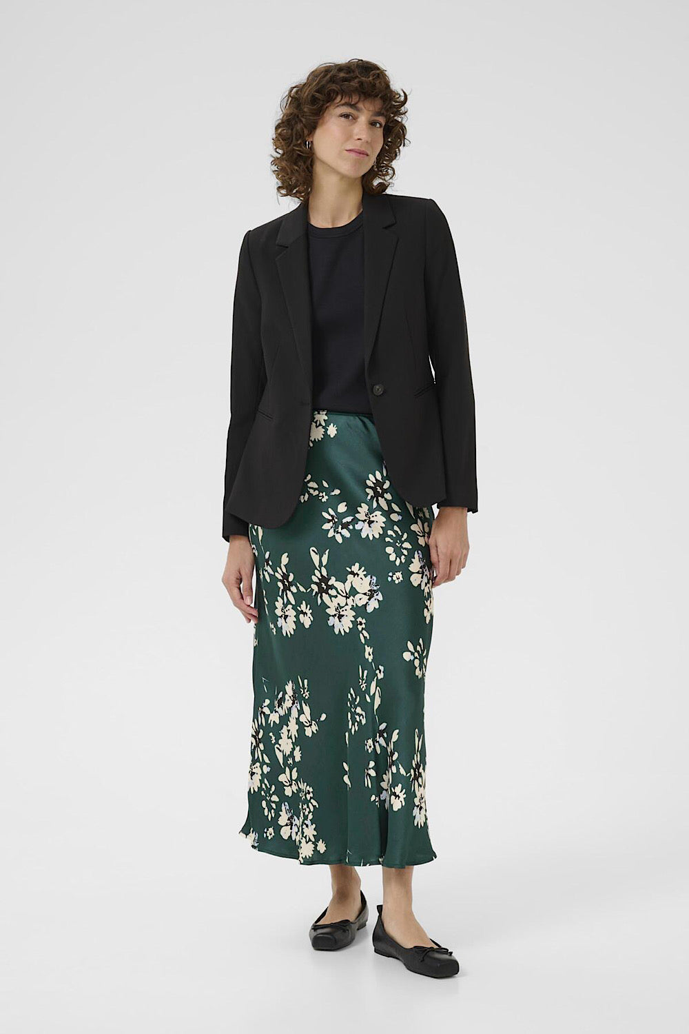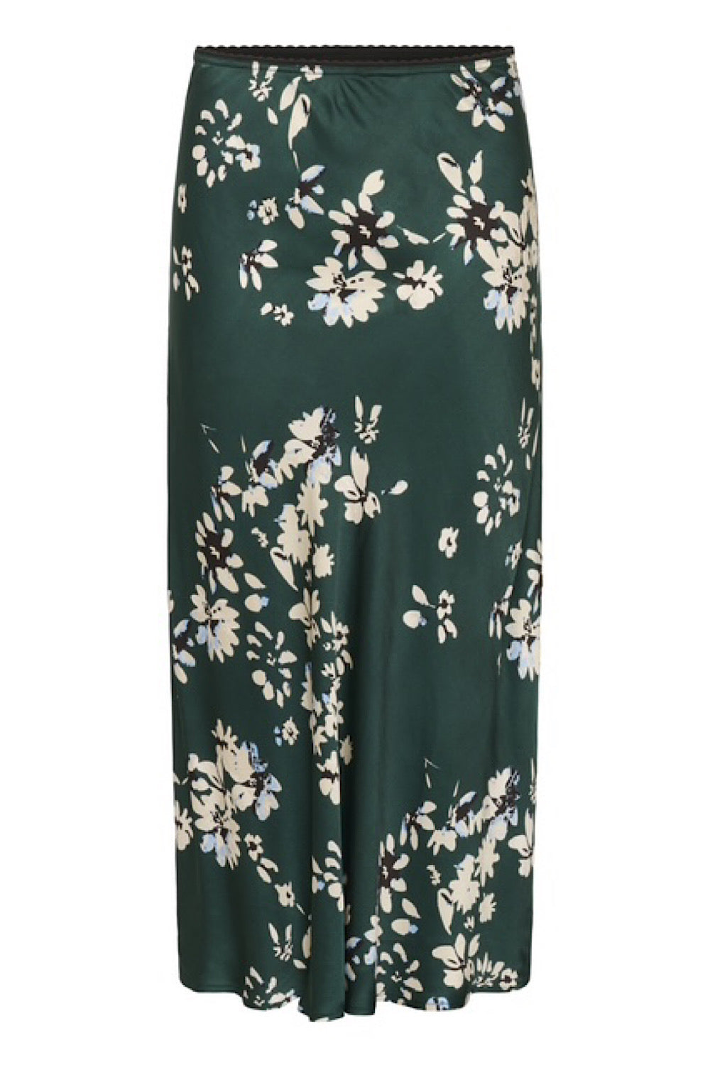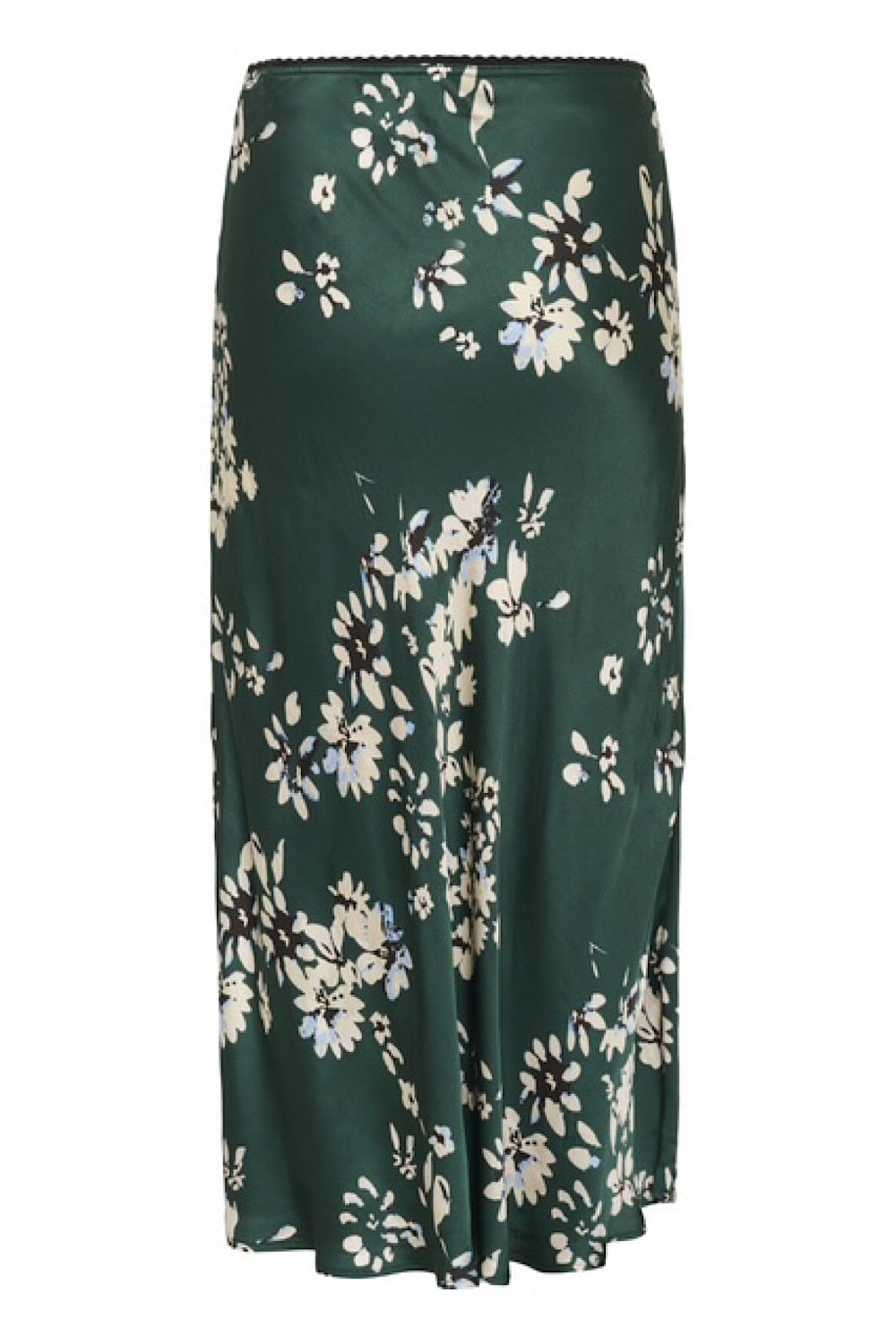 Falda con tejido tipo satén con goma en la cintura. Tiene un estampado de flores sobre un verde muy bonito. Una prenda muy versátil que os encanta siempre. Si quieres un total look elige también el jersey Spencer.