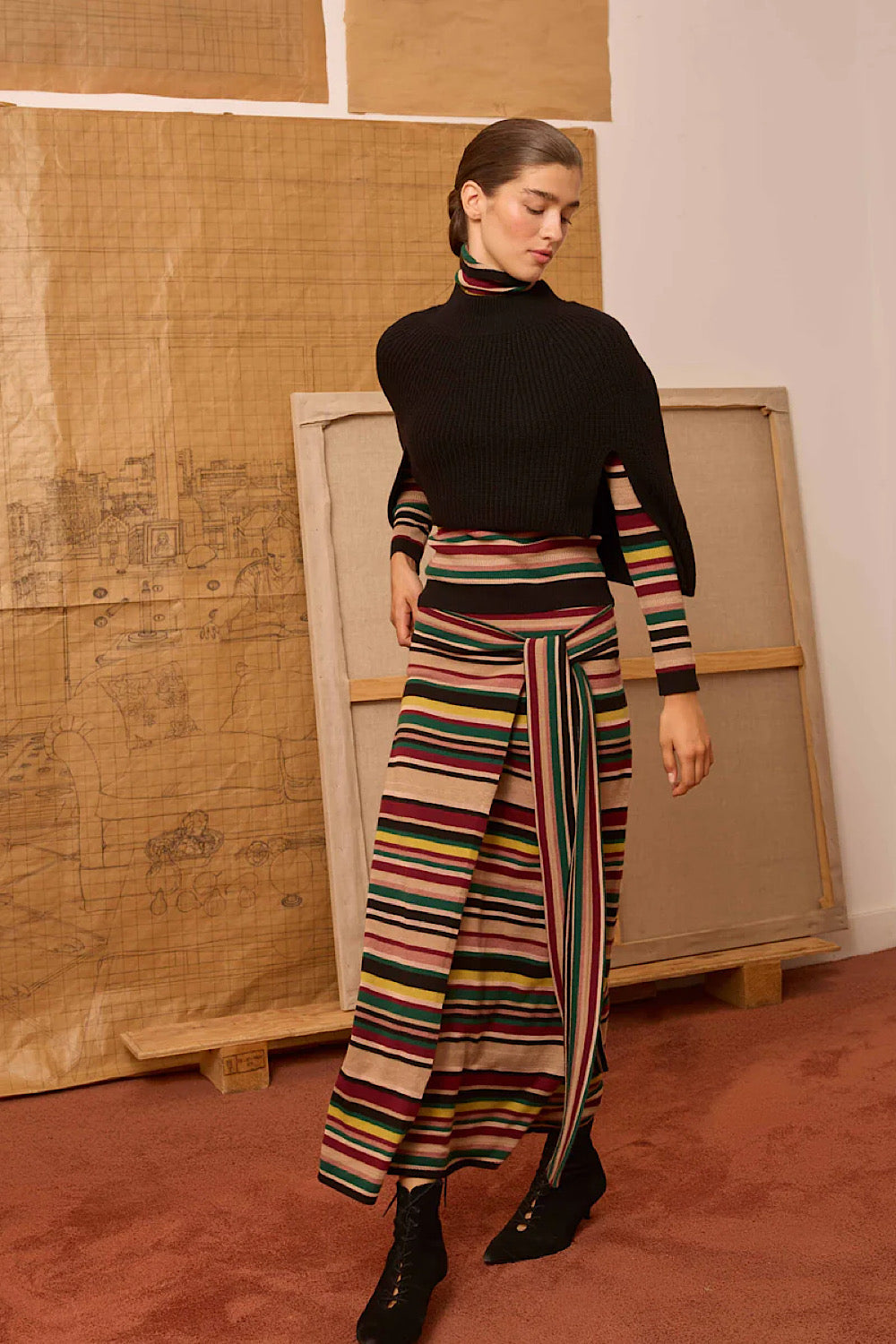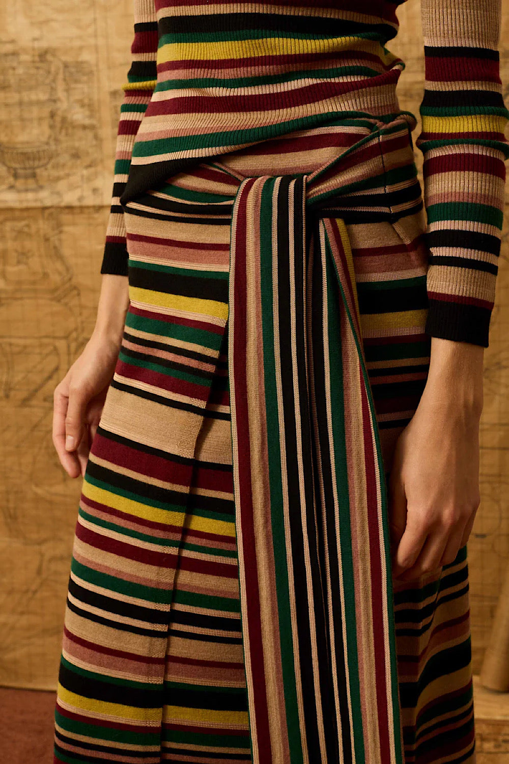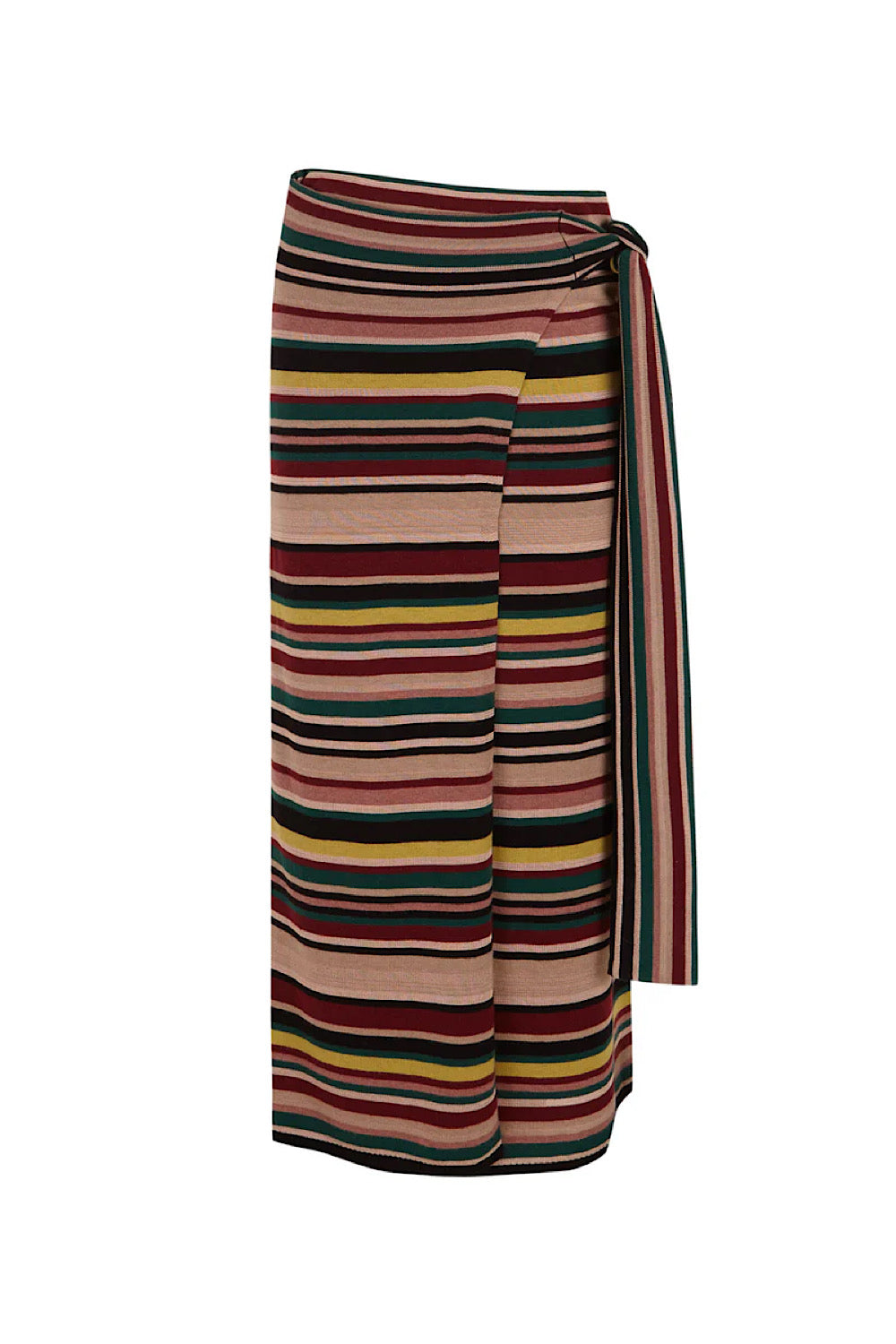 Falda de punto midi y tipo pareo. Con diseño de multirayas que le da un toque muy especial. Una prenda cómoda y con mucho estilo con la que no pasarás desapercibida.