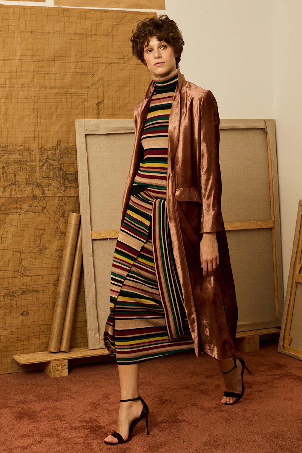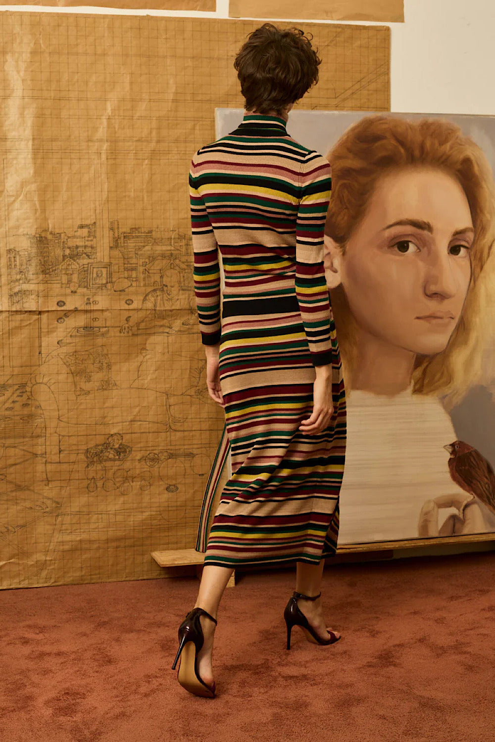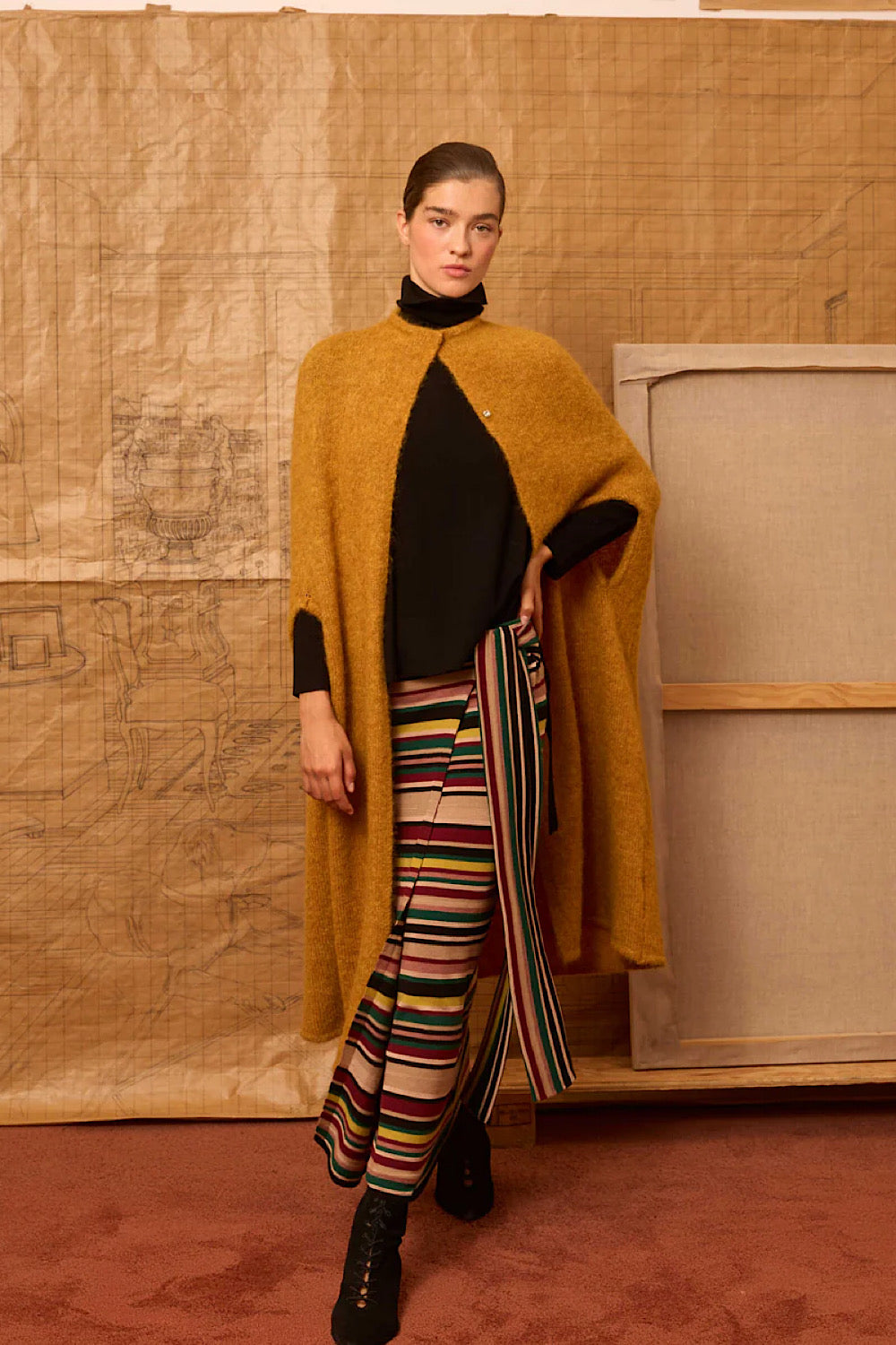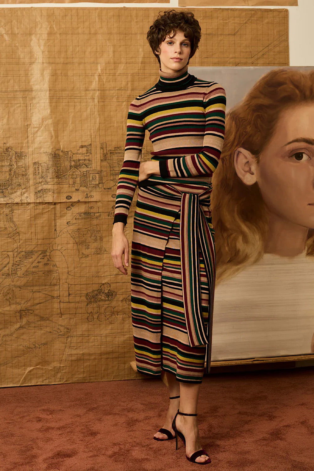 Falda de punto midi y tipo pareo. Con diseño de multirayas que le da un toque muy especial. Una prenda cómoda y con mucho estilo con la que no pasarás desapercibida.