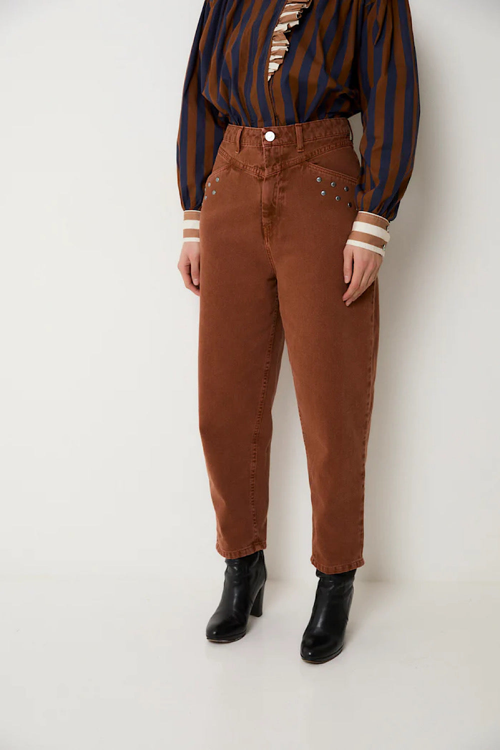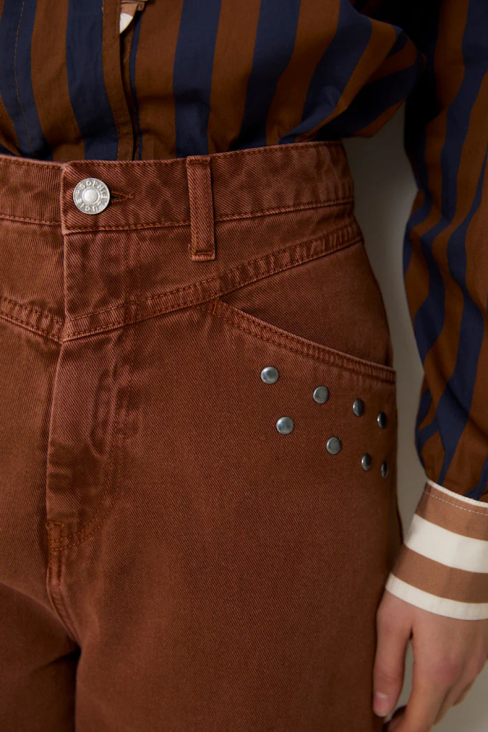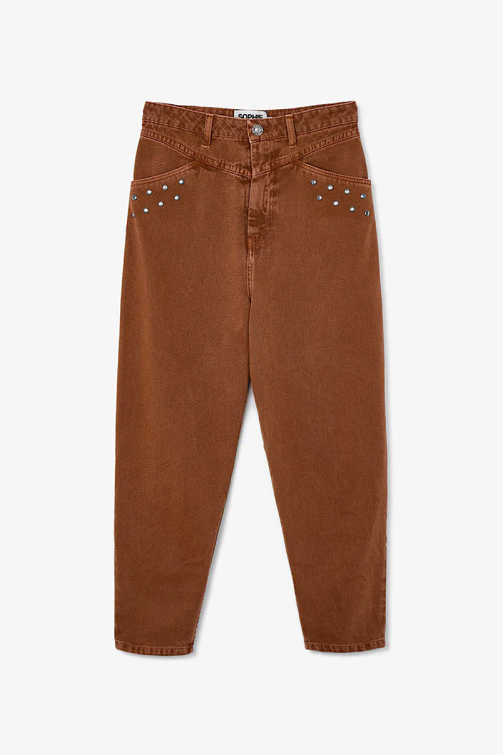 El modelo corsé de Sophie and Lucie, un vaquero confeccionado en sarga color camel con detalle de tachas en los laterales de la parte delantera, volumen en la pierna y corte trasero. Un modelo que os encanta siempre.