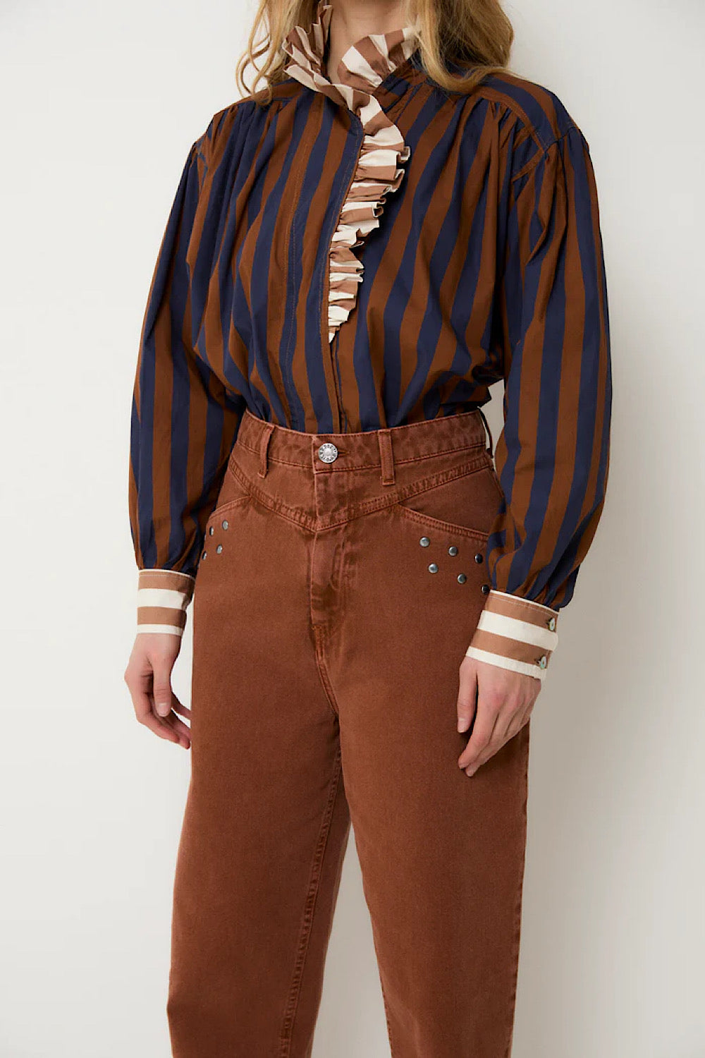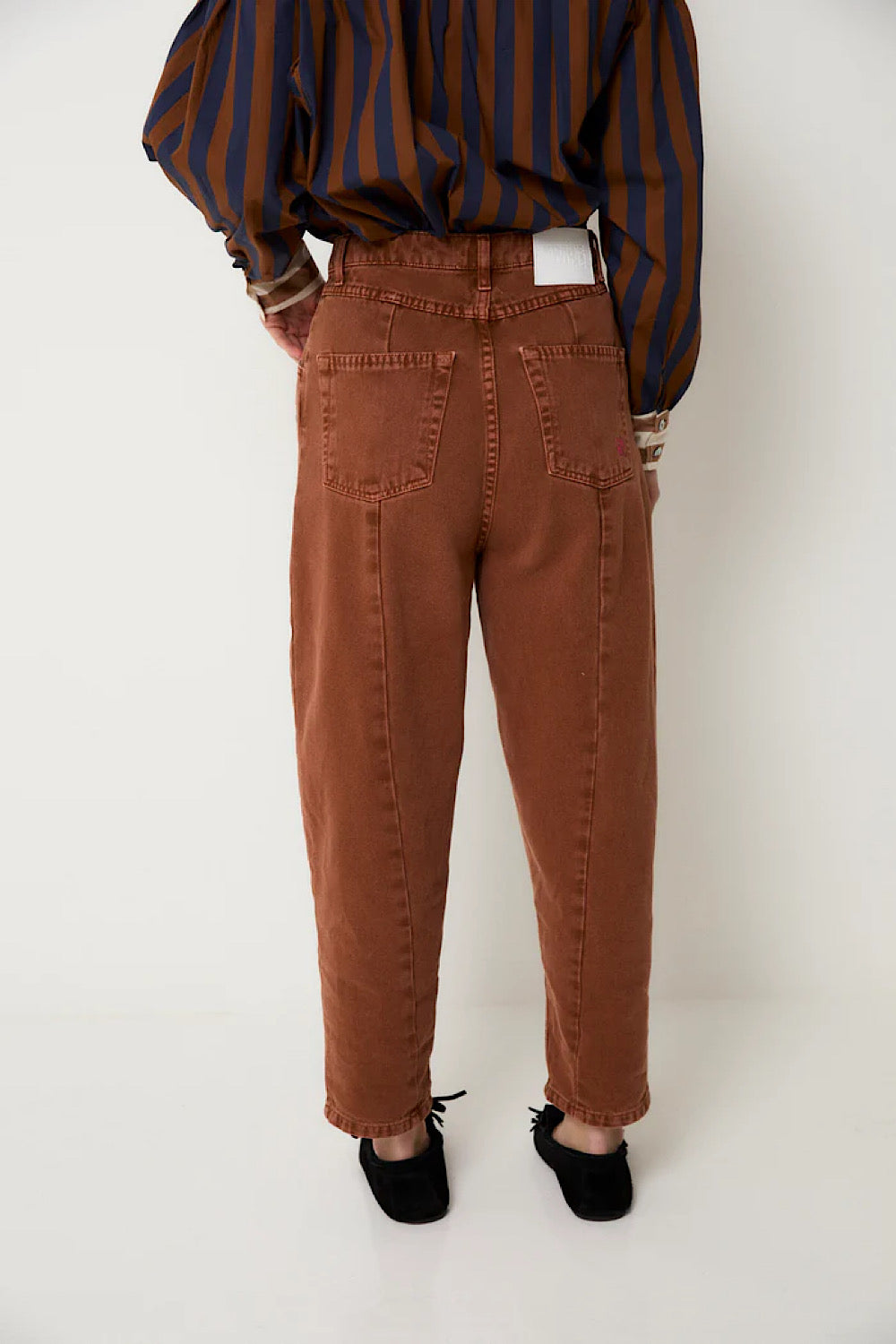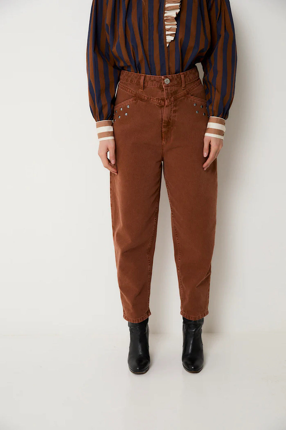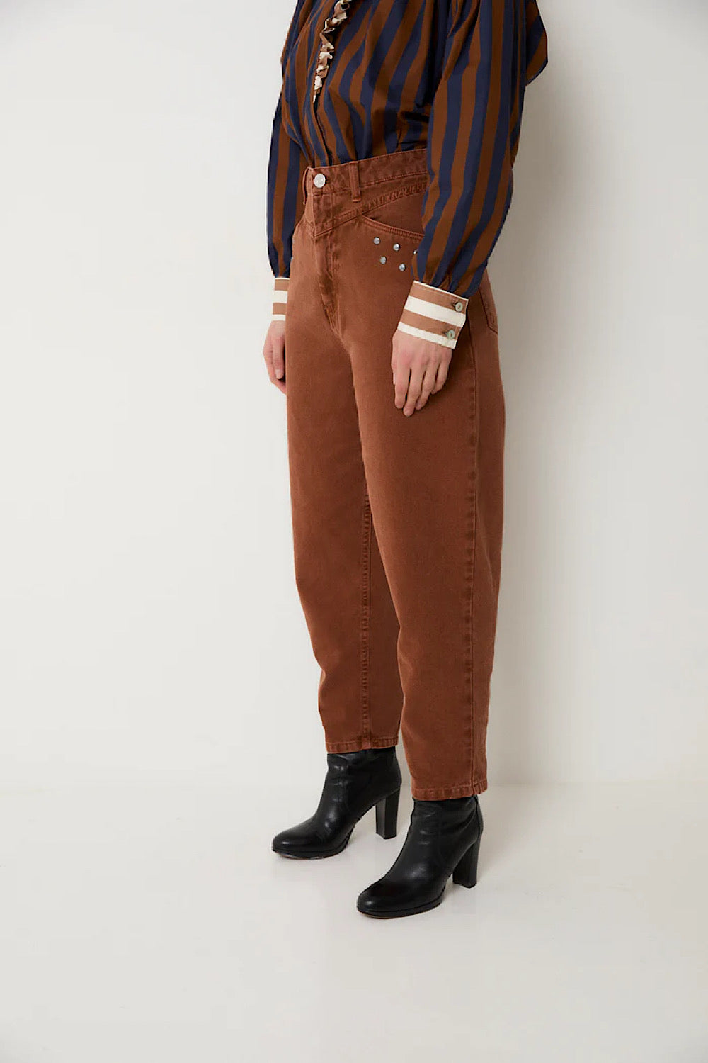 El modelo corsé de Sophie and Lucie, un vaquero confeccionado en sarga color camel con detalle de tachas en los laterales de la parte delantera, volumen en la pierna y corte trasero. Un modelo que os encanta siempre.