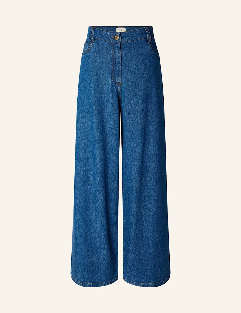 Pantalón vaquero amplio de talle muy alto, con perneras ligeramente acampanadas, en tejido denim fluido son lavado sencillo, confeccionado en España. Un modelo de Sessùn que siempre os encanta.