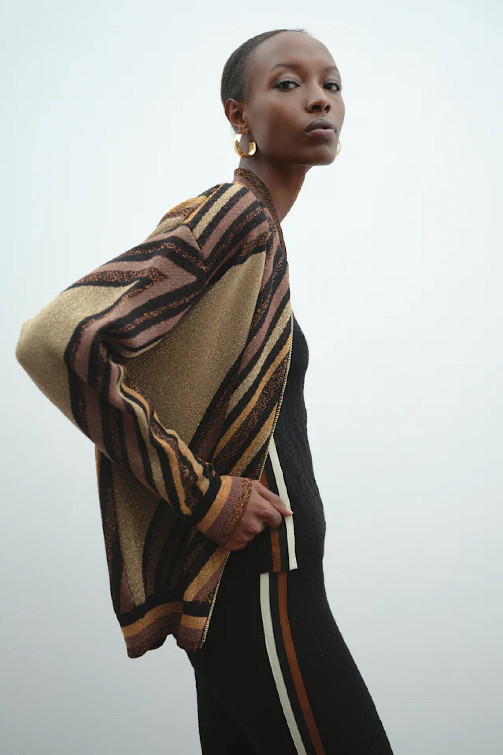 Chaqueta tipo bomber en punto de lúrex, muy típico de Missoni, ya que es una nueva marca del grupo y tiene su sello característico. Dibujo con motivos en diagonal que favorece la figura. Elige los pantalones a juego si quieres un total look muy especial.