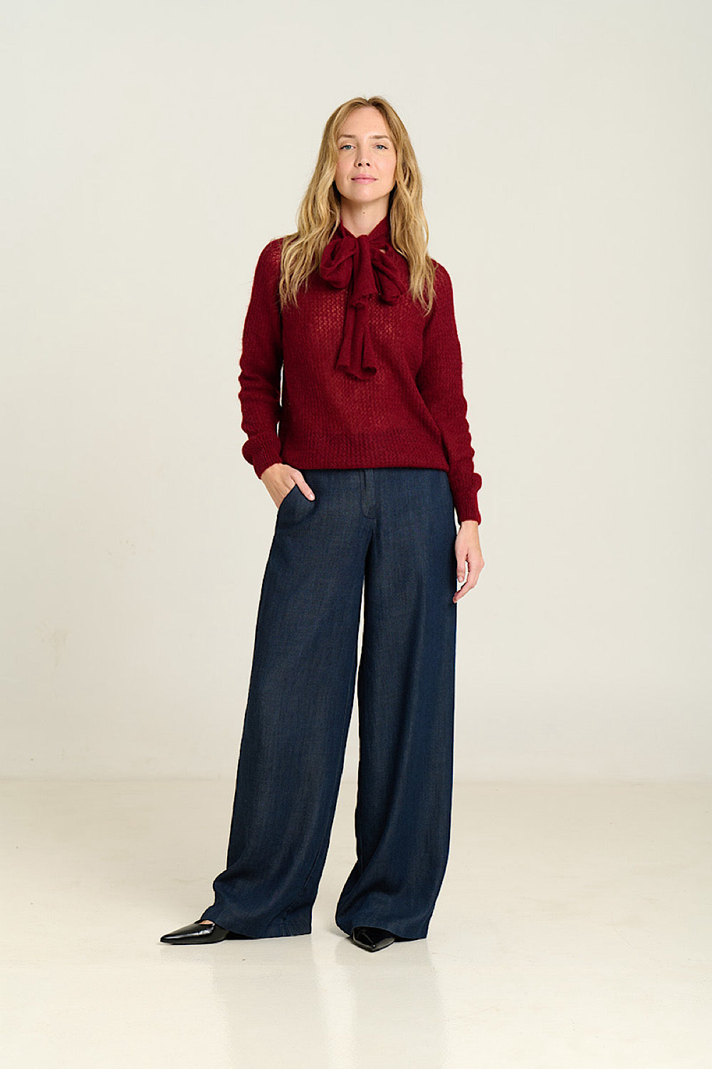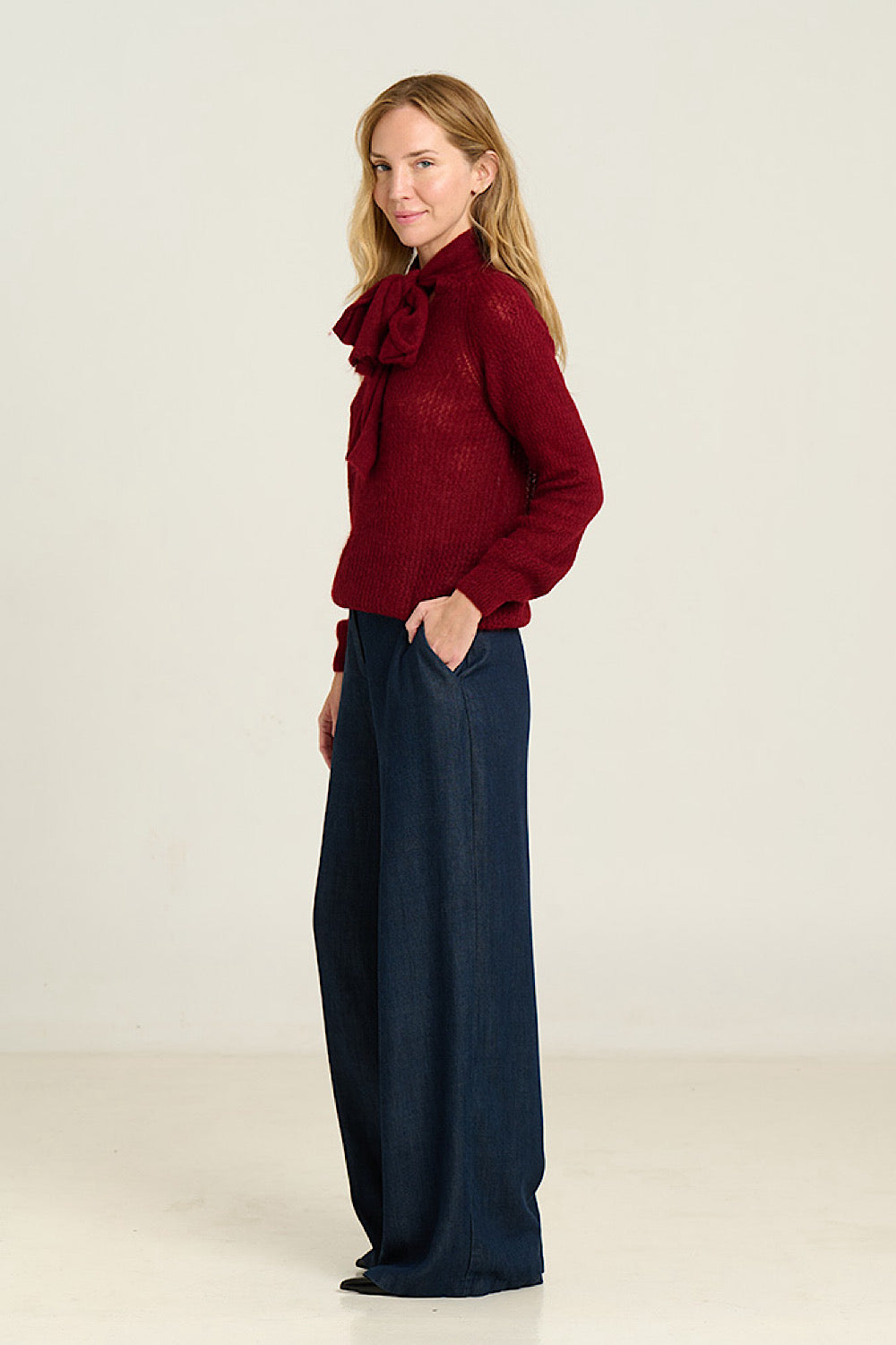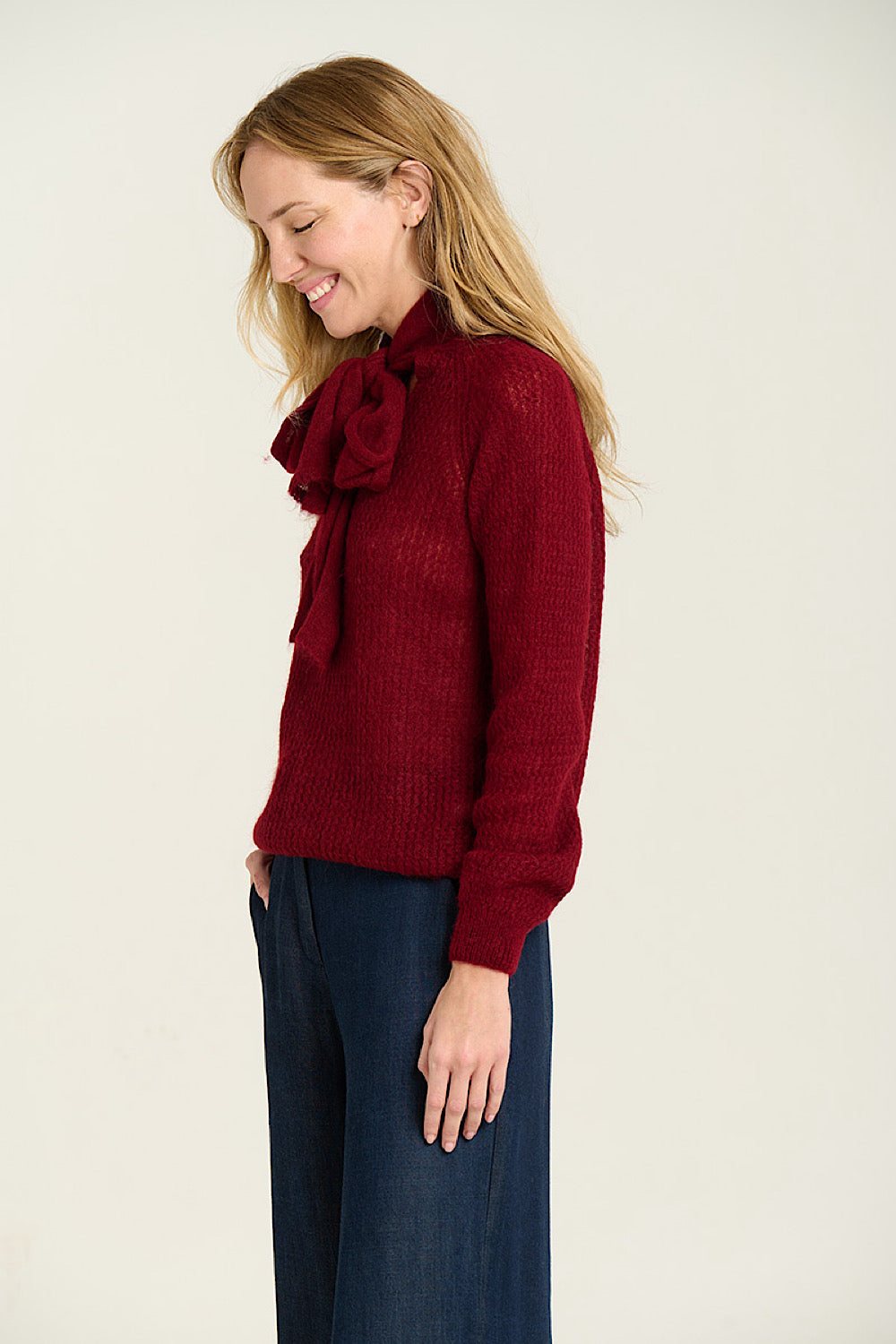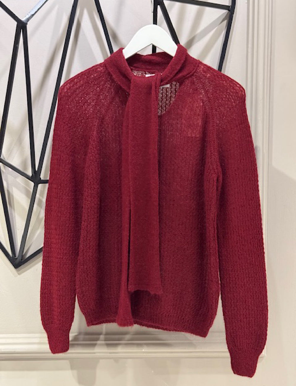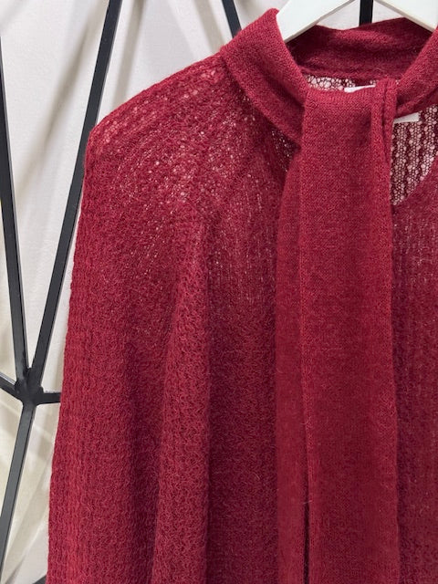 Jersey con lazada en el cuello, en color burdeos, muy favorecedor y muy tendencia. Una prenda de punto muy especial.