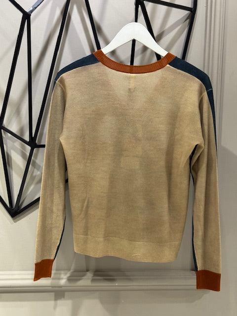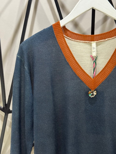 Una nueva marca de punto llega a Classy Privee, es muy especial y os va a encantar. Suéter fino de escote de pico con detalle de mini joya en forma de broche que puedes quitar o poner. Color base denim desgastado con contraste en teja en cuello y puños y color arena en la parte trasera. Queda genial con los pantalones Celeste si quieres un total loook.
