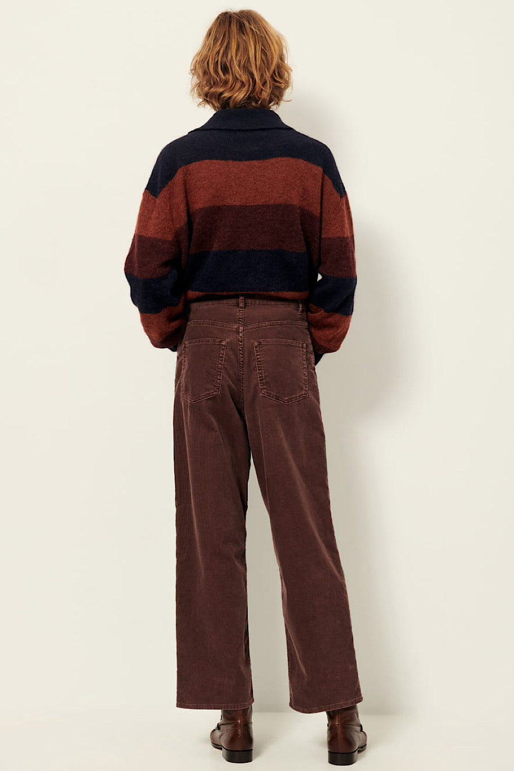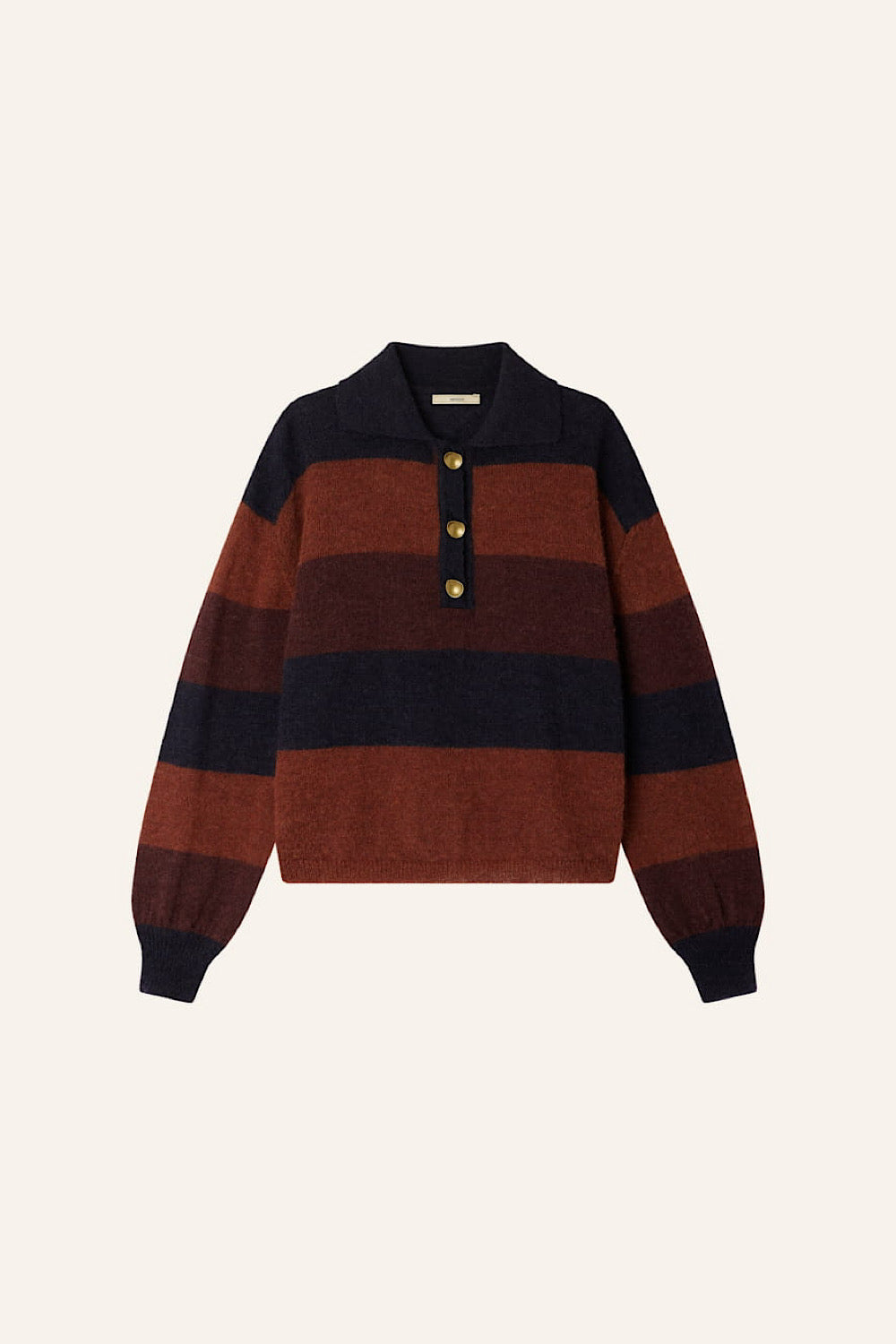 Jersey tipo polo, súper tendencia, con detalle de rayas en tonos tierra con azul marino. Sin duda, una de las prendas estrella de la temporada.