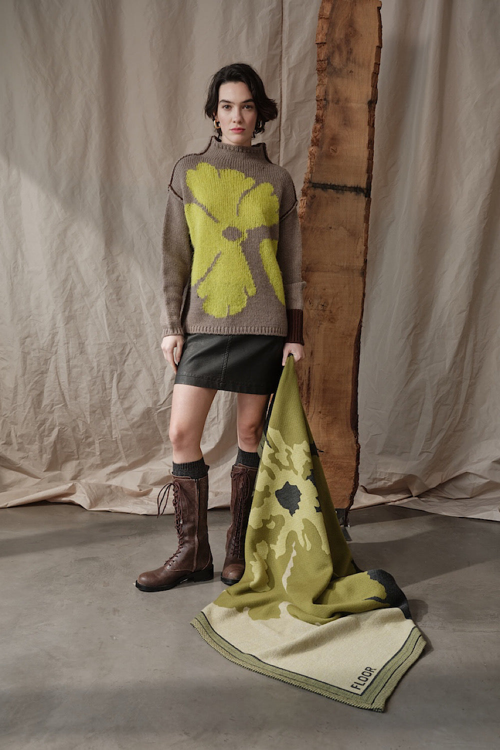 Un jersey muy especial con cuello tipo chimenea y detalle de maxi flor en un lima que le da un toque ideal y muy favorecedor a la prenda.