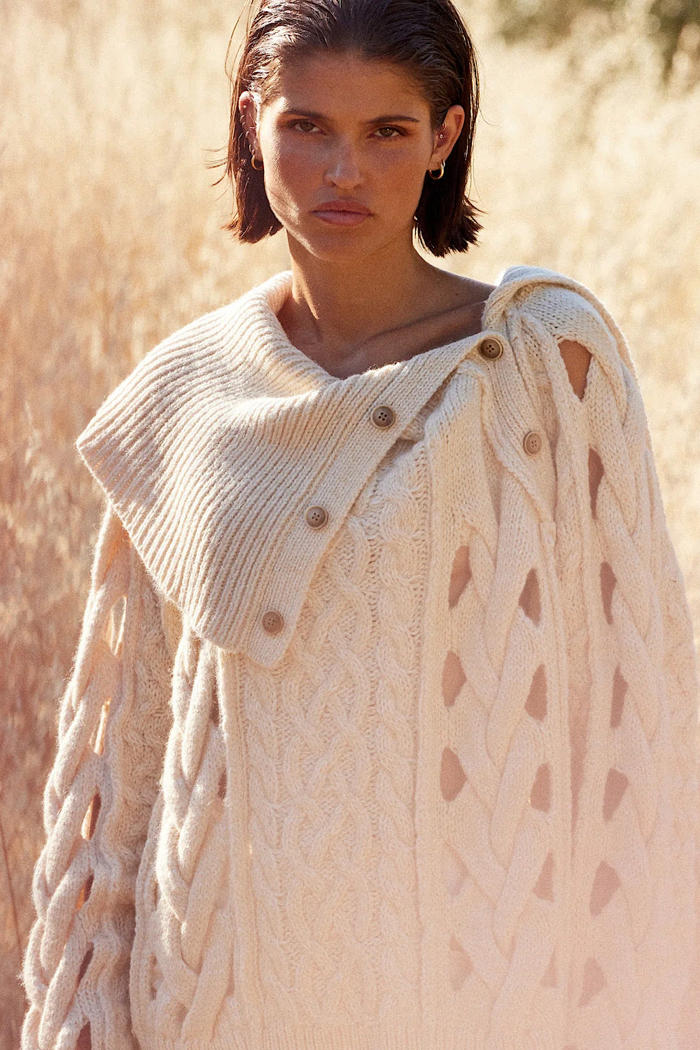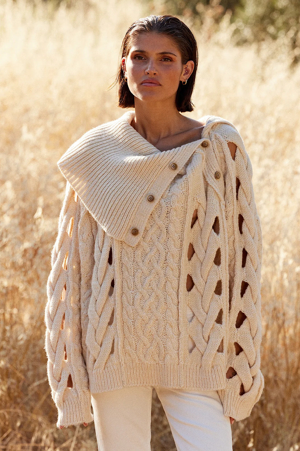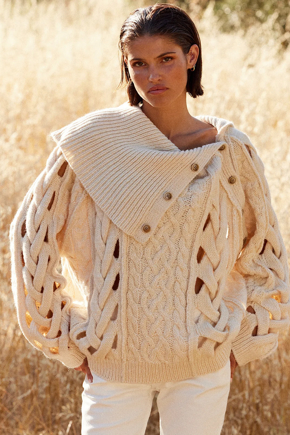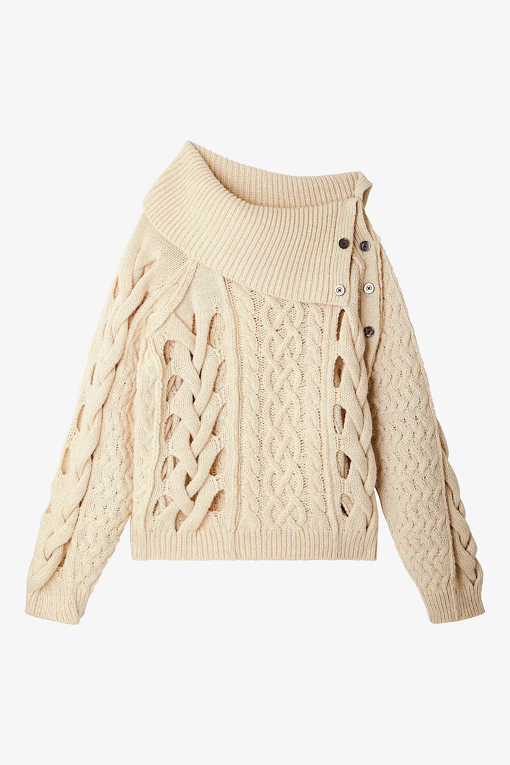 Un jersey muy especial de Mes Demoiselles, con cuello abierto por los botones y detalle de grandes trenzados, que deja pequeños calados, es oversize y lo queremos en nuestro armario.