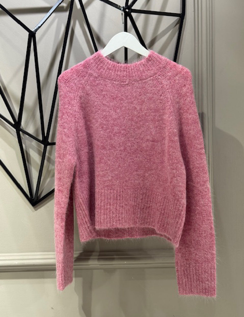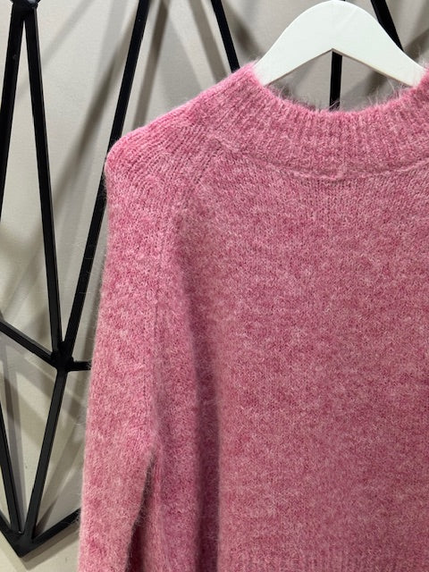 Jersey con cuello redondo en un tono rosa ideal y muy favorecedor. Con maxi mangas y súper calentito.