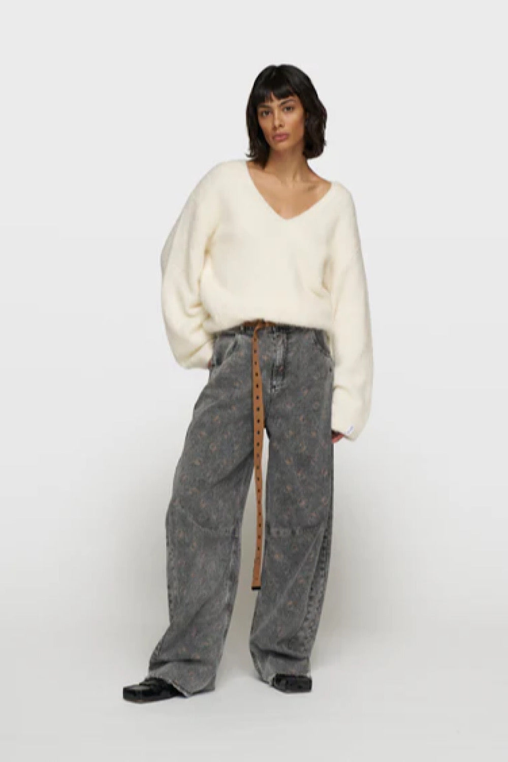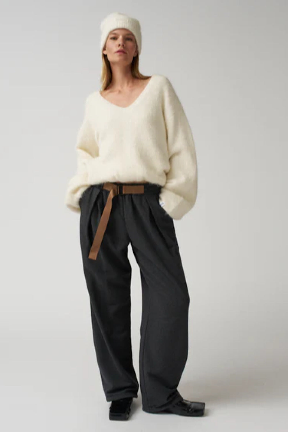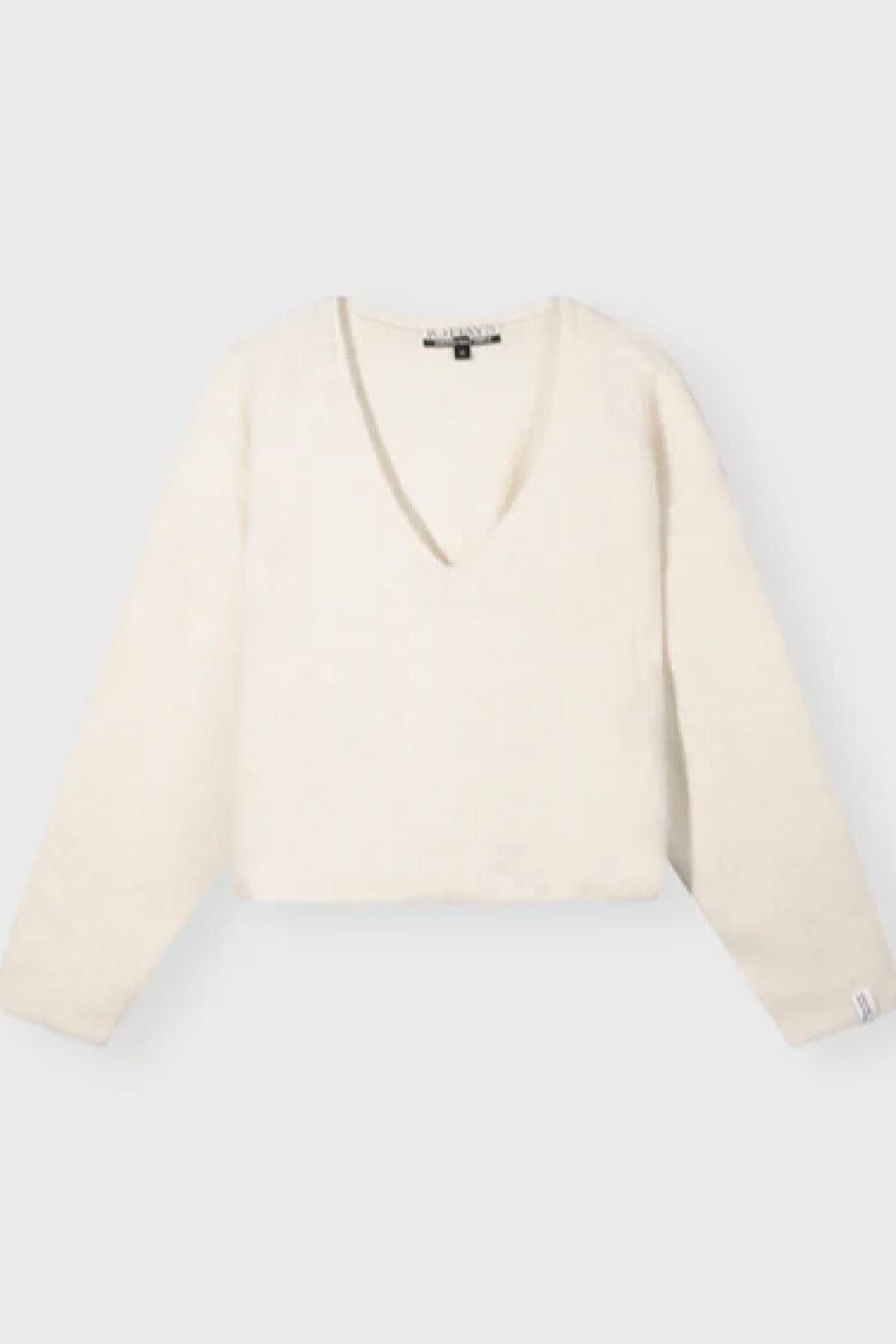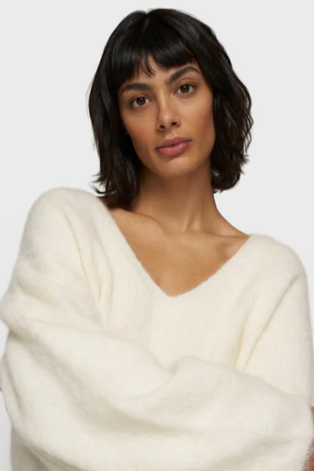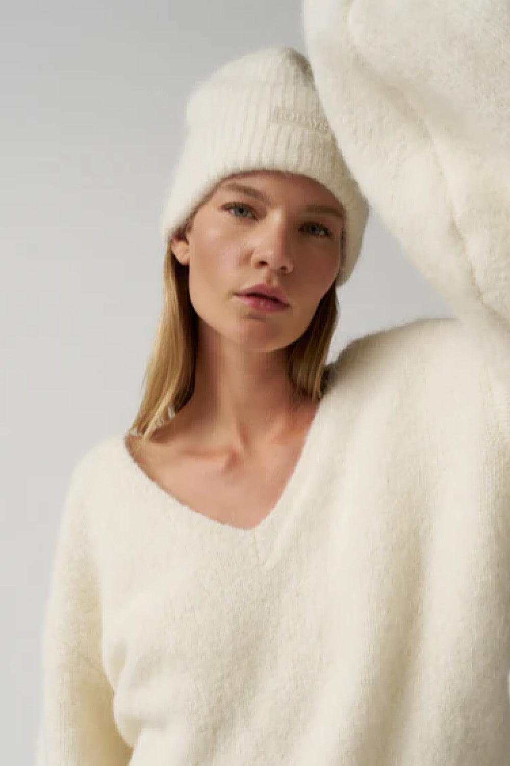 Jersey de pico con un 59% de alpaca en tono crudo que da muchísima luz. Suave y confortable. Es corto y tiene un detalle que nos encanta, el interior va forrado para que el punto no esté en contacto con tu piel, para las chicas a las que les pueda picar.