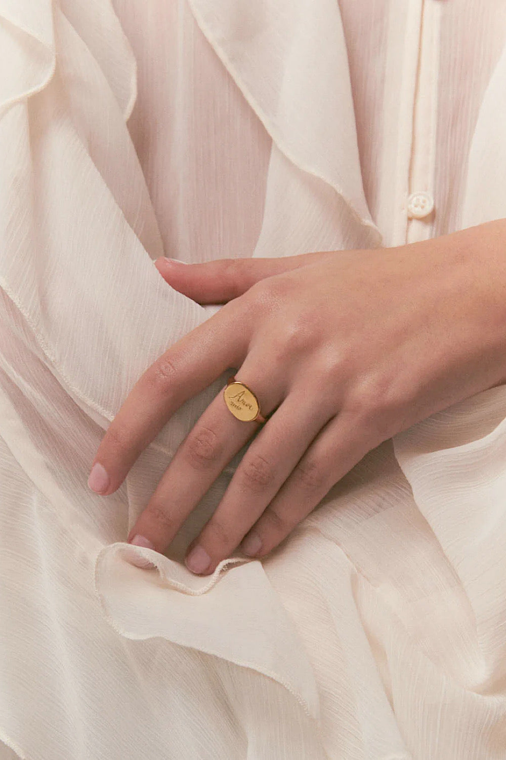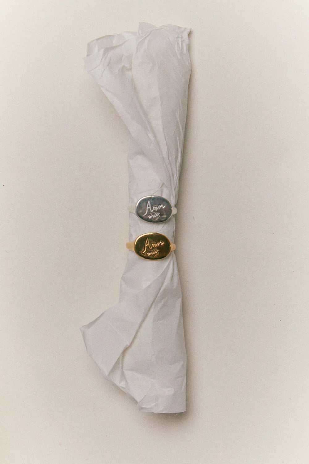 Anillo sello en oro con las palabras Amor mío grabadas. Una expresión que encierra una de las declaraciones más universales del español y que ha atravesado cartas, poemas y canciones. Amor mío es una forma directa y sincera de decir “te quiero”. Un anillo que guarda el poder de esas palabras que se vuelven amuleto.