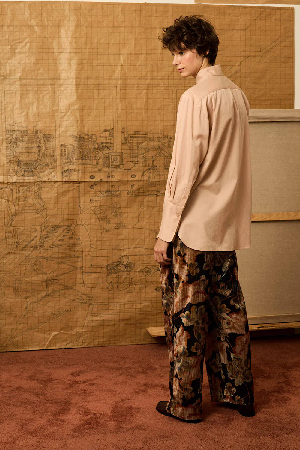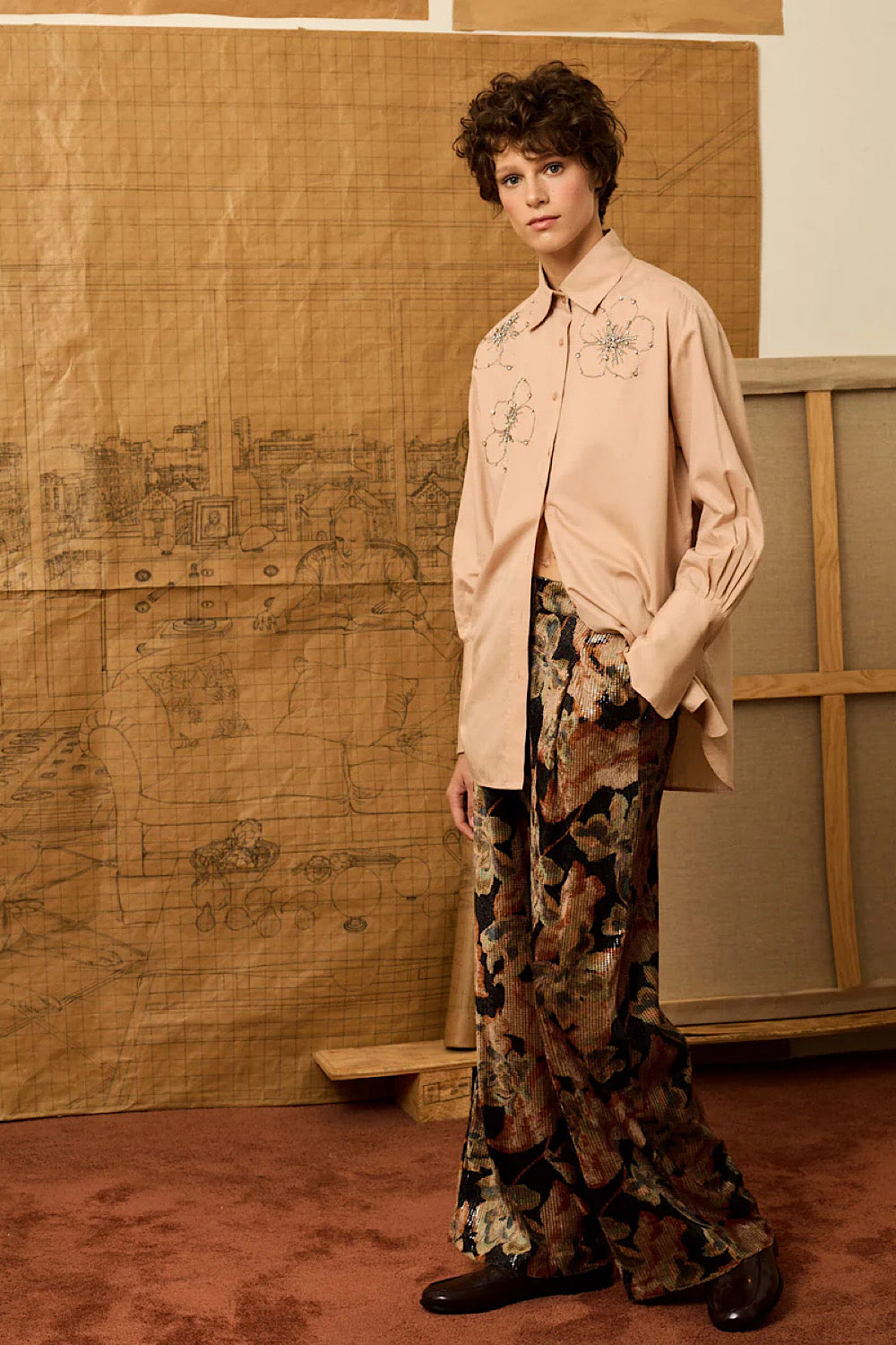Camisa con corte masculino y fondo rosa. Detalle de bordados de flores en pedrería que le dan un toque muy especial.