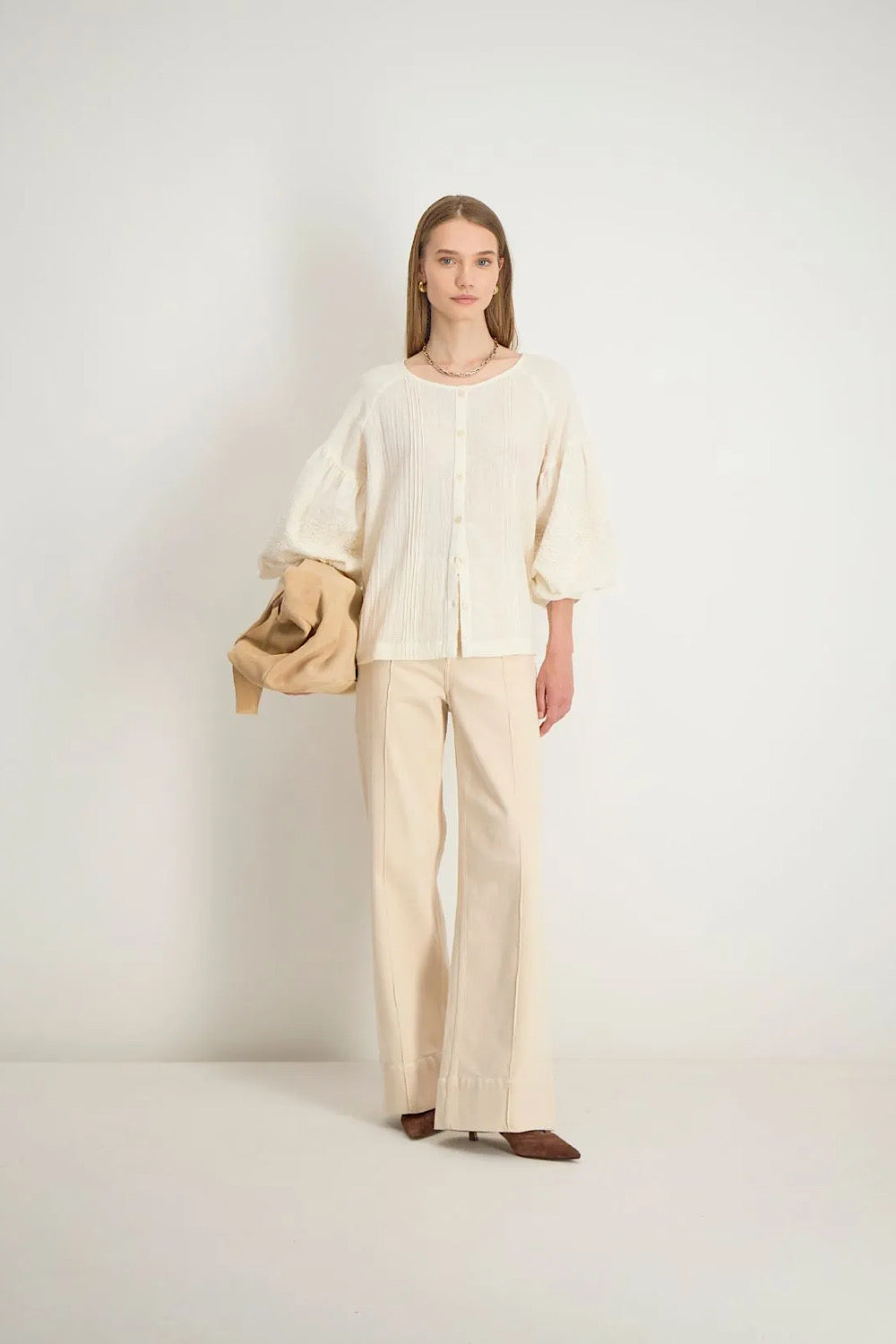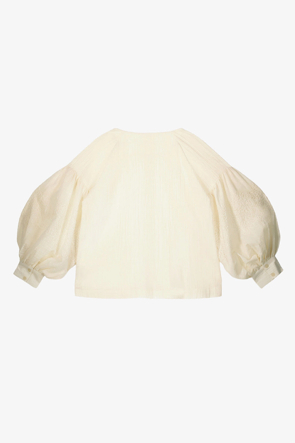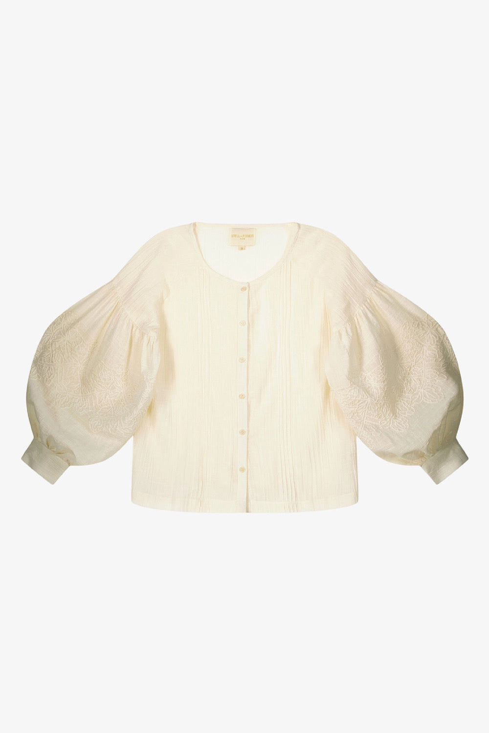 Una blusa muy especial con detalle de mangas abullonadas y bordado en las mismas. Perfecta para combinar con todos tus looks de temporada.