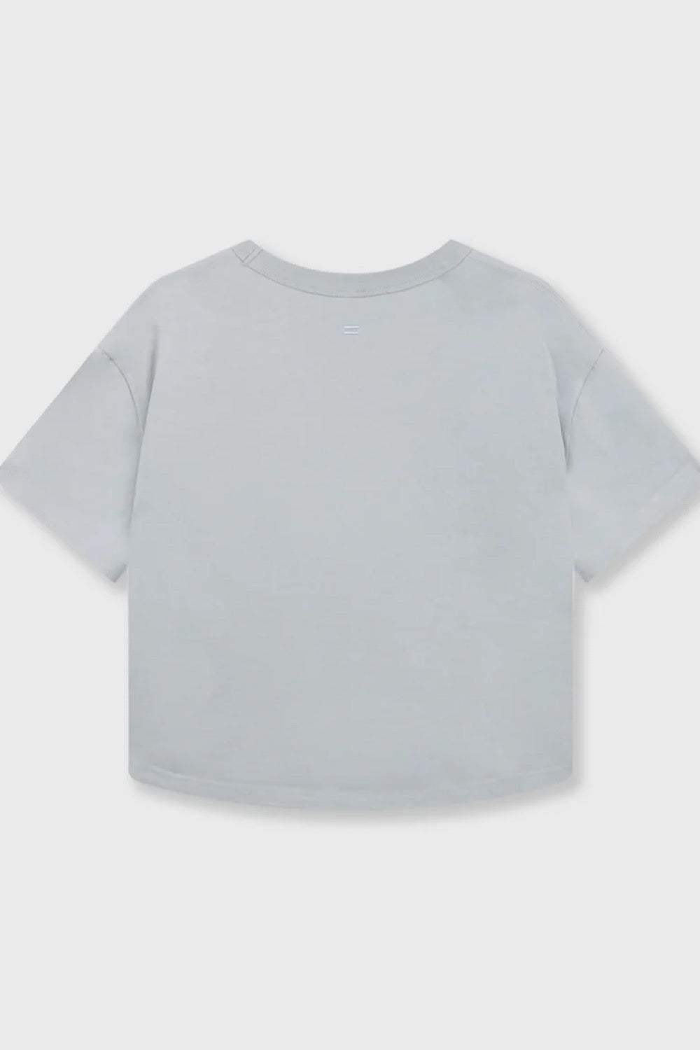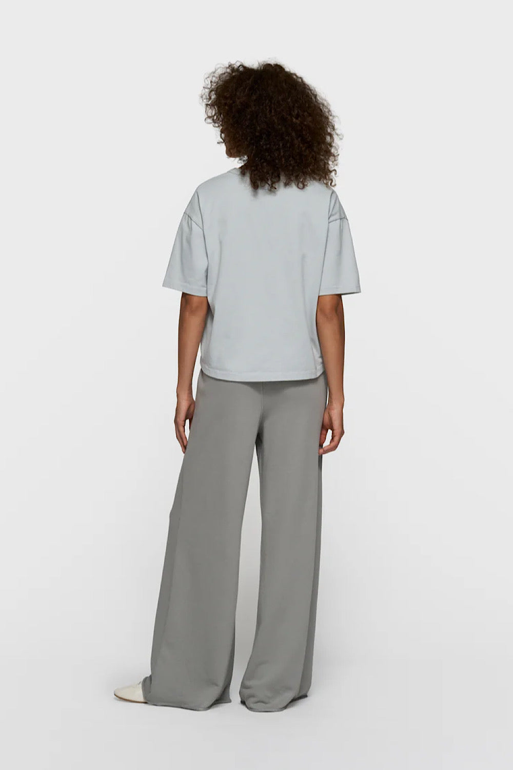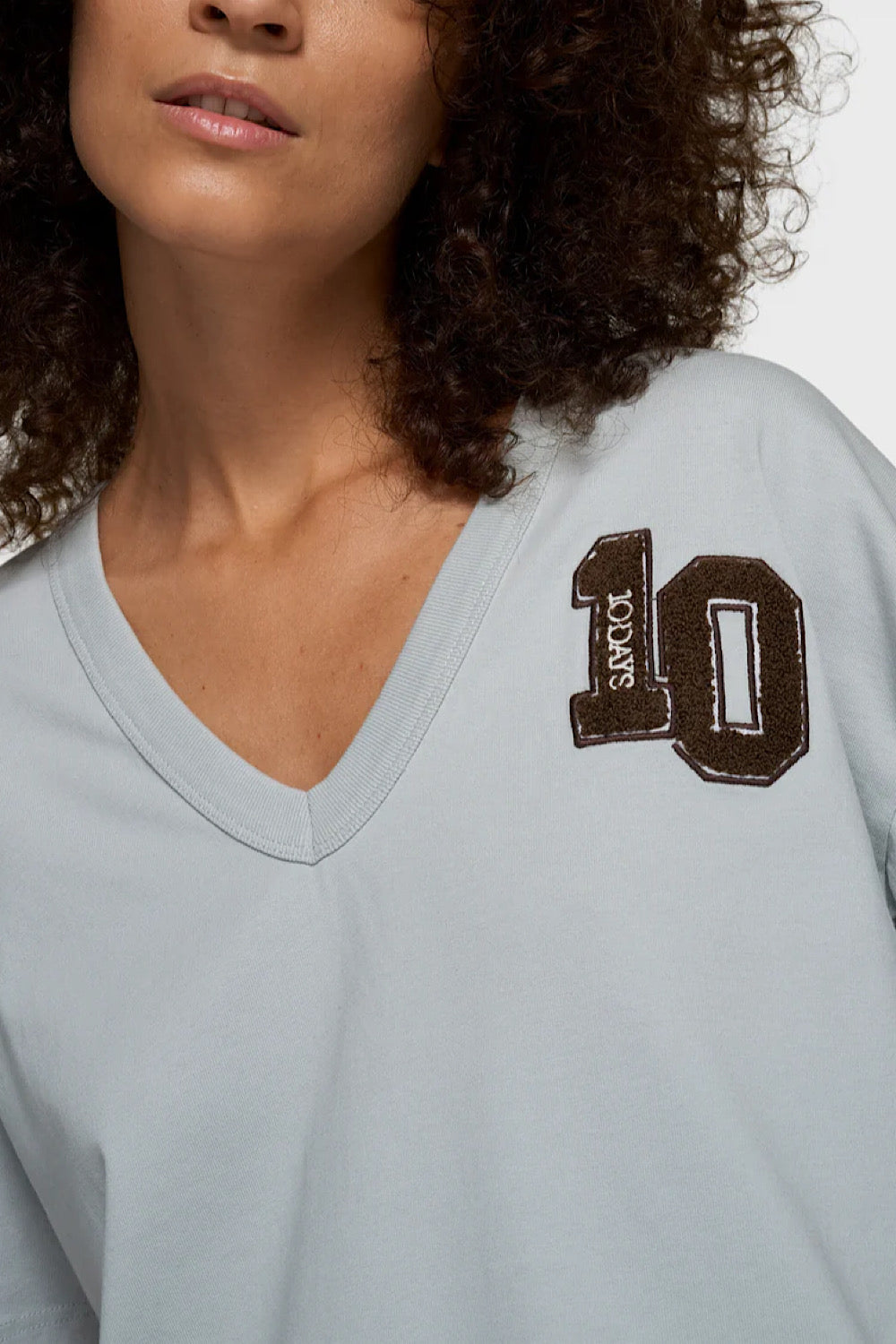 Camiseta con escote de pico en un tono gris azulado súper bonita, con detalle de logo en color chocolate, un contraste muy especial.