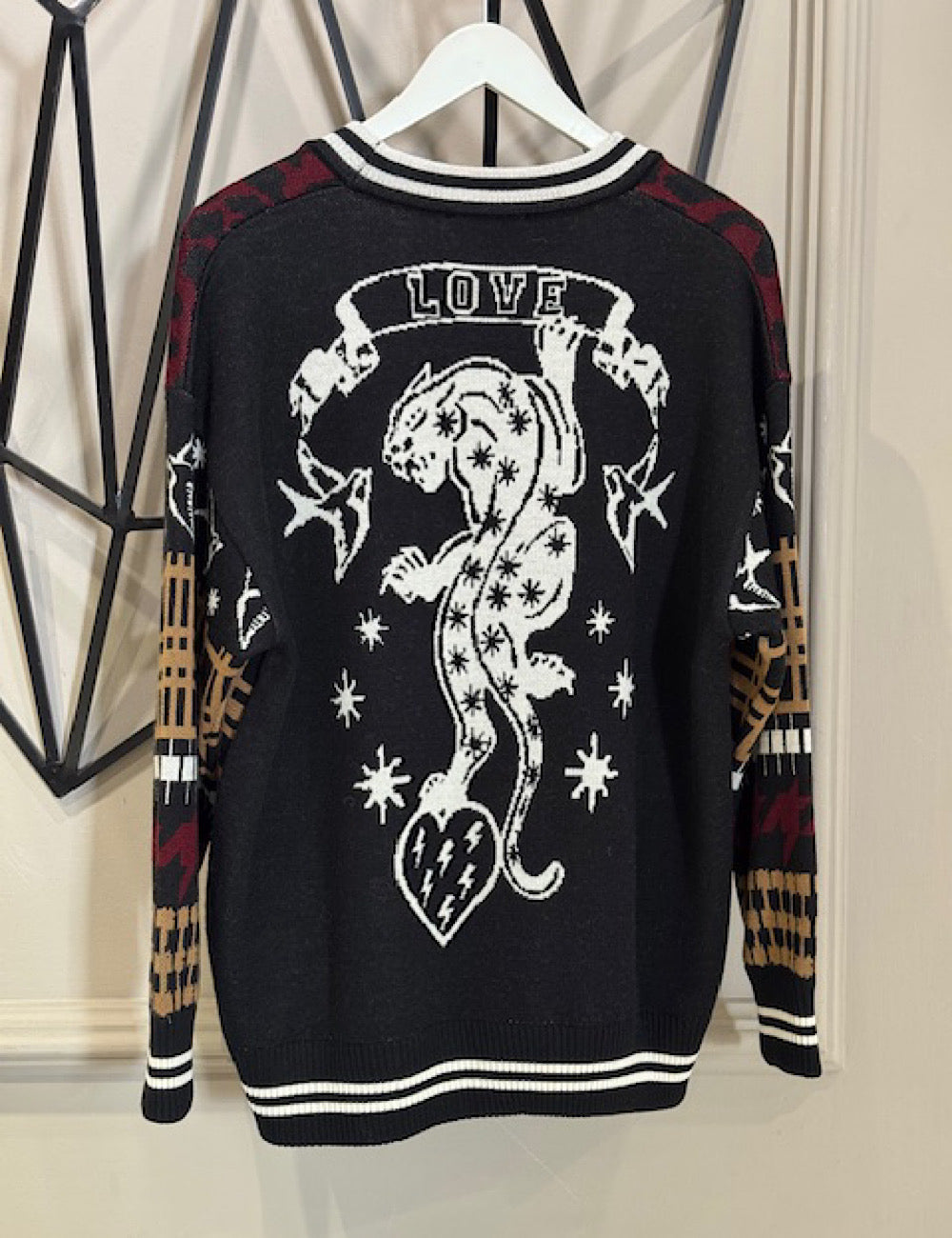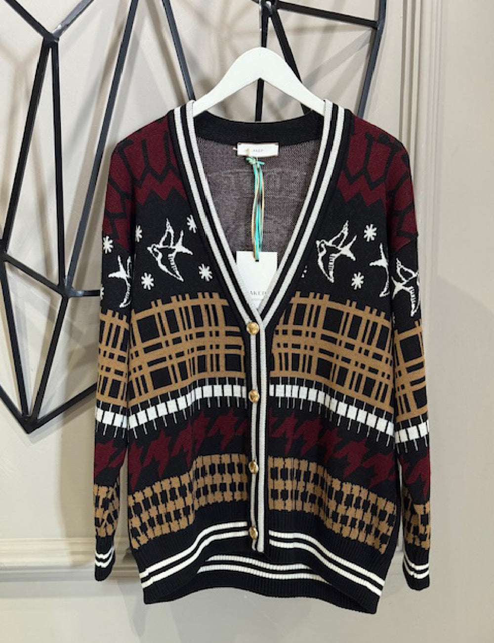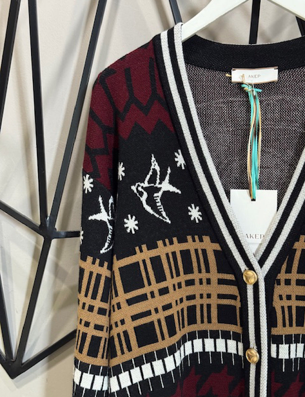 Una cárdigan con un punto muy especial, largo y diferente estampado en la parte trasera y delantera, lo que le da un toque diferente.