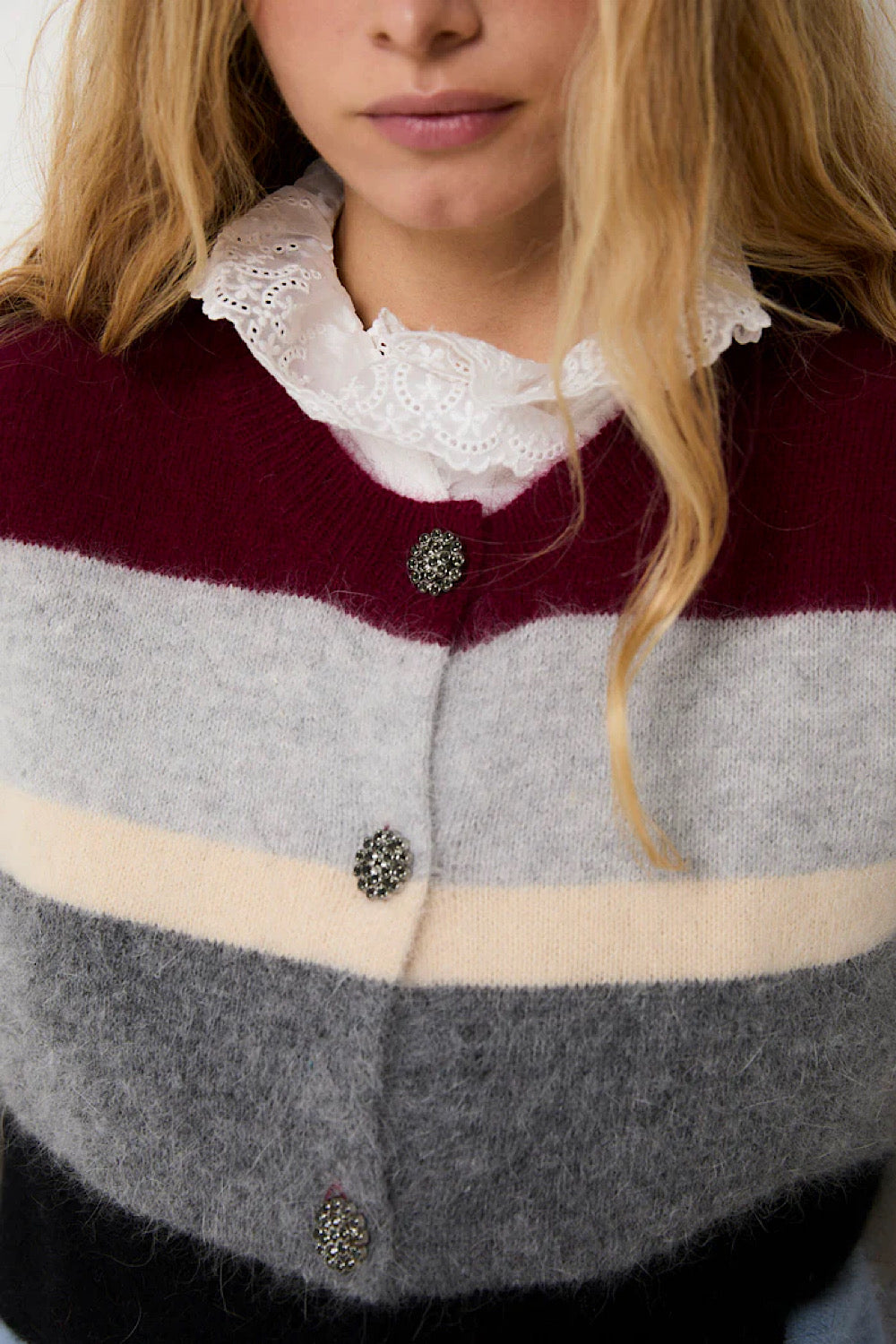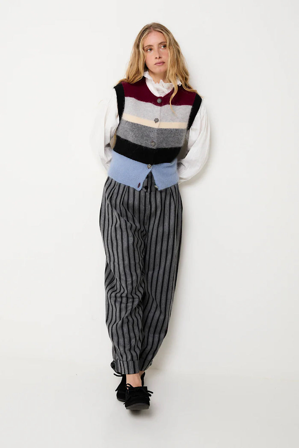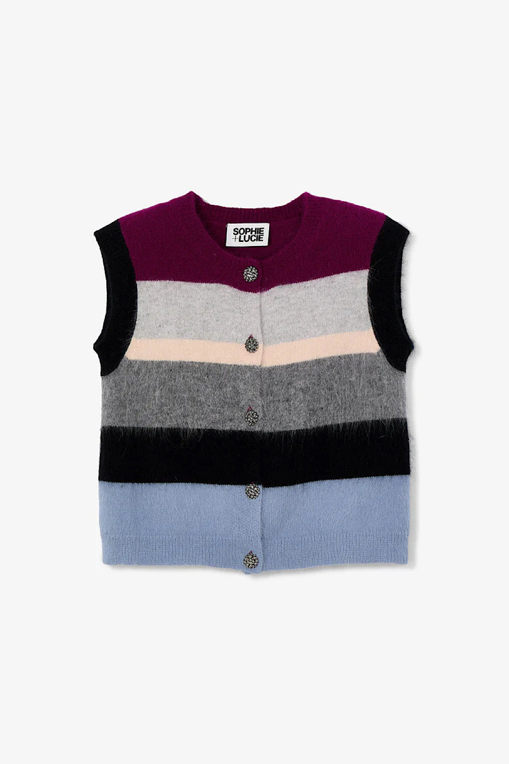 Chaleco de punto, que ya es un clásico en la colección de Sophie and Lucie, en estampado de rayas multicolor muy especial. El diseño se completa con botones joya.