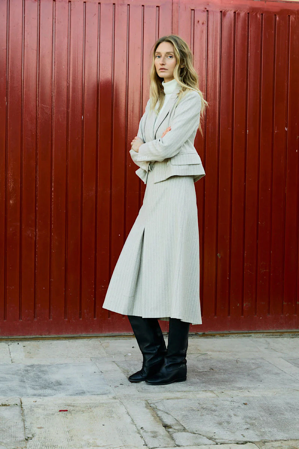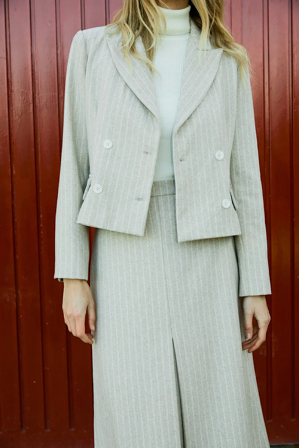 Chaqueta corta entallada de doble botonadura y raya diplomática. Una prenda muy especial de Magnolya. Si quieres un total look muy especial elige también la falda Ivet.