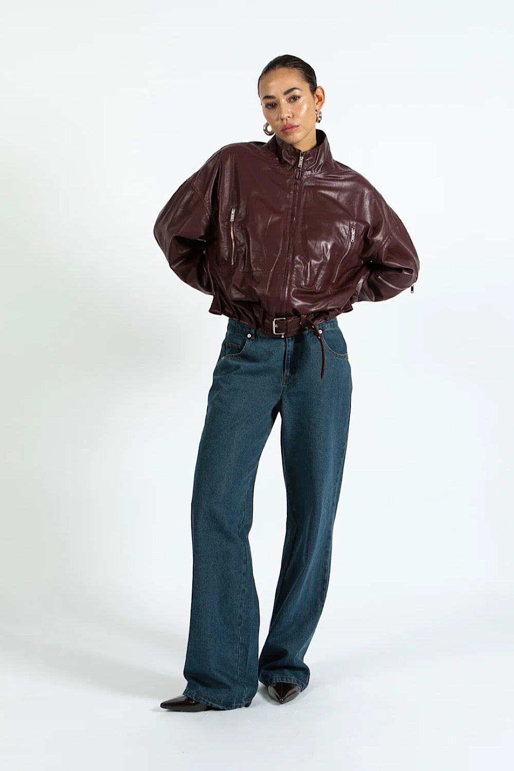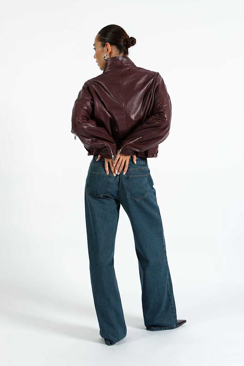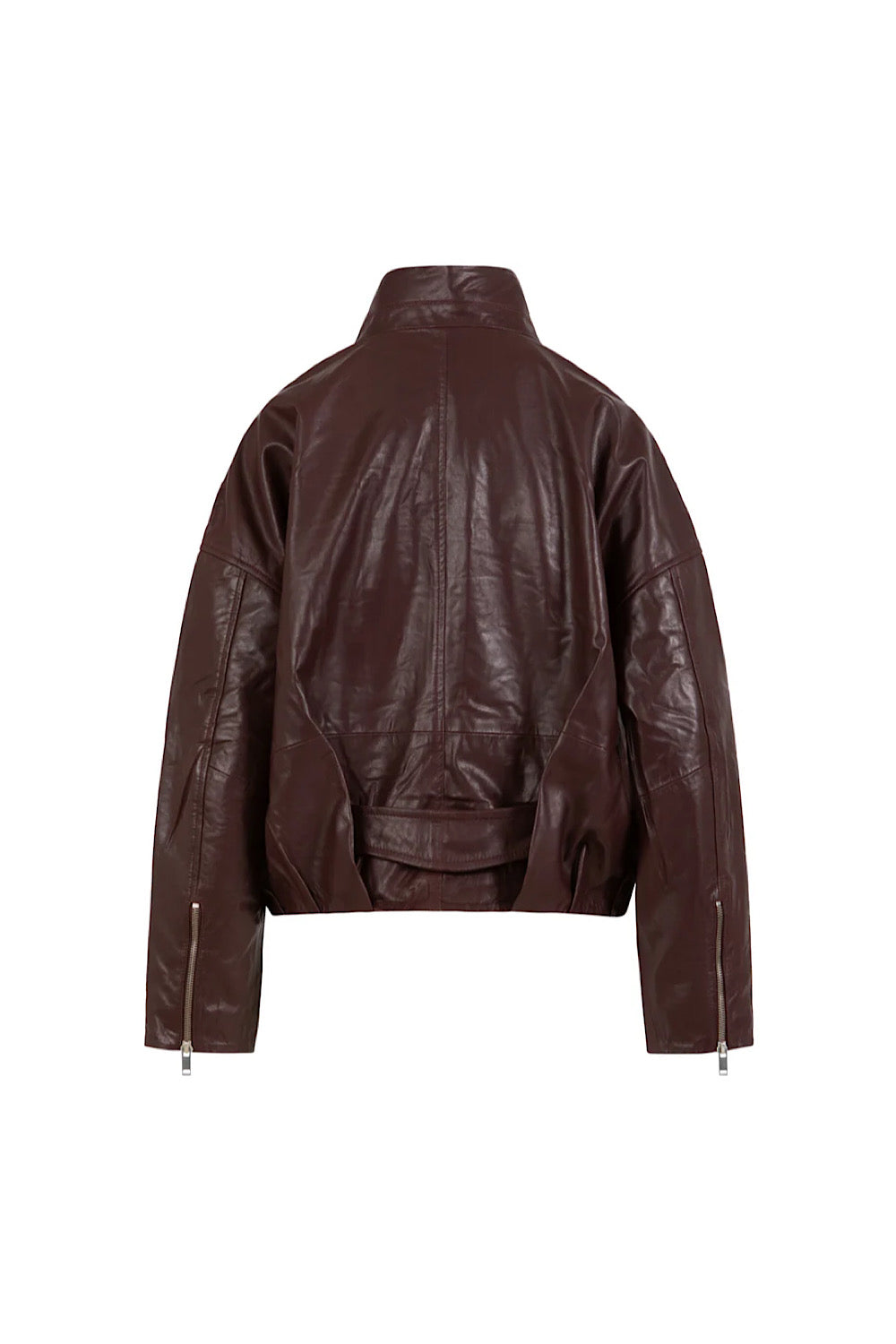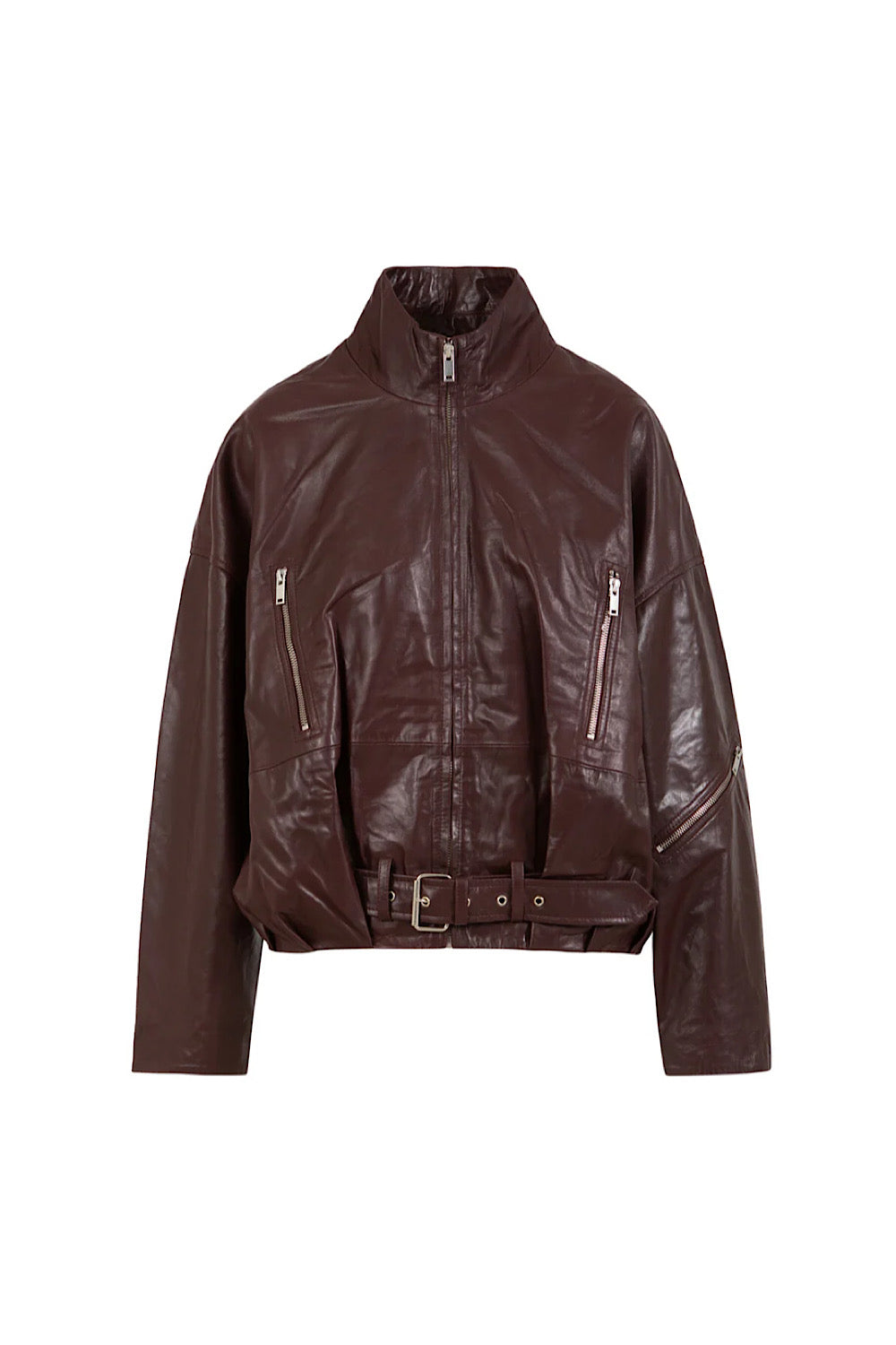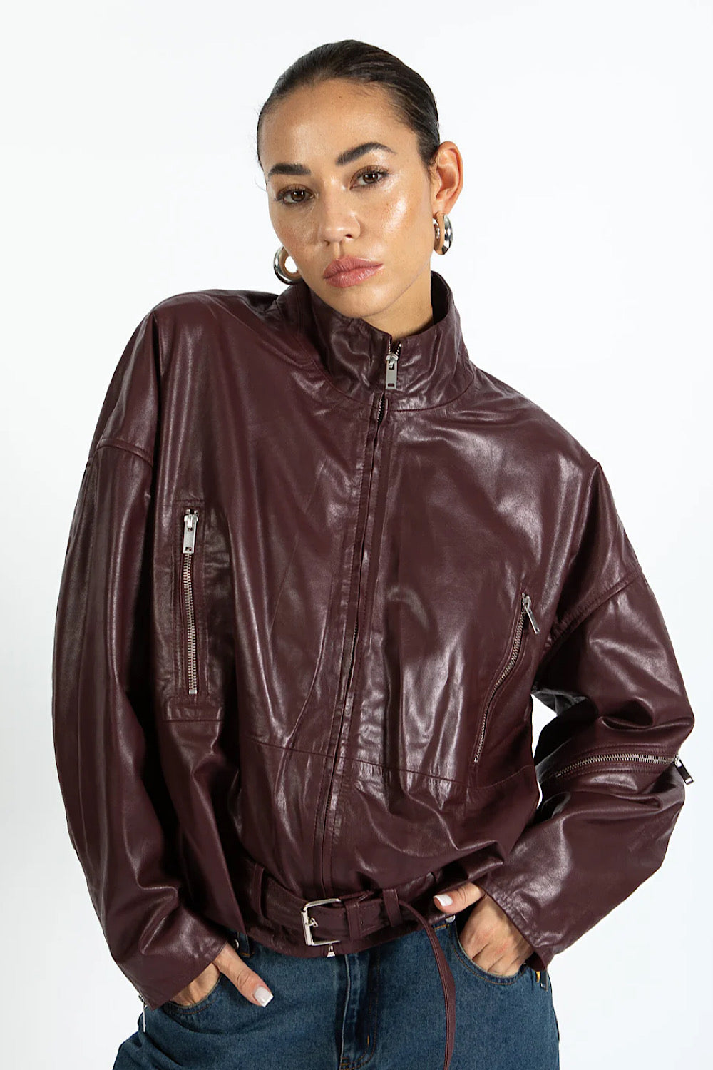 Chaqueta de piel en color burdeos, con una forma que está entre la clásica perfecto y una bomba, una prenda muy especial que tendrás en tu armario para toda la vida. Detalle de cremalleras y cierre con hebilla en la parte inferior.