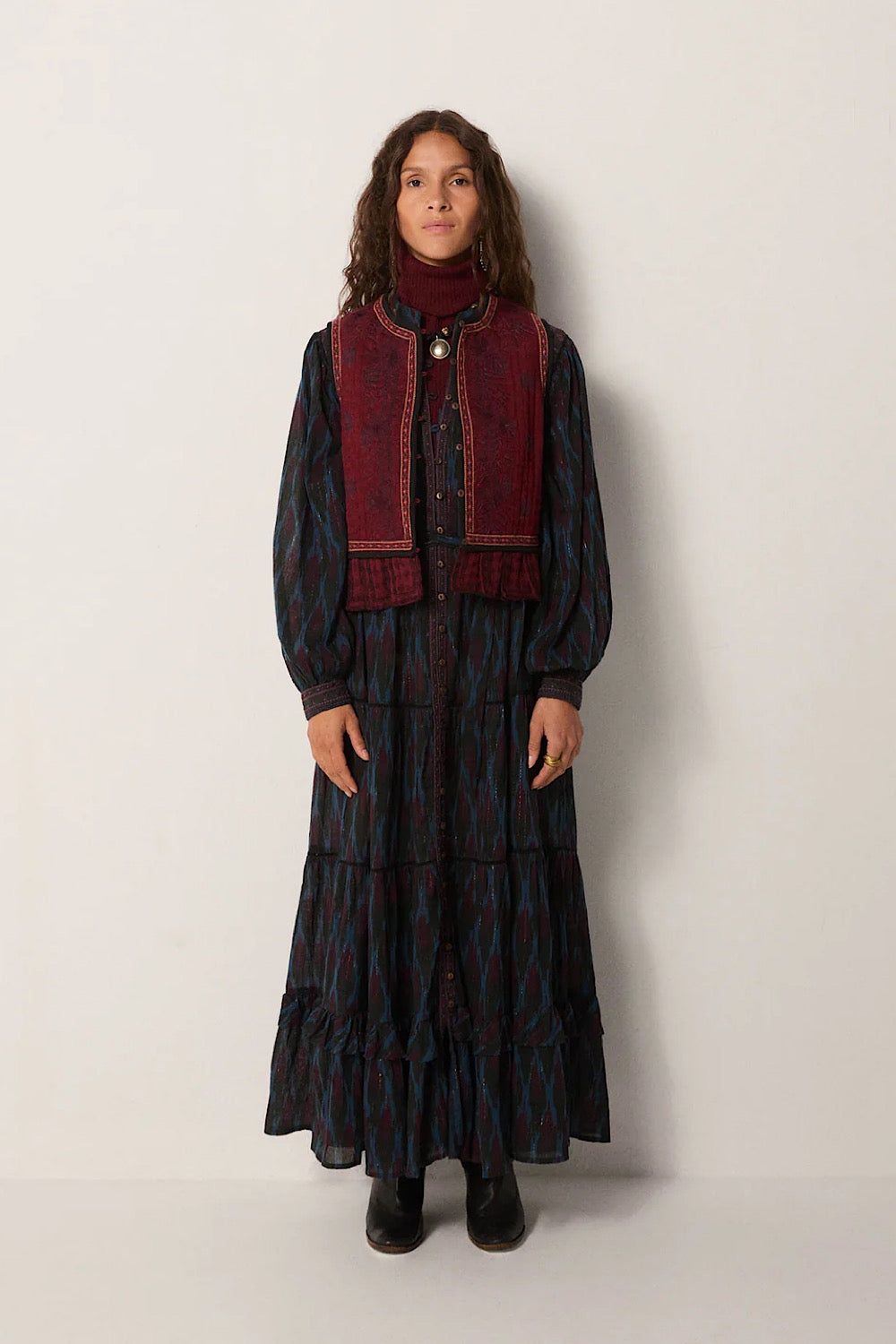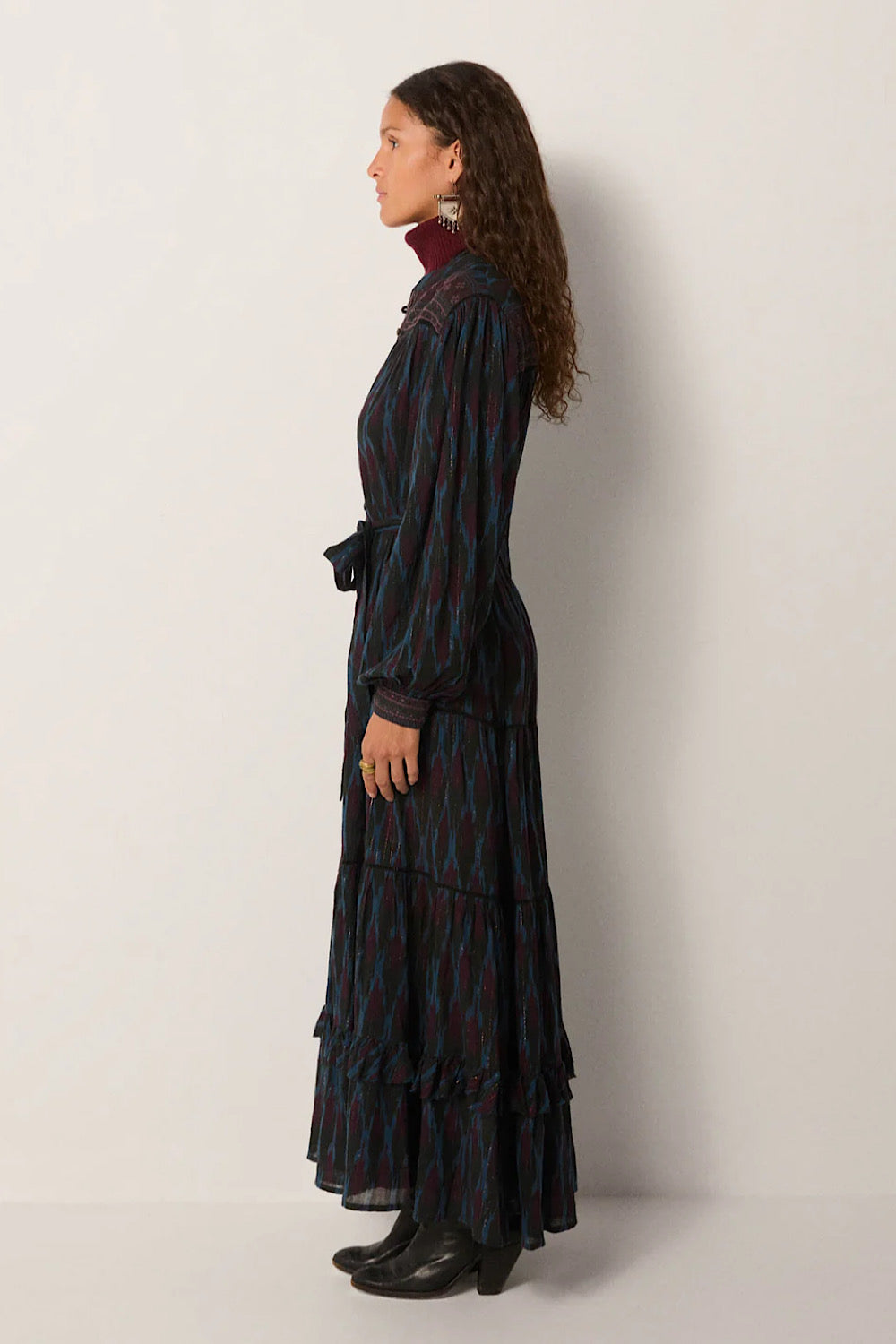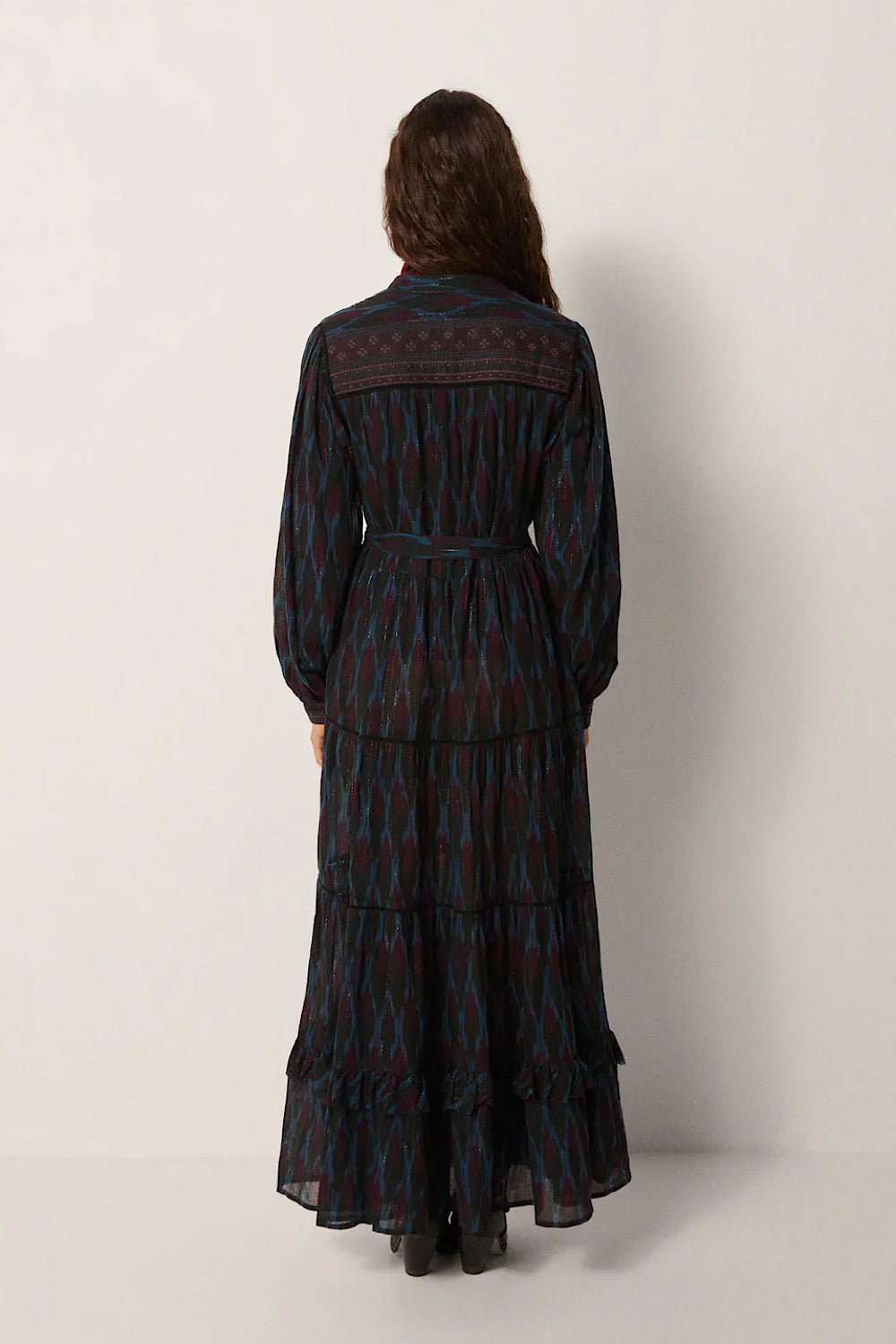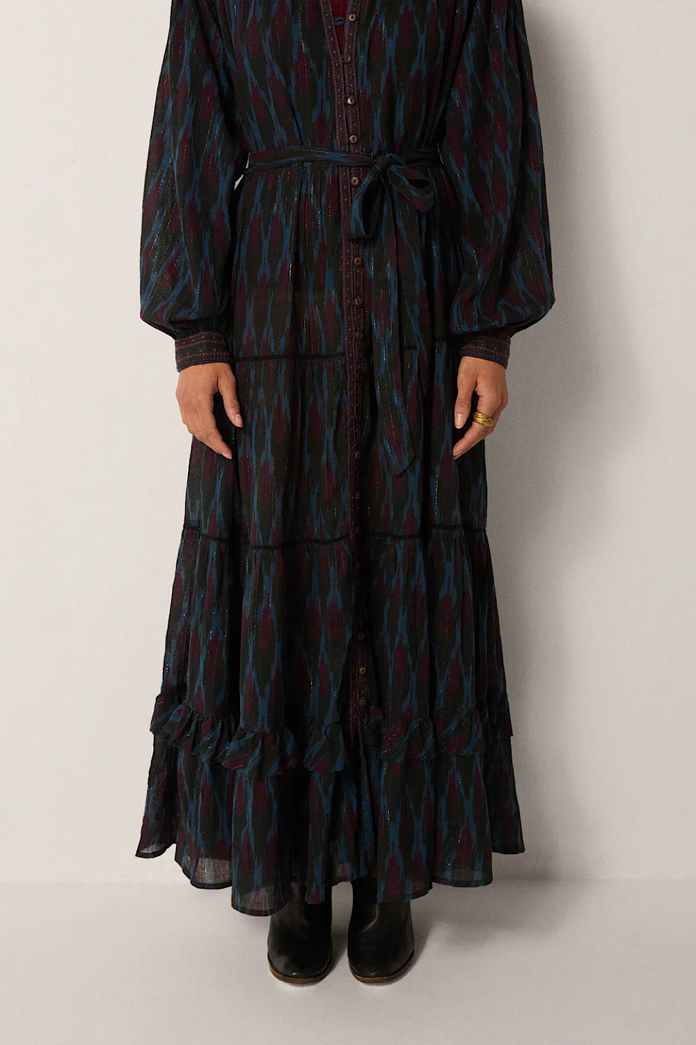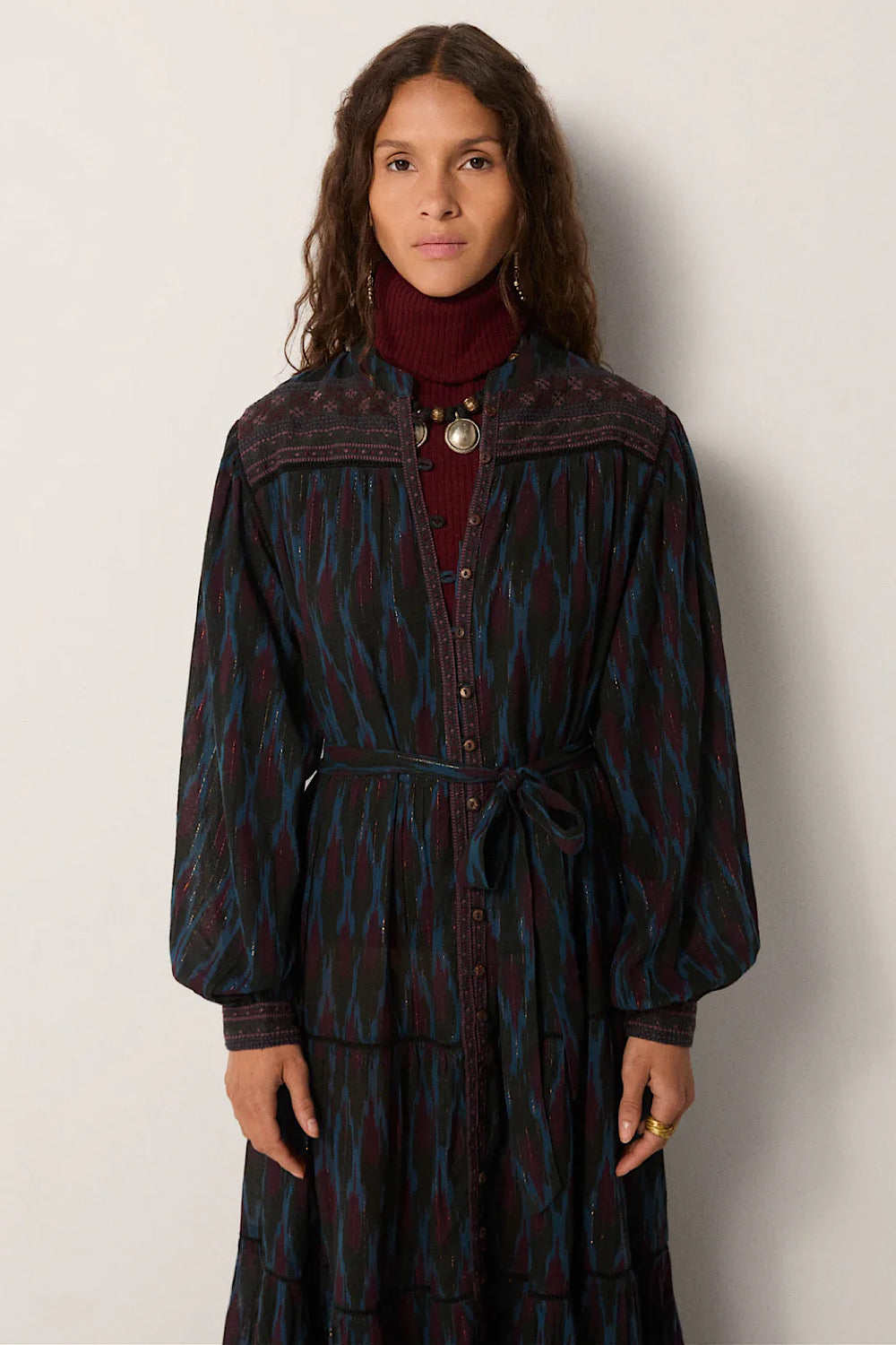 Un vestido muy especial, en tejido de algodón con detalle de hilos de lúrex para darle un toque diferente. Tipo camisero y cinturón en el mismo tejido.
