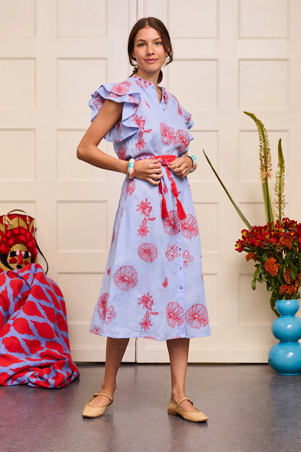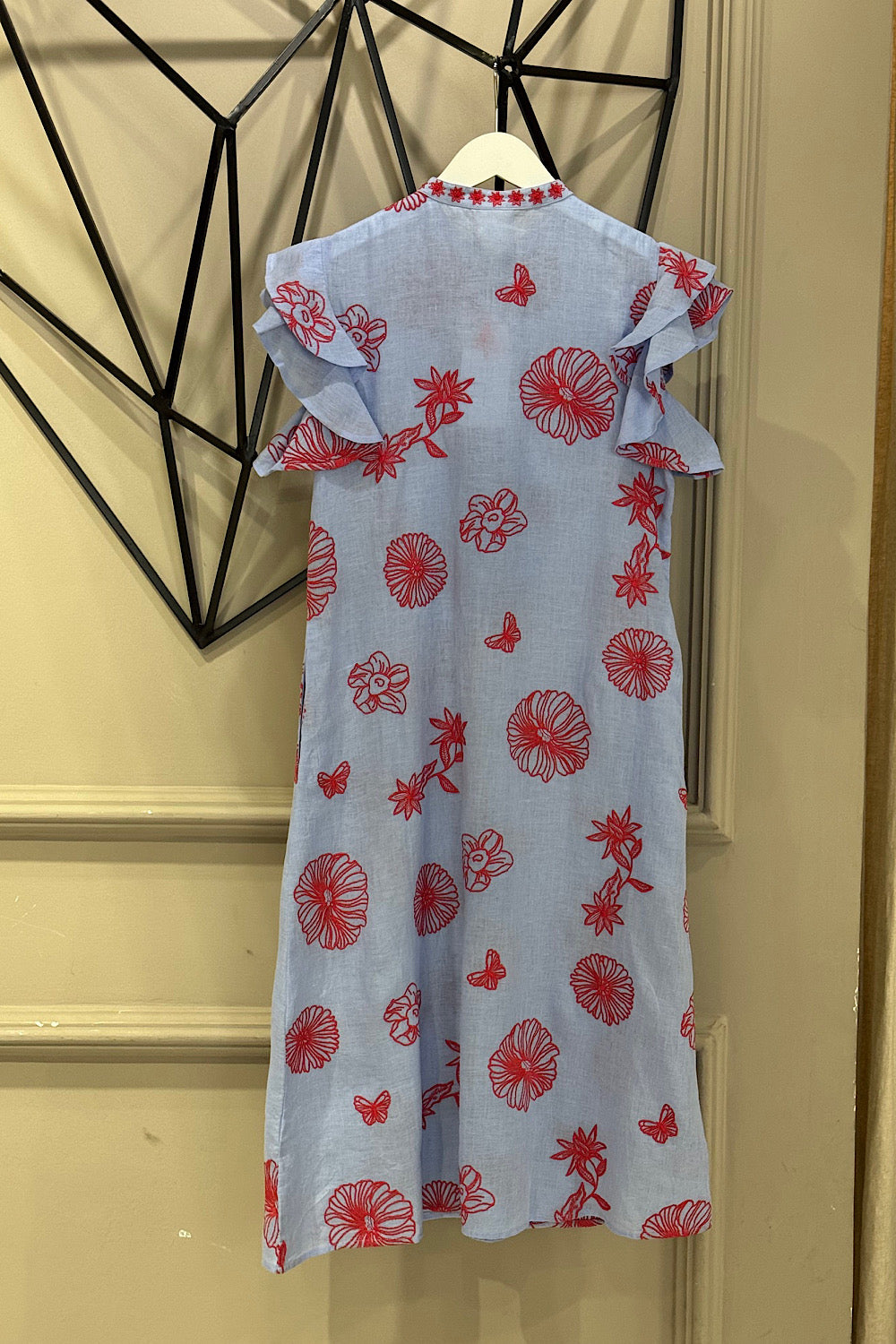 Vestido tipo camisero con detalle de volantes en las mangas que favorece muchísimo. Una prenda cómoda pero con mucho estilo para tus días de verano. Los bordados florales a contraste en rojo le dan un toque muy especial y diferente. Acapararás todas las miradas.