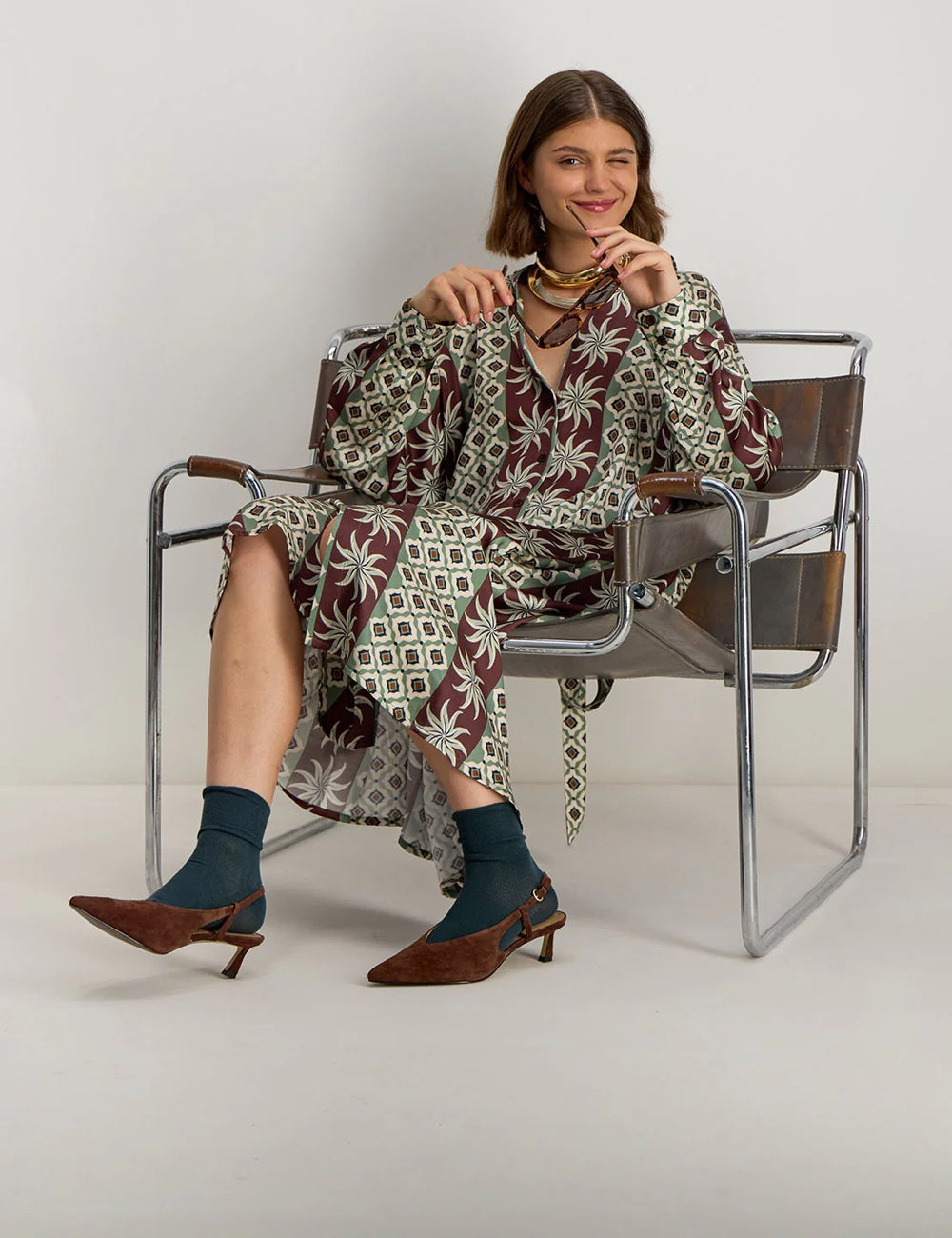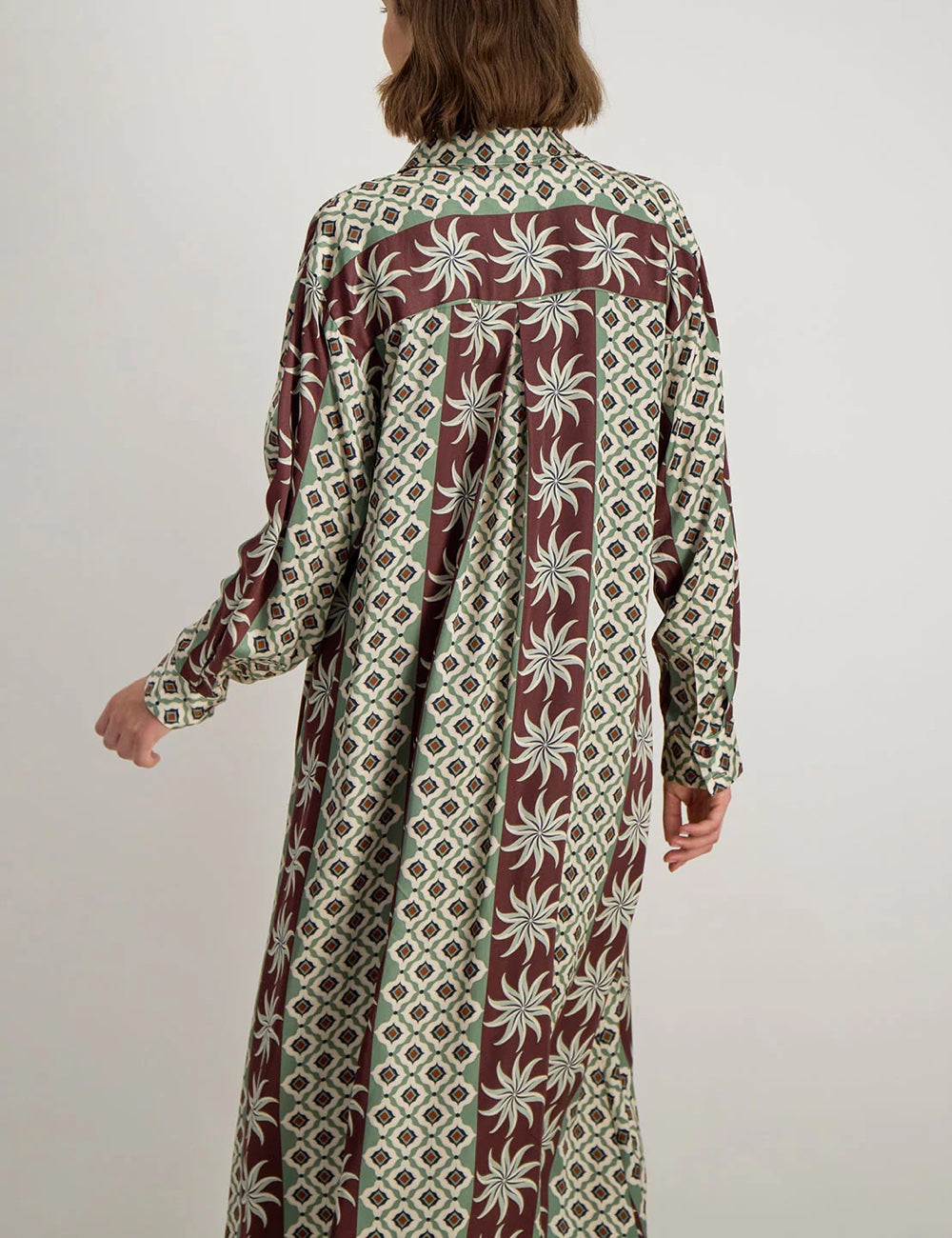 Vestido camisero con detalle de cinturón en el mismo tejido para ajustar a la cintura o llevarlo suelto, tú eliges. Tiene un estampado muy favorecedor y urbano para el día a día.