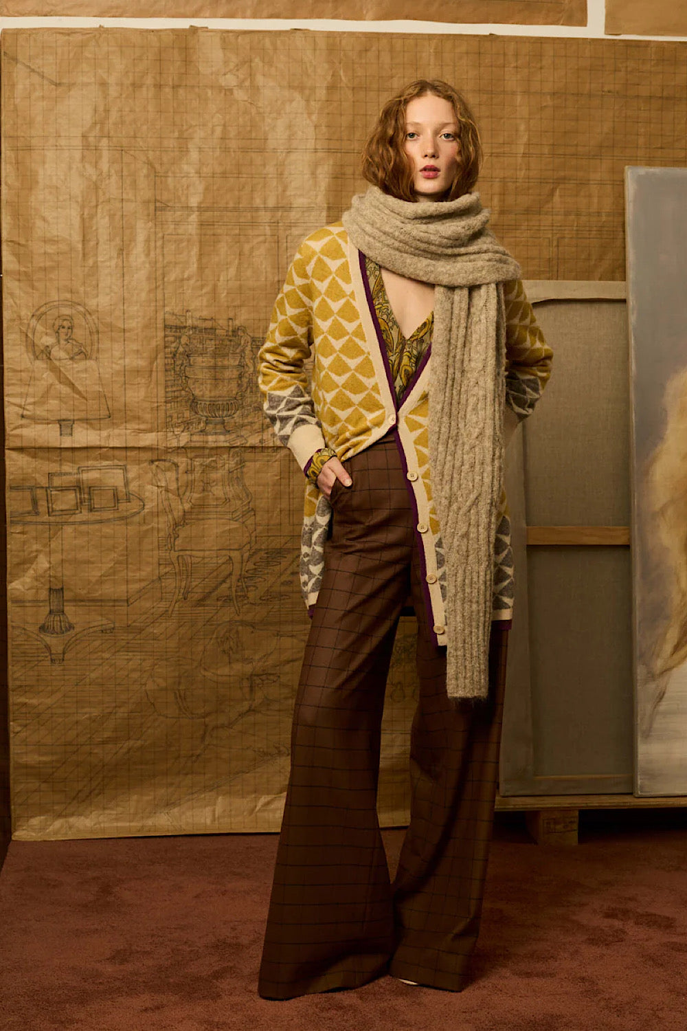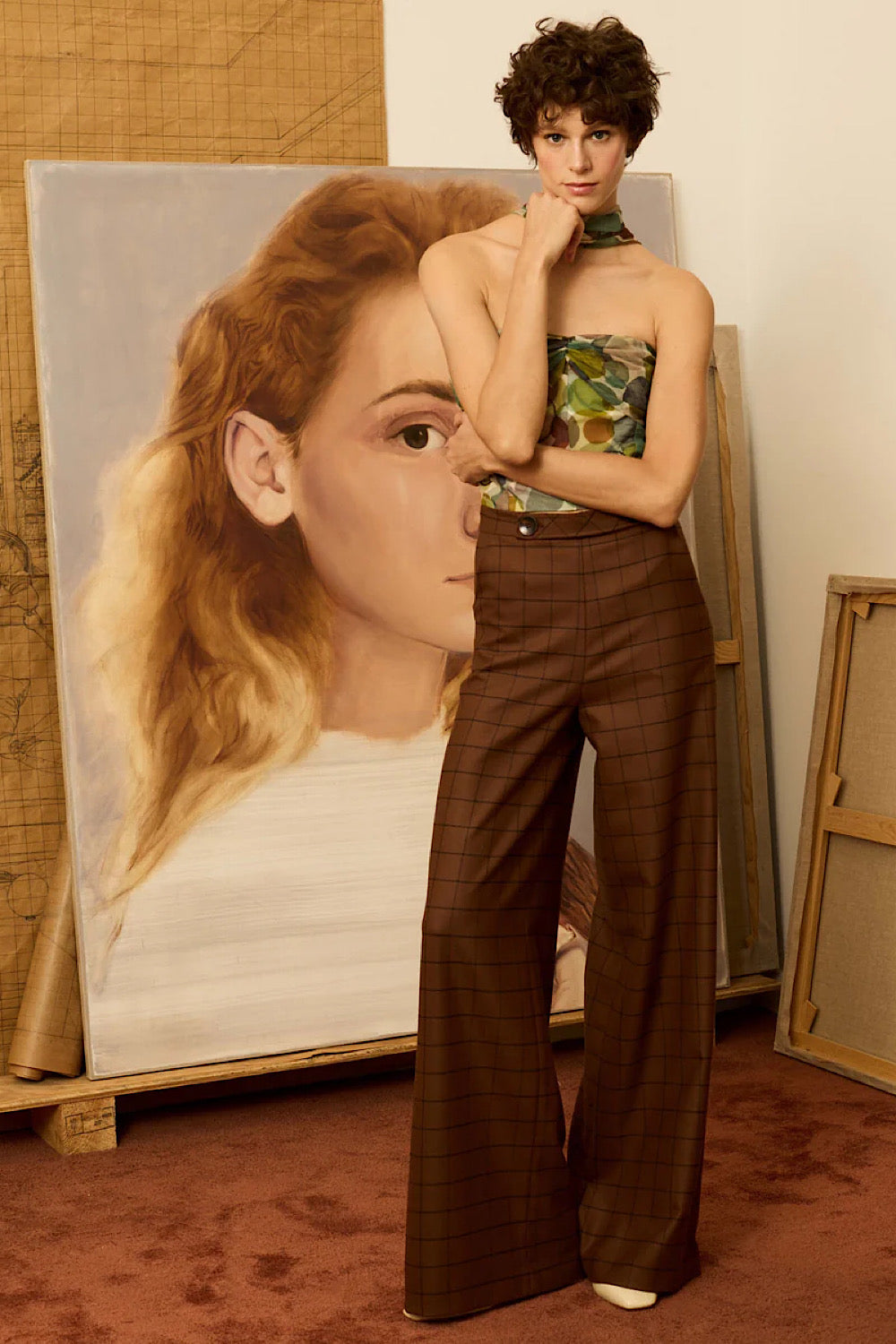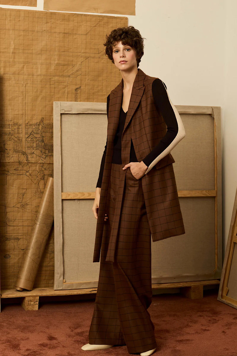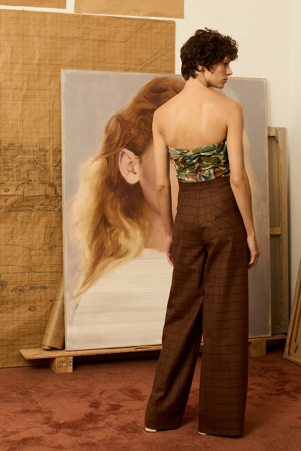 Pantalón palazzo de talle alto marrón y cuadros a contraste en negro, muy elegante y atemporal. Detalle de botones en cintura.