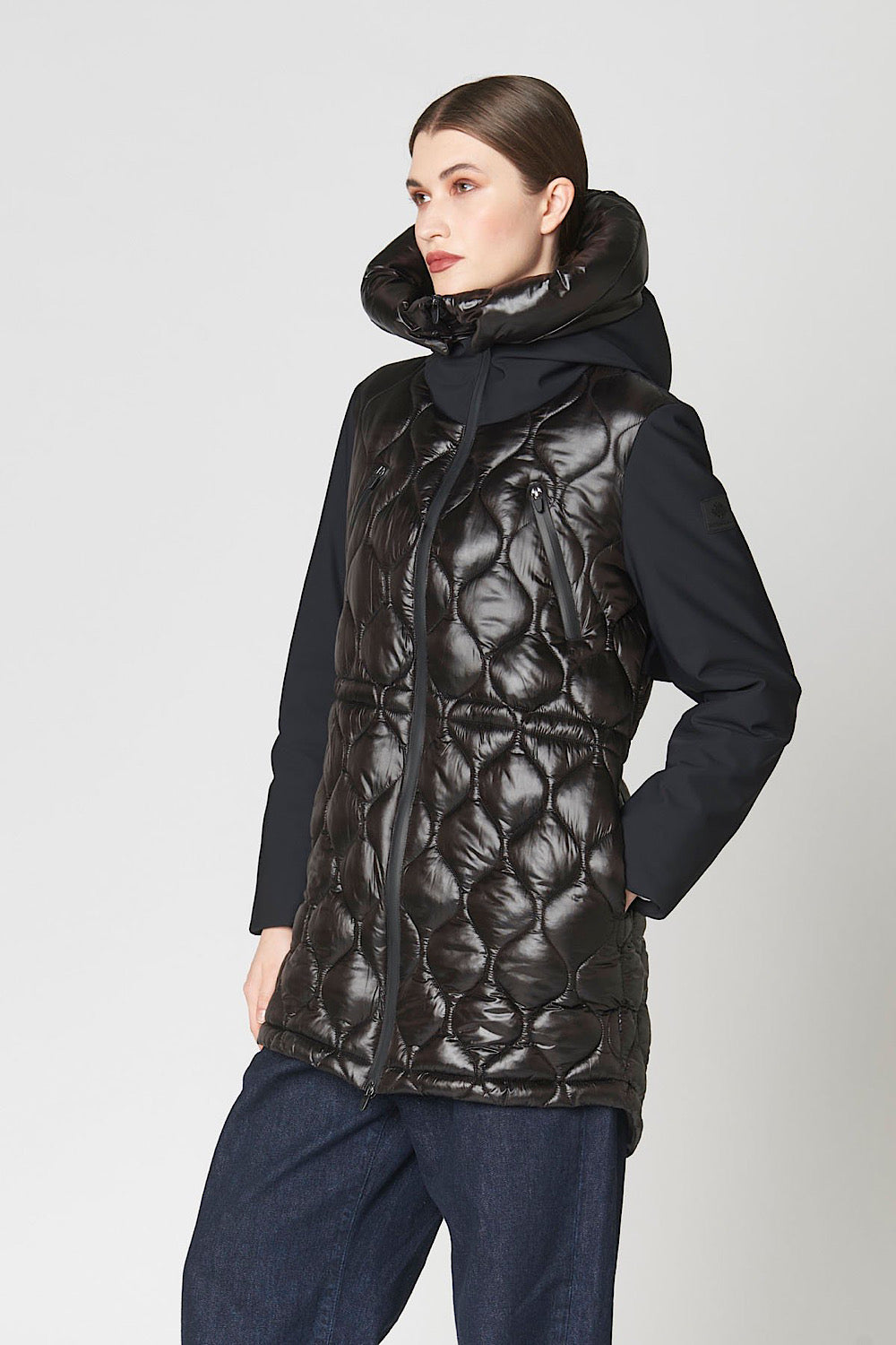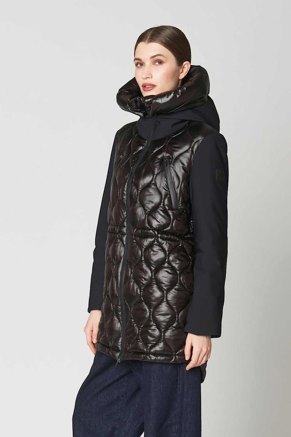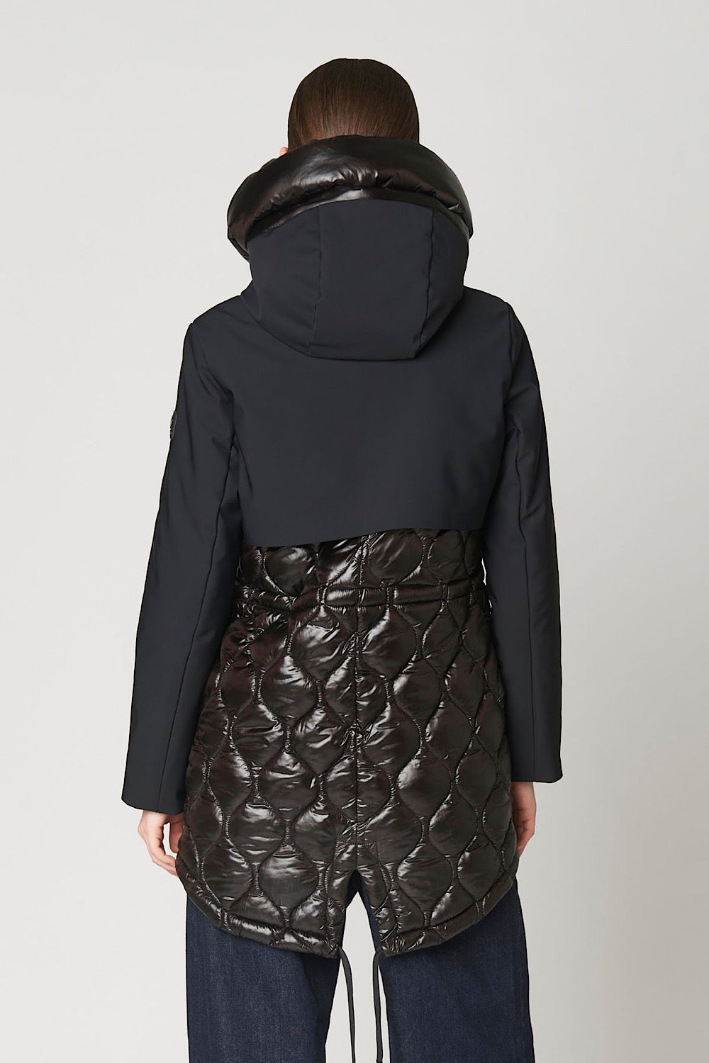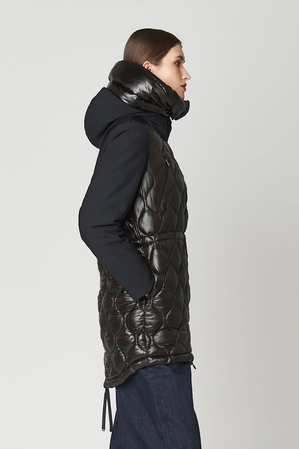 Una prenda muy especial, efecto chaleco acolchado y detalle de tejido combinado en mangas, cuello y parte trasera, que es tejido técnico impermeable.