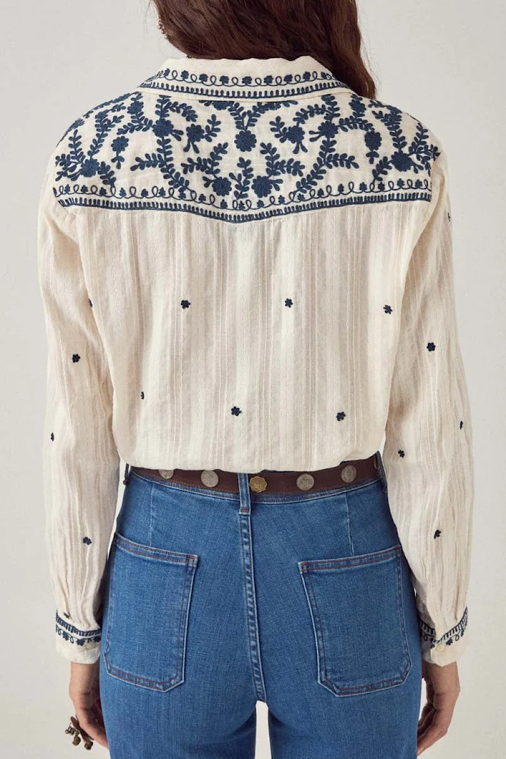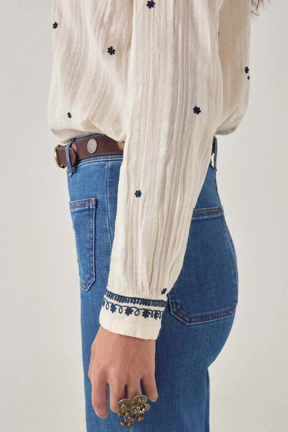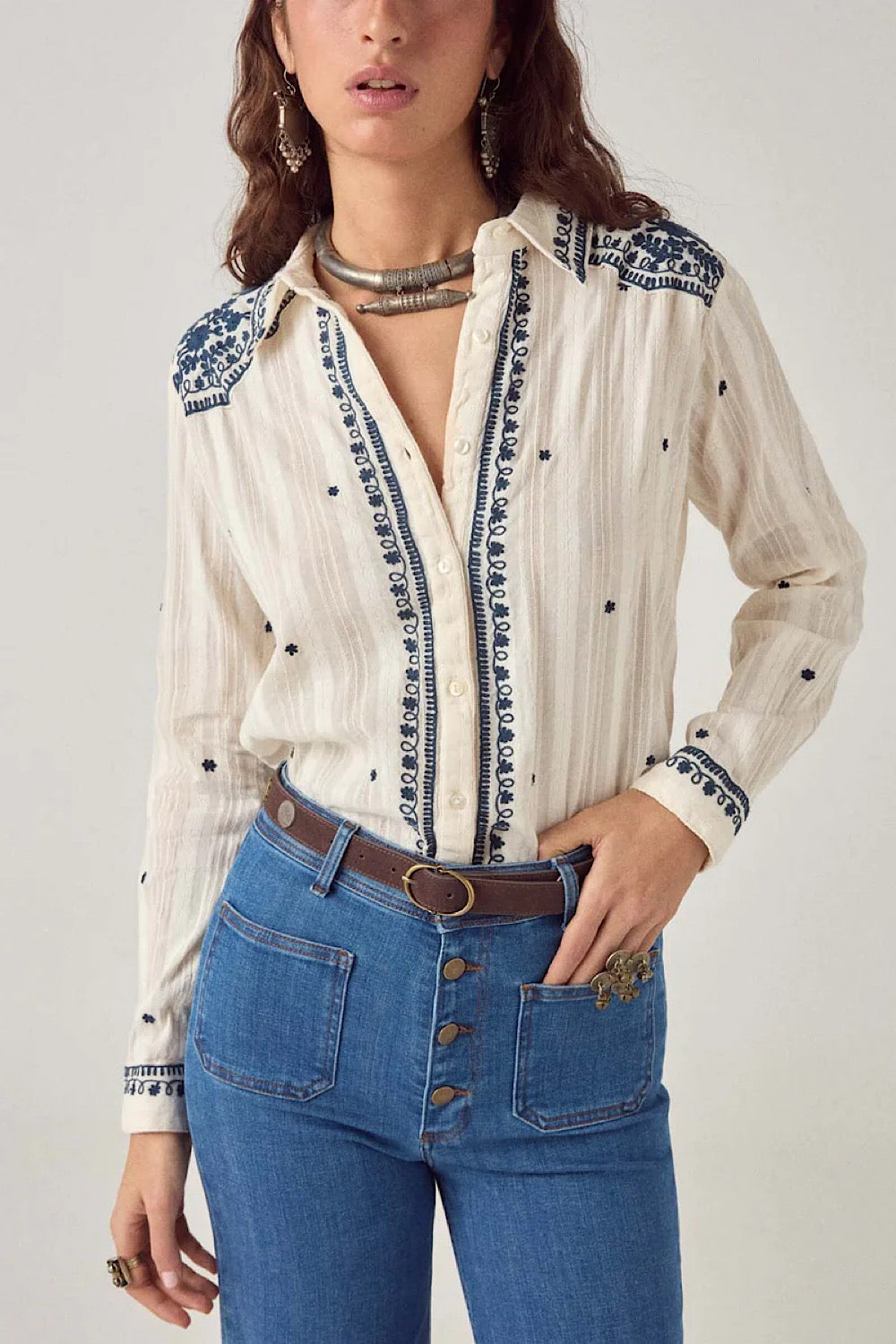 Una camisa de las que más nos encantan de Maison Hotel, 100% de algodón con detalle de bordado a contraste en un azul índigo que además de elegante favorece mucho.