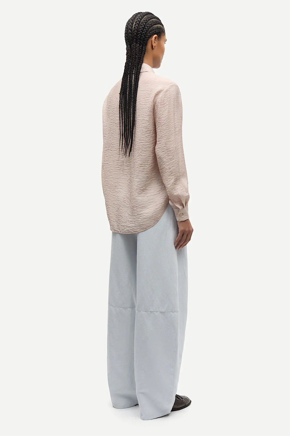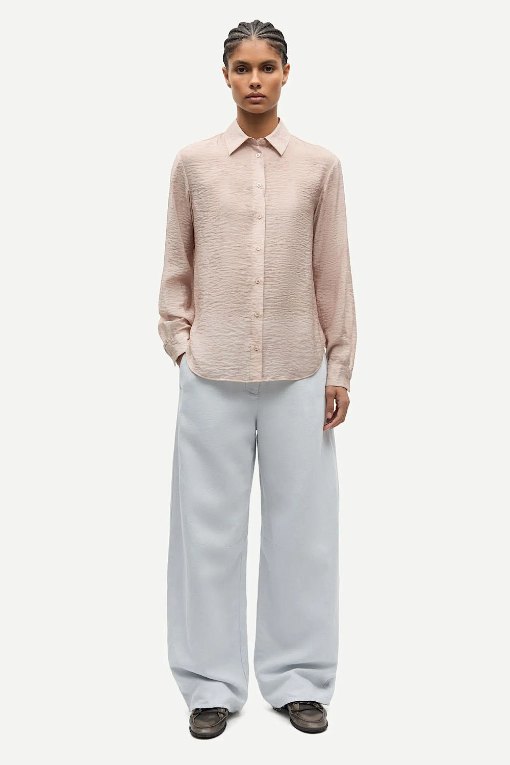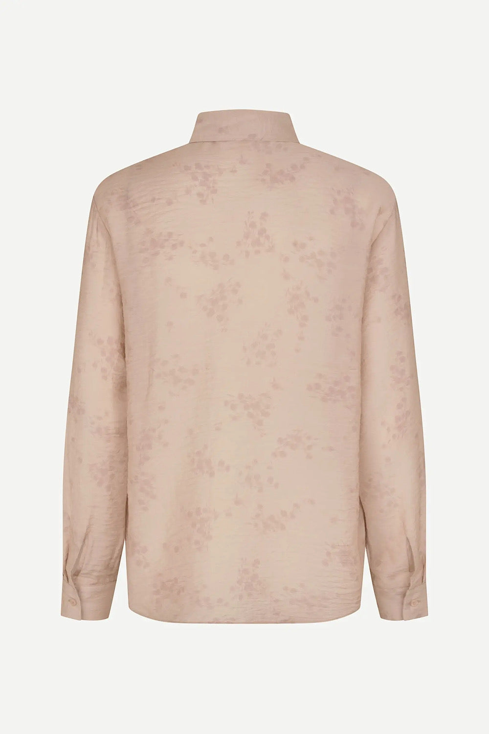 Una camisa muy especial, con detalle de textura en el tejido y pequeños dibujos florales en el mismo tono que le da un toque muy elegante y con estilo a la prenda. Combinación de tejido tencel y seda.