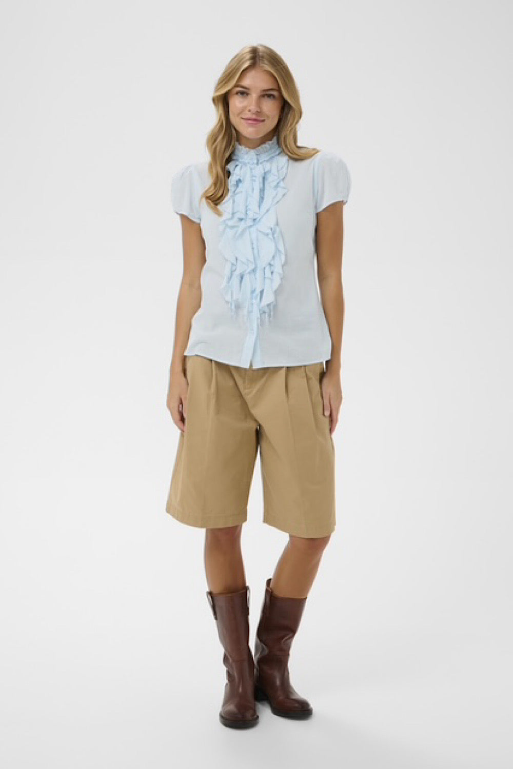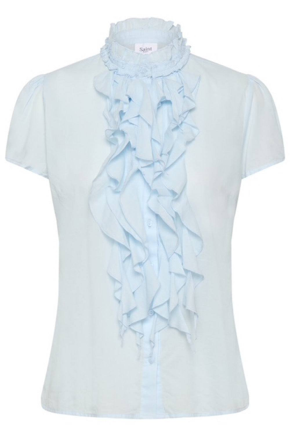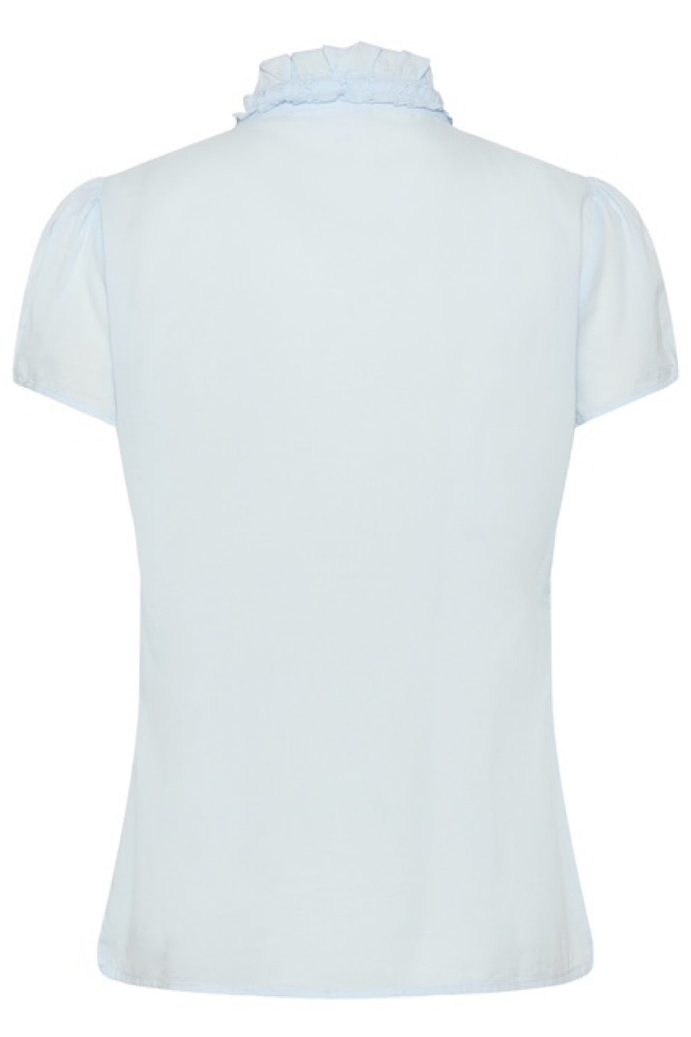 Una de vuestras blusas favoritas, en un tejido 100% de algodón. Detalle de volantes en la parte frontal y un color azul claro que nos encanta para combinar con nuestros jeans favoritos.