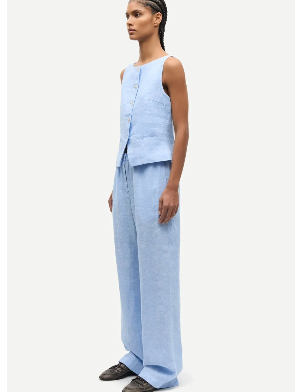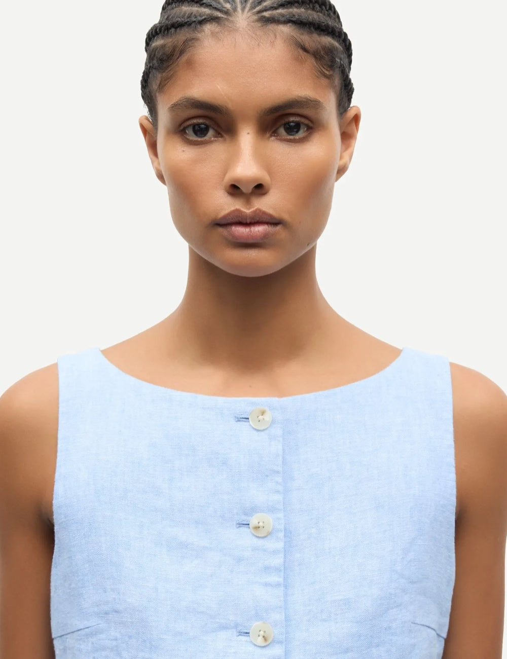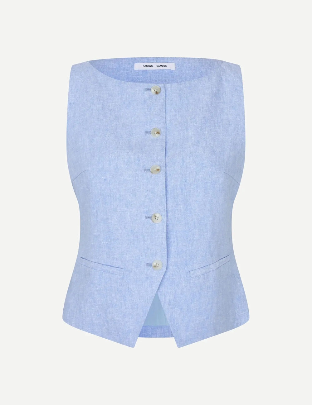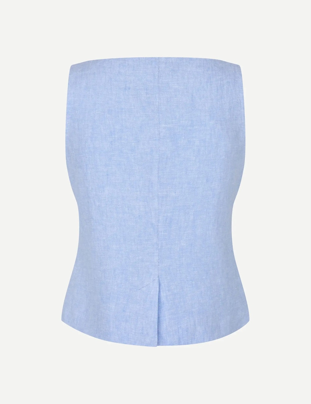 Un chaleco ideal con detalle de botones frontales, en tejido tipo oxford. Queda genial con los pantalones Satove. Puedes llevar un básico debajo o directamente el chaleco.