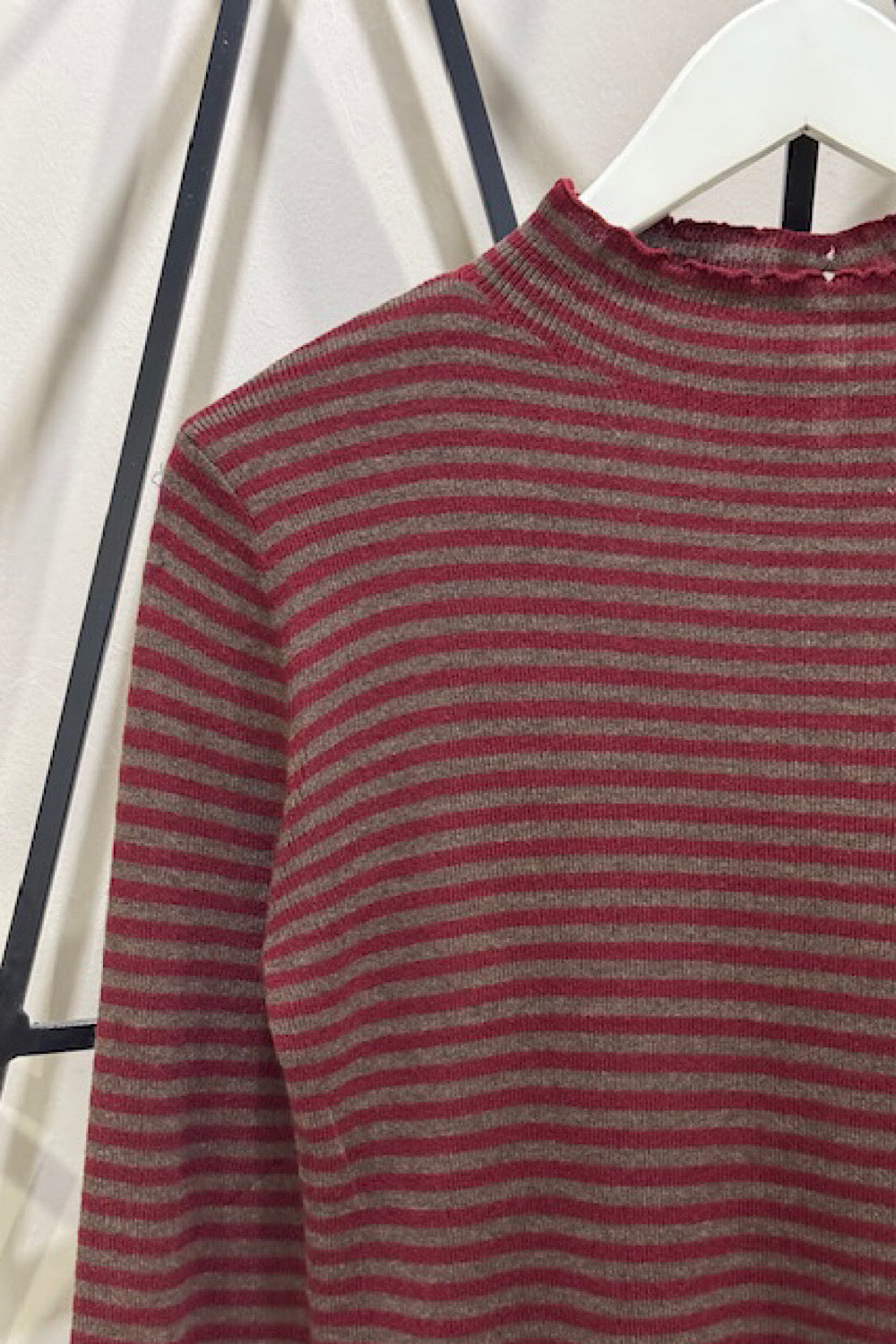 Jersey fino de punto a rayas verde kaki y burdeos. Cuello ligeramente subido y detalle de botón en la parte trasera. Un básico para usar sin parar.