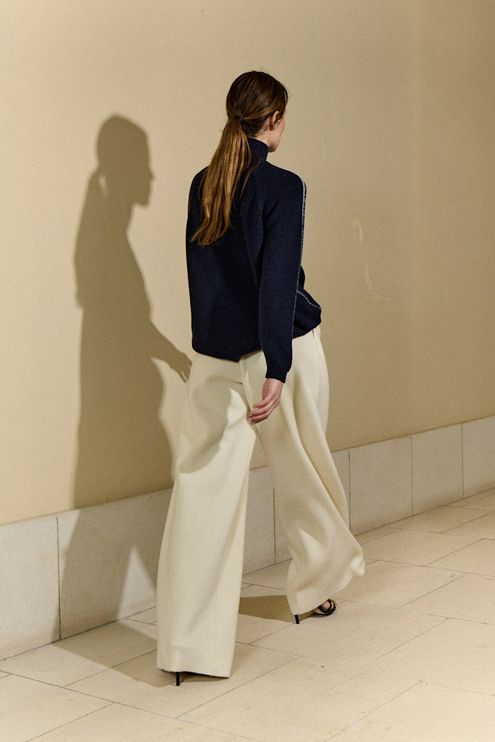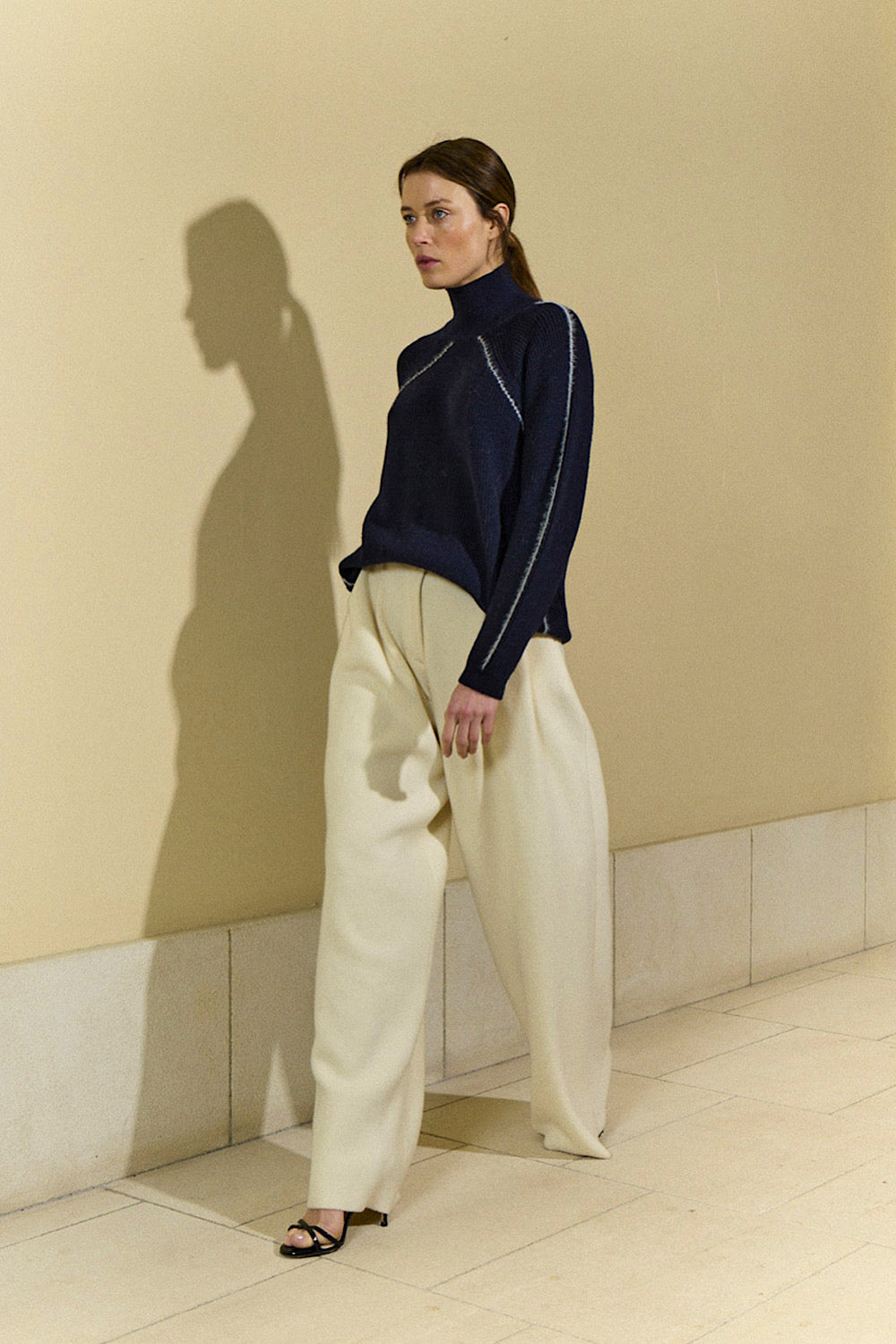 Jersey oversize de punto perla con cuello alto en color azul marino y detalle de líneas posicionadas a contraste en color blanco. Una prenda de punto muy especial, con un 70% de lana.